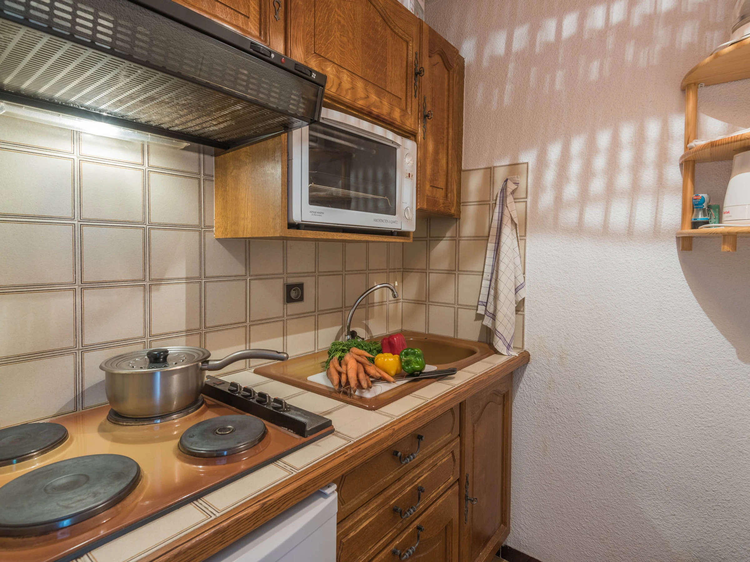COIN CUISINE: 4 plaques électriques, réfrigérateur et mini-four, cafetière électrique à filtre, bouilloire, grille pain, appareil à fondue.