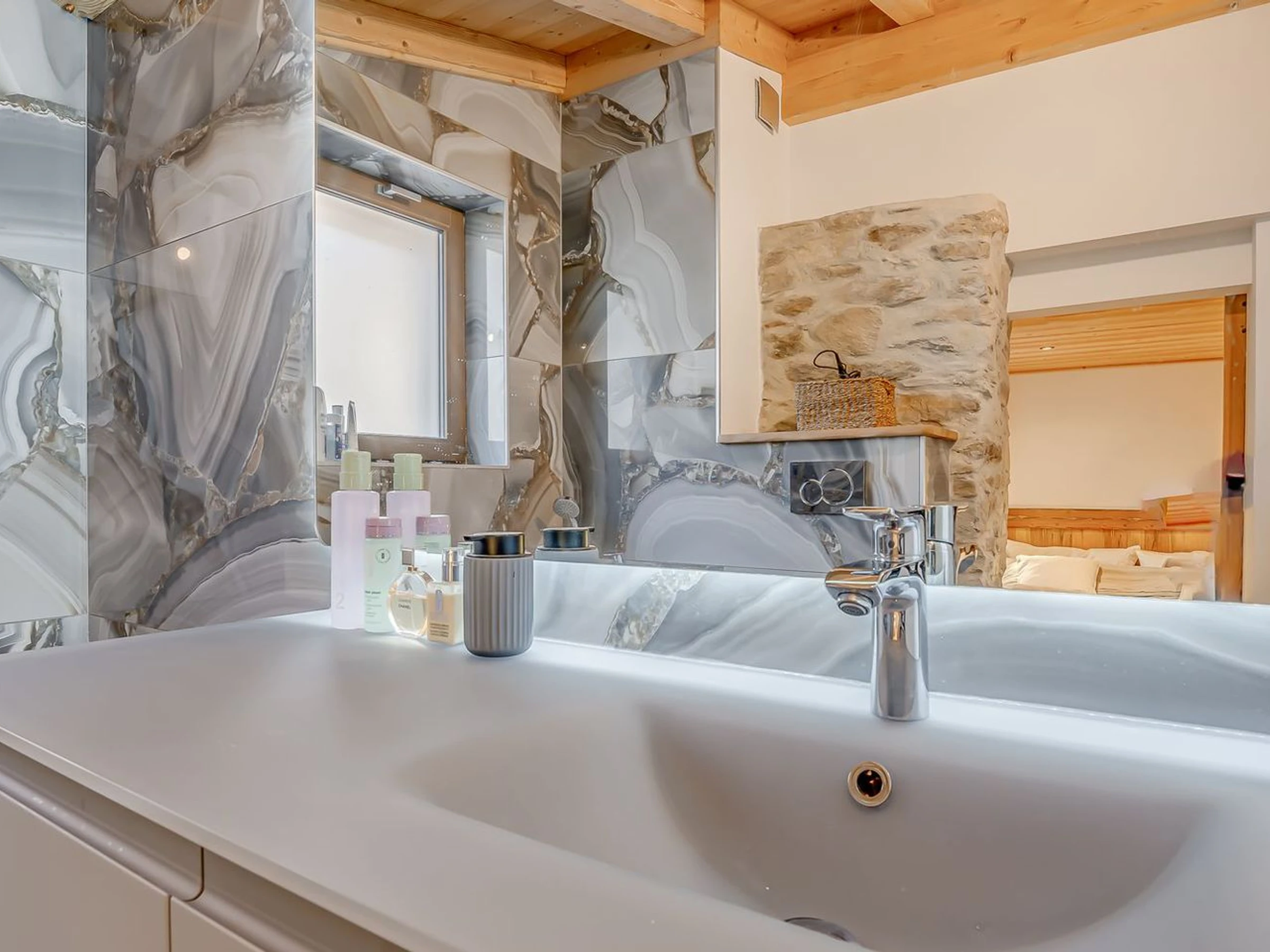 - Construite en pierres du pays, les murs traditionnels restaurés apparaissent partout dans les pièces et coursives intérieures ; ils rappellent le passé de la maison magnifié, son histoire savoyarde intime, la force de la nature alpine au coeur de laquelle la maison protégeait les familles, les animaux, les vivres et les récoltes de la terre.