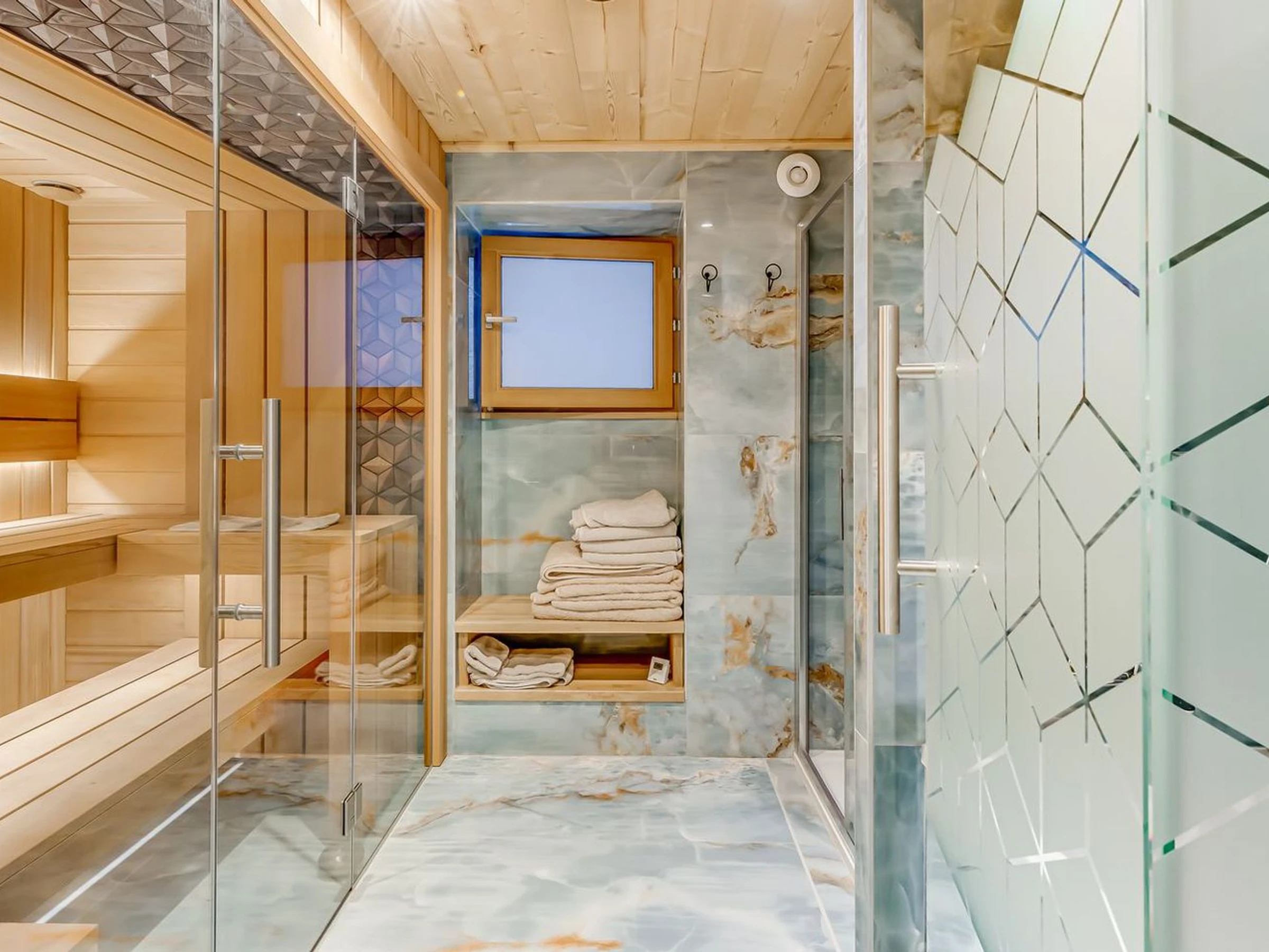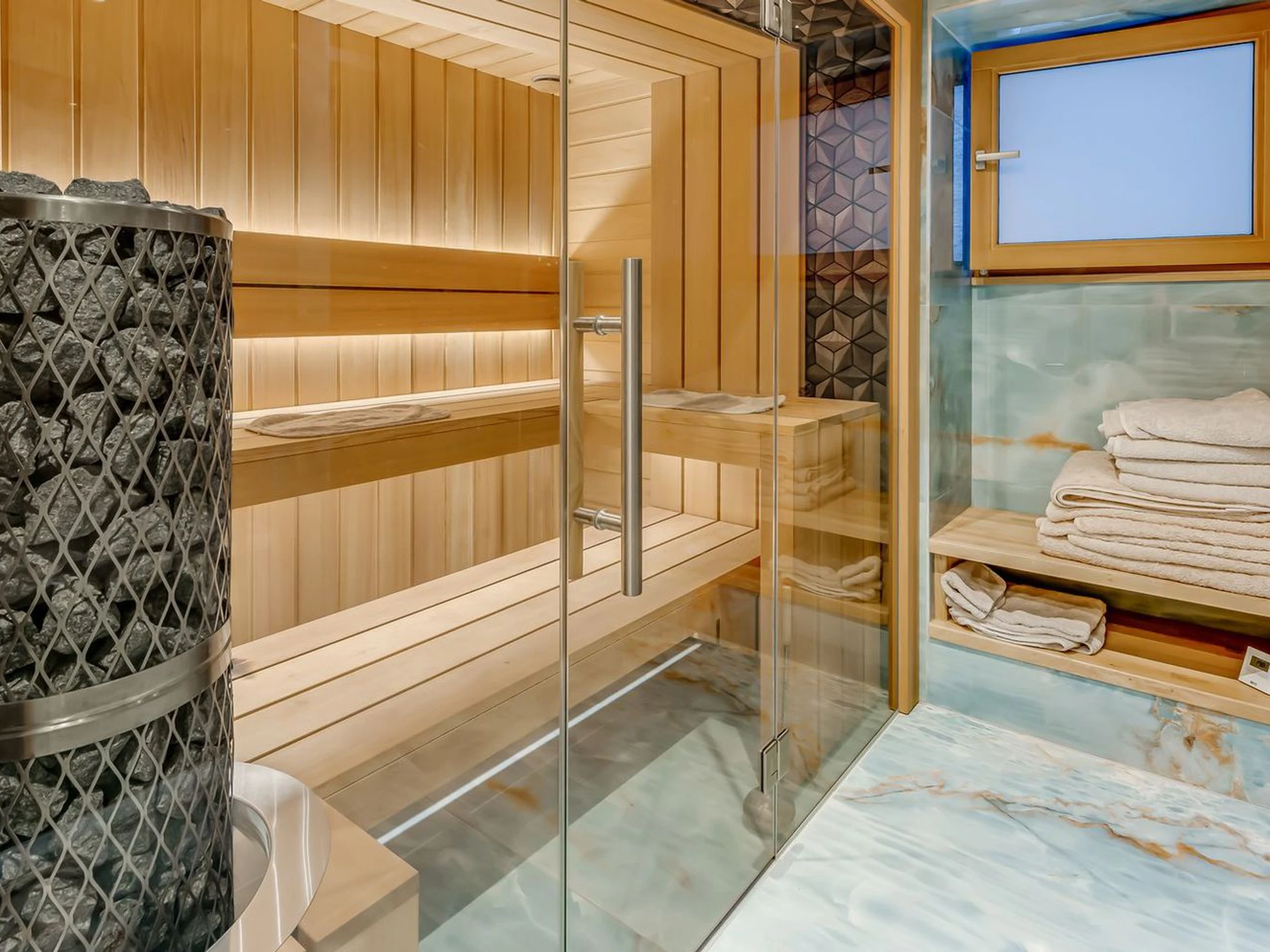 - Au centre de la maison, élégant Sauna pour 4 - 6 personnes Marbre bleu, douche eau froide et baignoire à disposition. Occultation du sauna par vitrage luminescent.