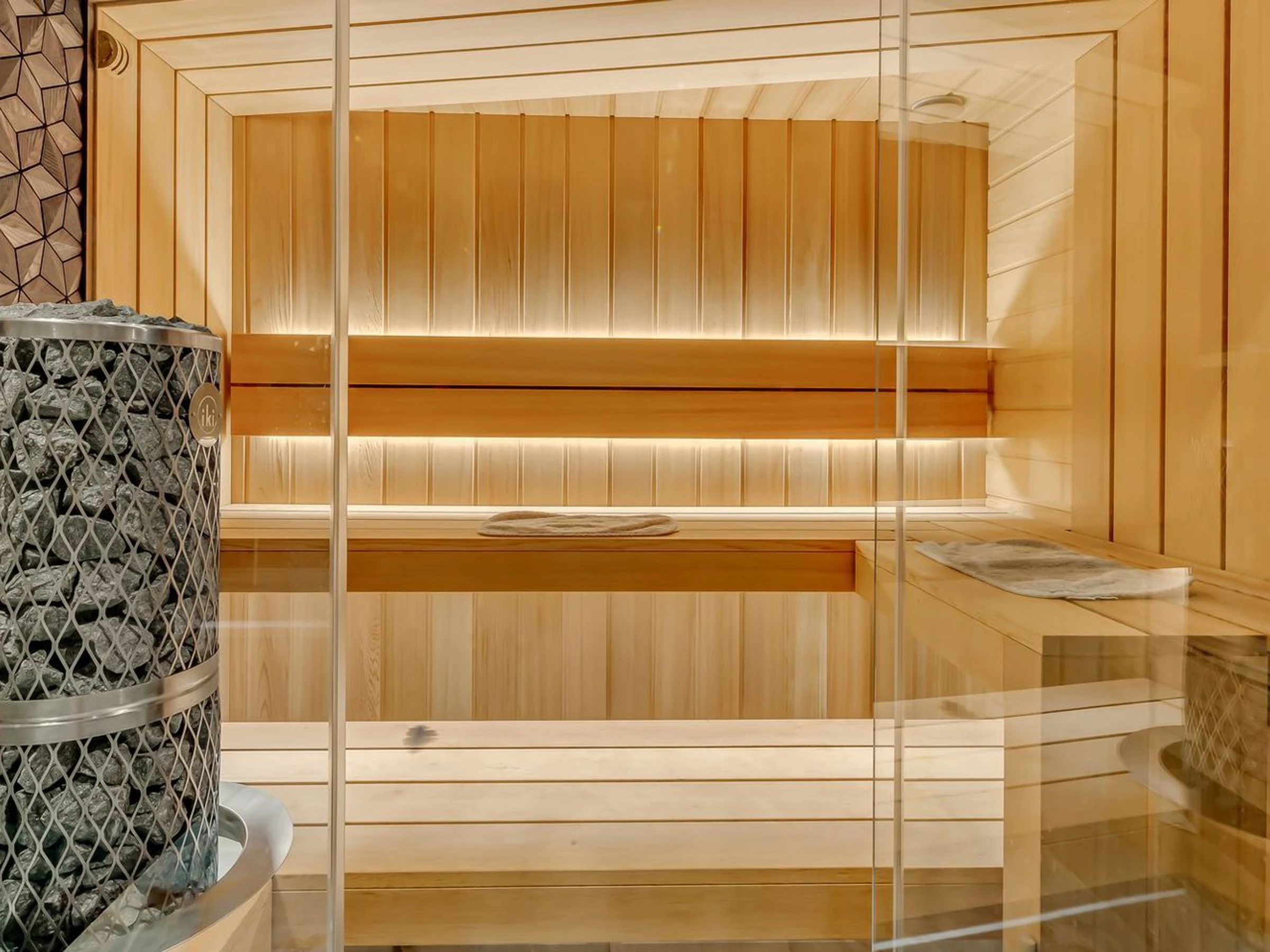Au centre de la maison, 1 sauna intérieur avec douche et baignoire.