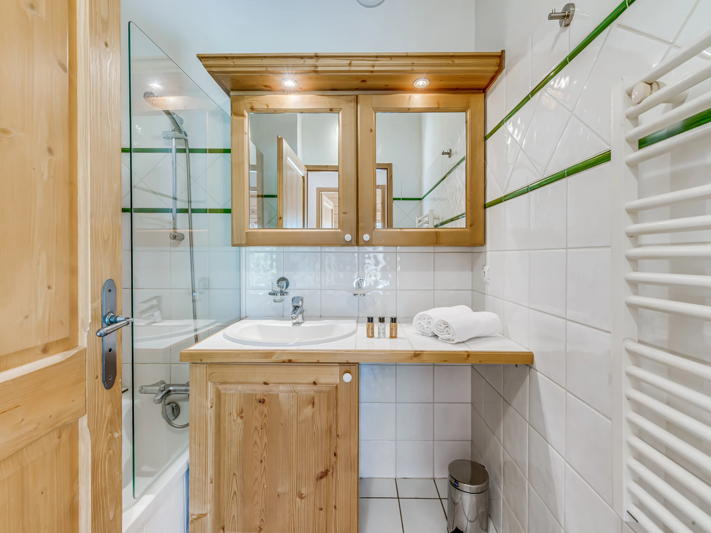 - 1 Salle de bains, avec baignoire, meuble vasque, radiateur sèche serviettes.
