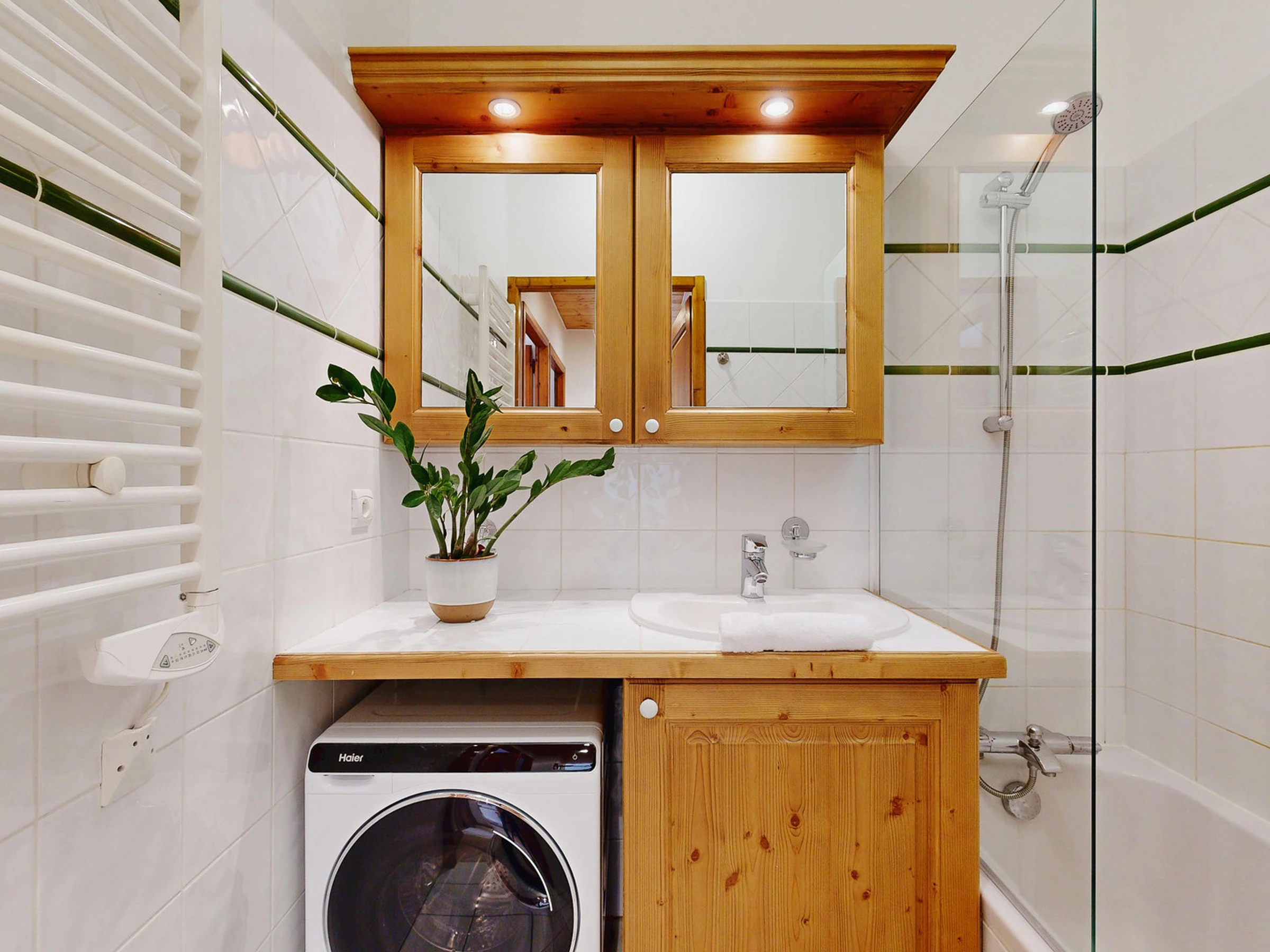 - 1 salle de bain avec baignoire, meuble vasque, radiateur sèche serviettes et lave-linge