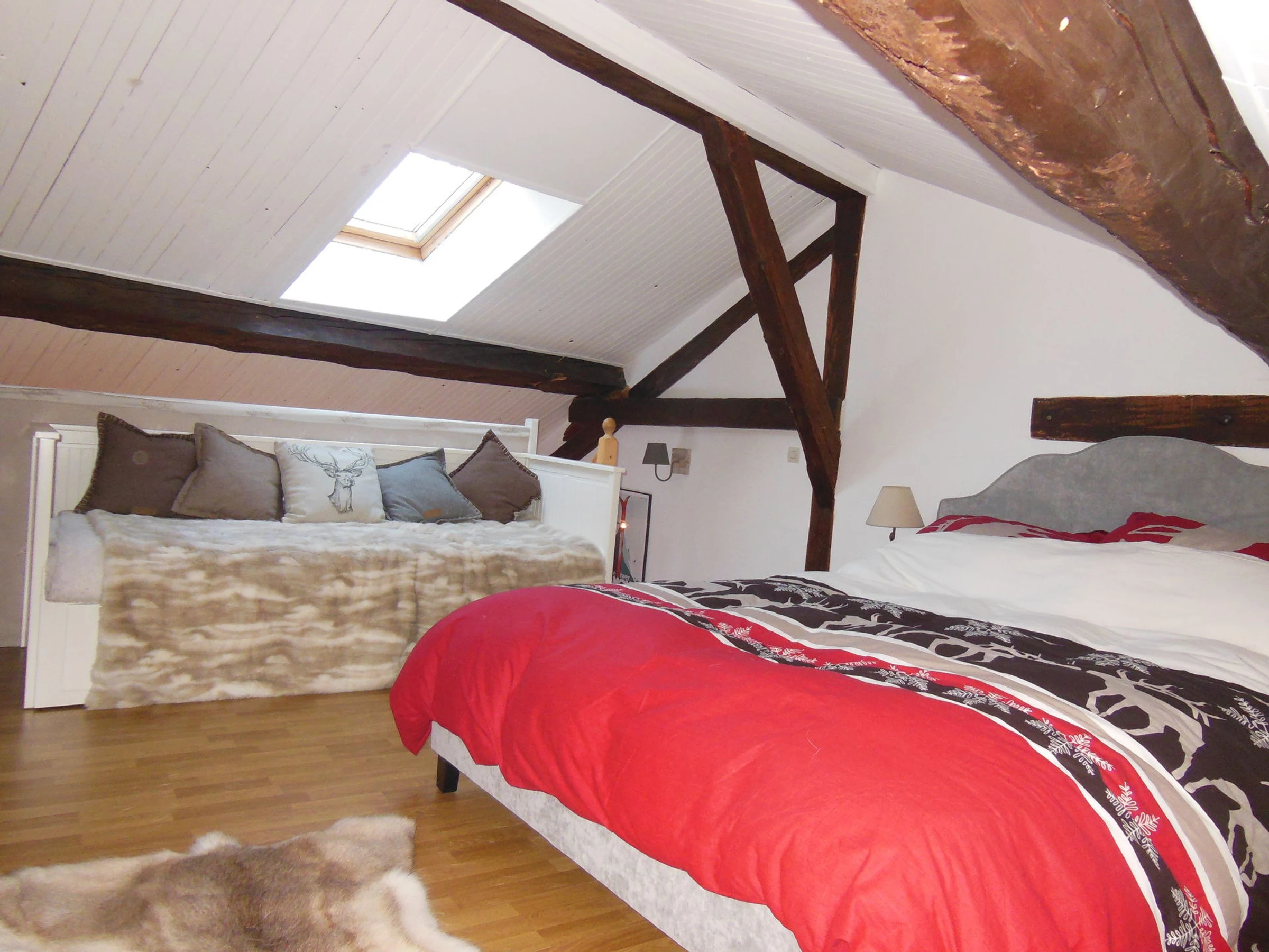 * Chambre avec 2 lits superposés (80x190) et couettes, rangements et fenêtre