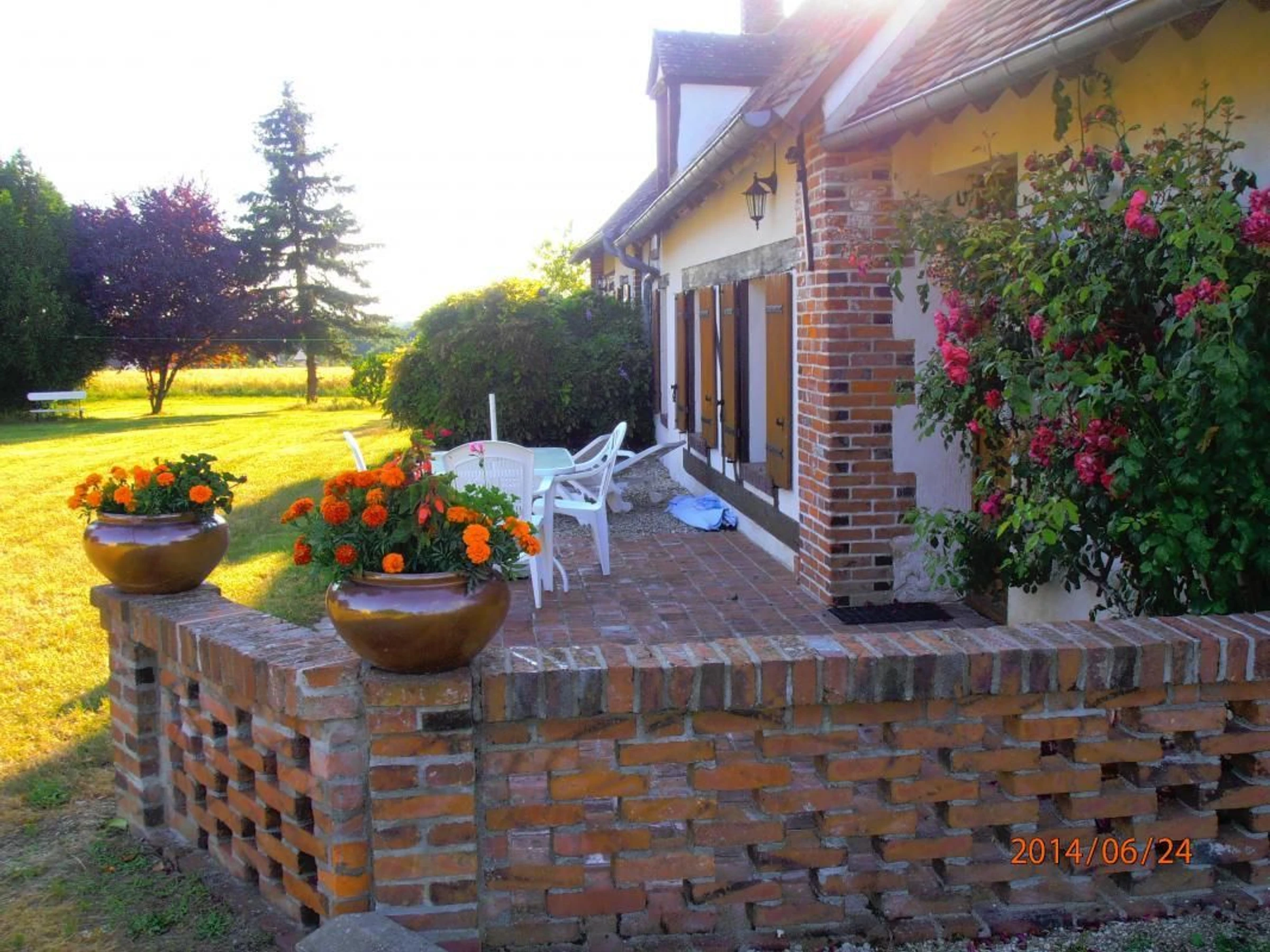 Grand terrain non clos avec mare clôturée, entouré de prés. Barbecue, salon de jardin. Toboggan, balançoire. Animaux non admis.