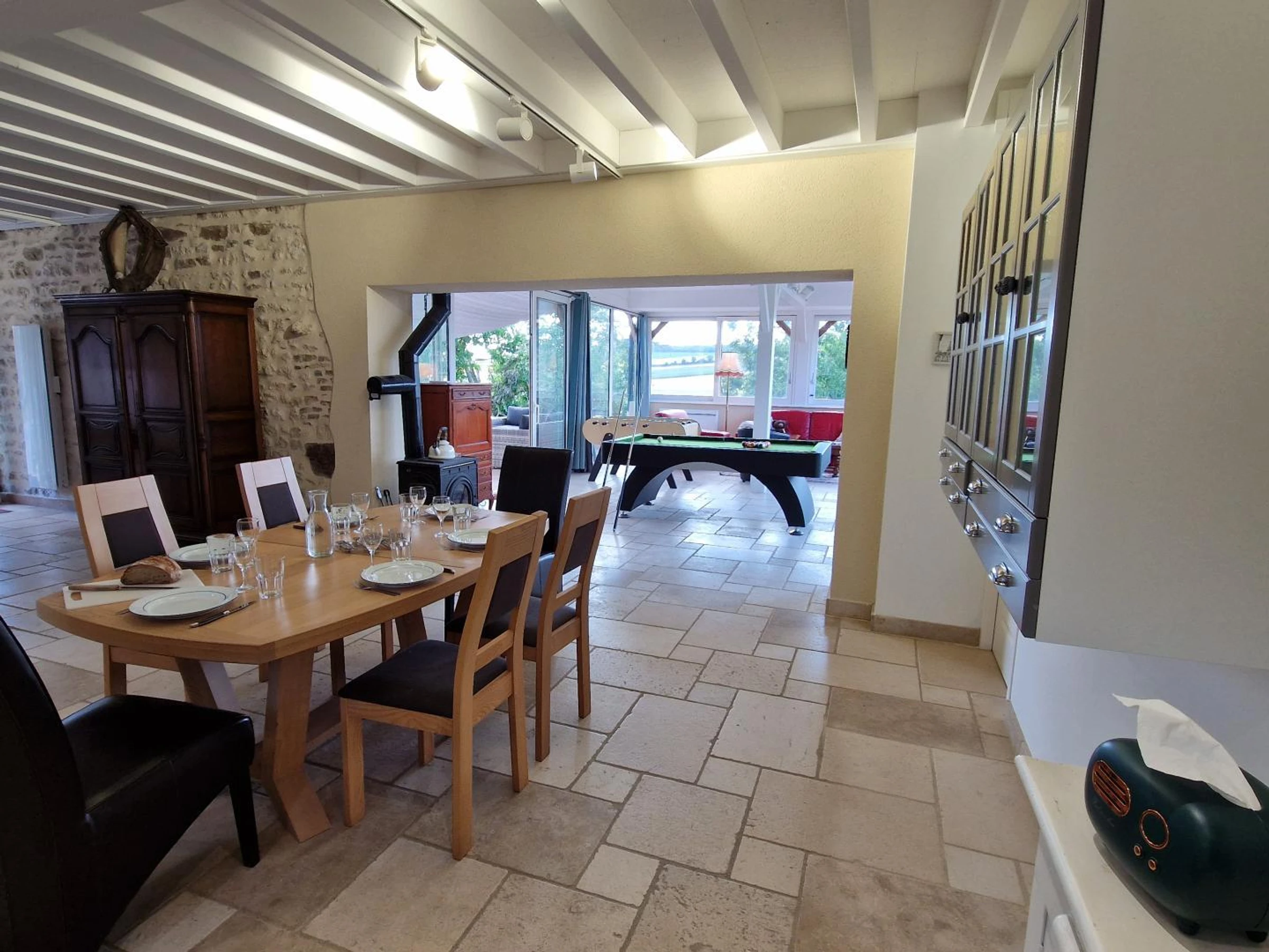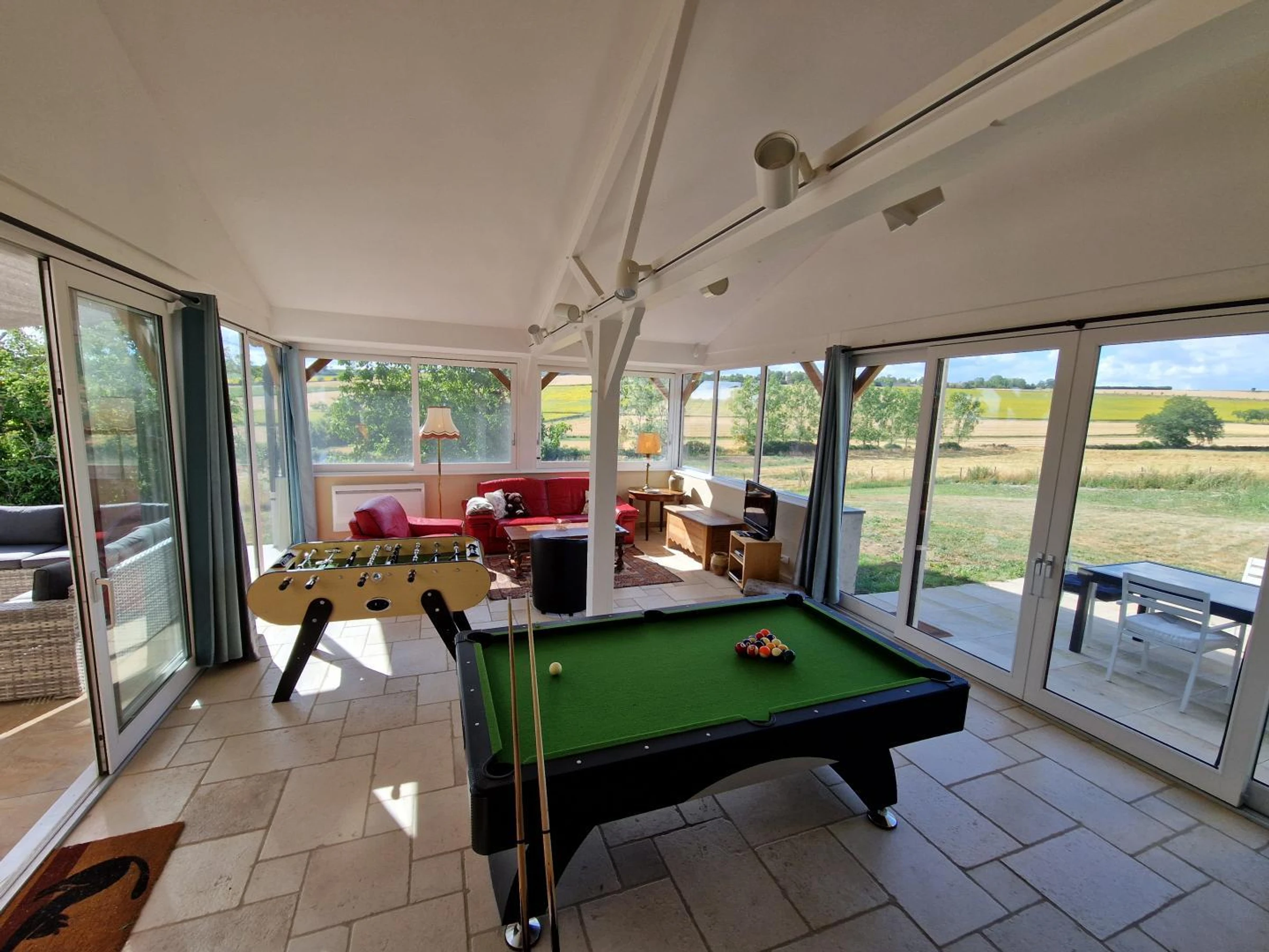 Au rez-de-chaussée : 1 chambre pour 2 personnes et possibilité d'un couchage supplémentaire dans le BZ. Salle d'eau privative à cette chambre (douche /WC) , cuisine équipée, salon cosy et salle de jeux (billard, babyfoot). De grandes baies vitrées offrant une vue panoramique sur la campagne et Charroux .