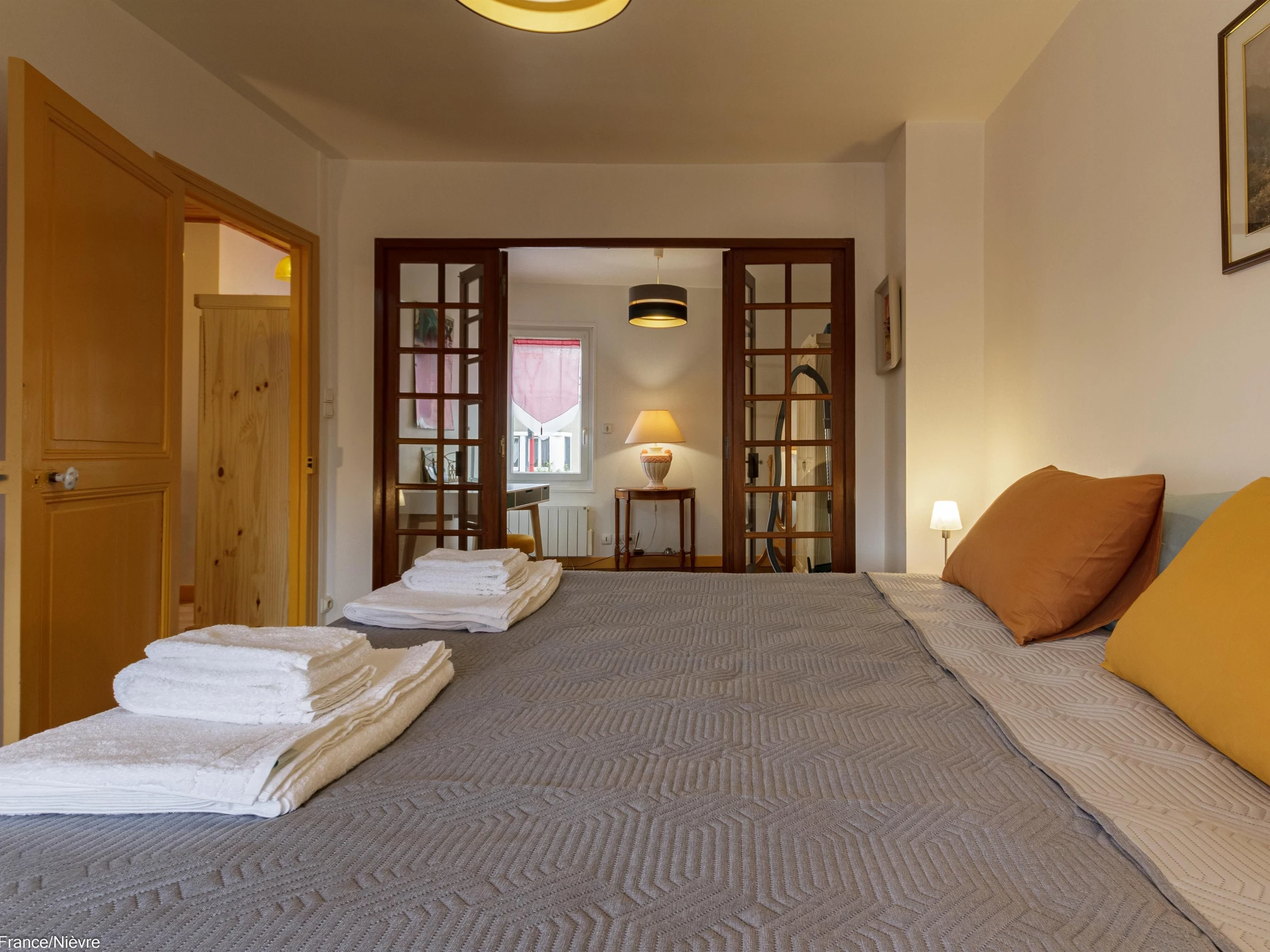 A l'étage 2 grandes chambres en enfilade (et paravent) avec chacune 1 lit 180x200 ou 2 lits 90x200 au choix, ainsi qu'un espace bureau facilitant le télétravail.