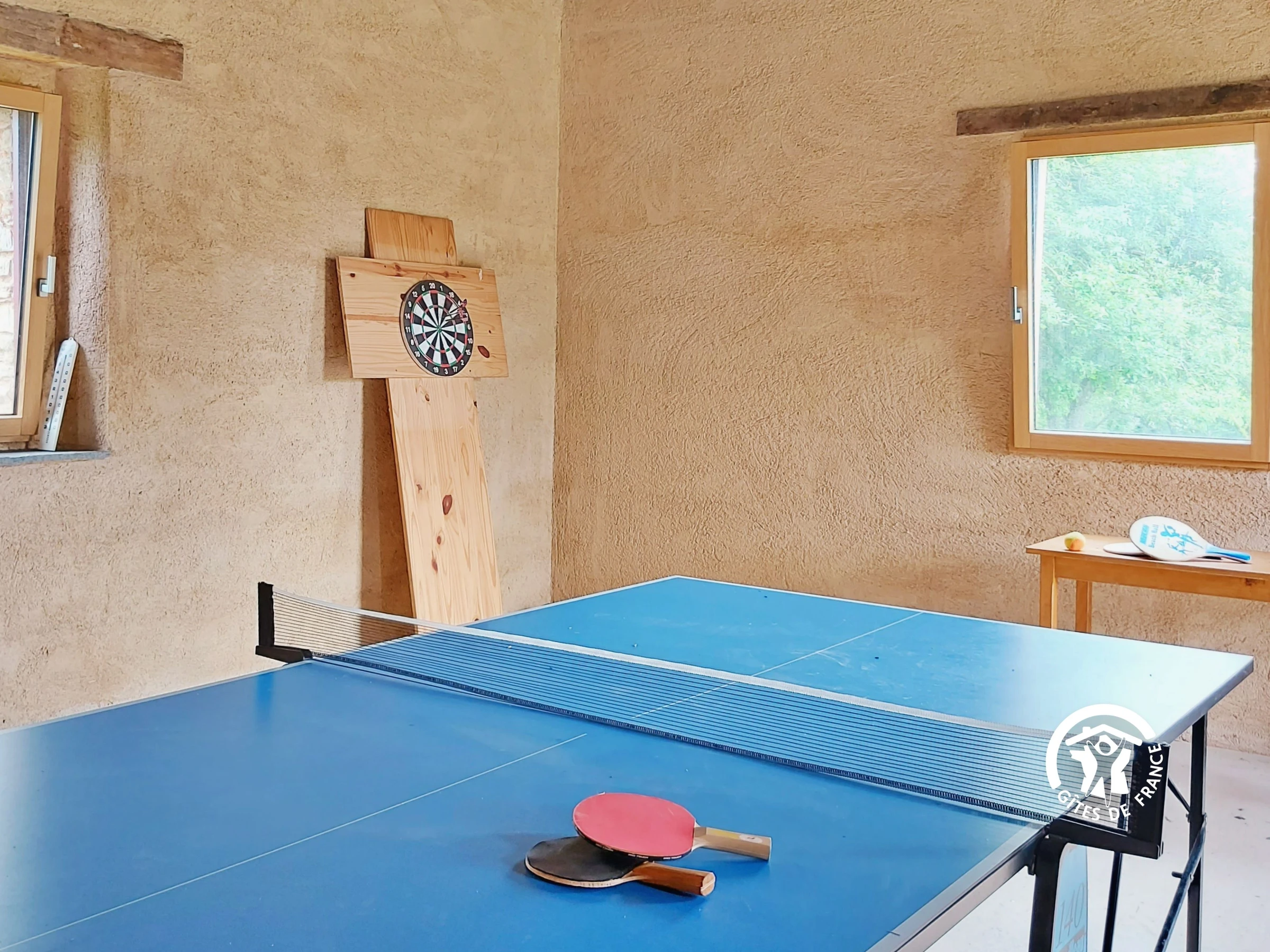 Une salle de jeux avec table de ping-pong et fléchettes. Cheminée décorative.