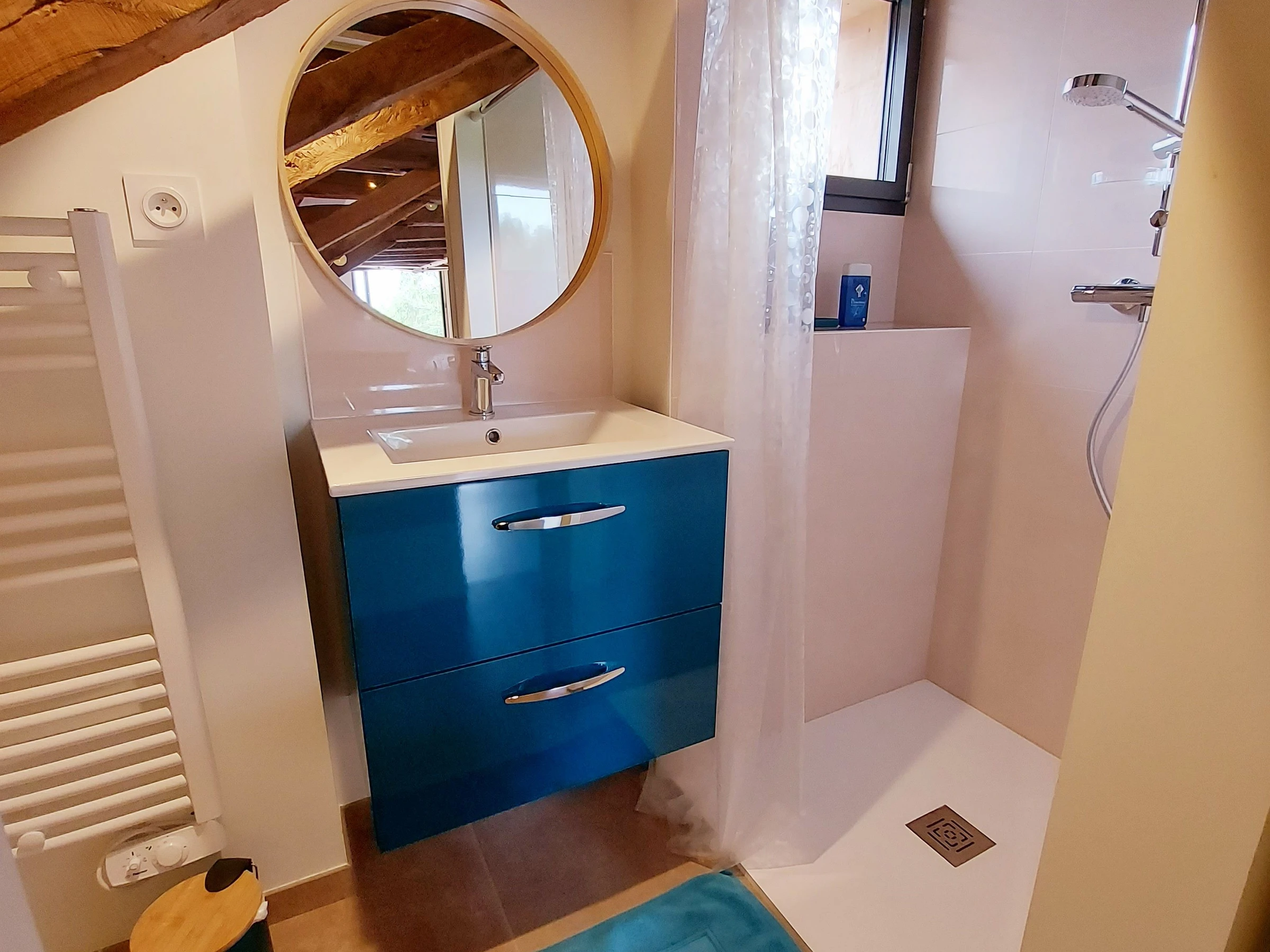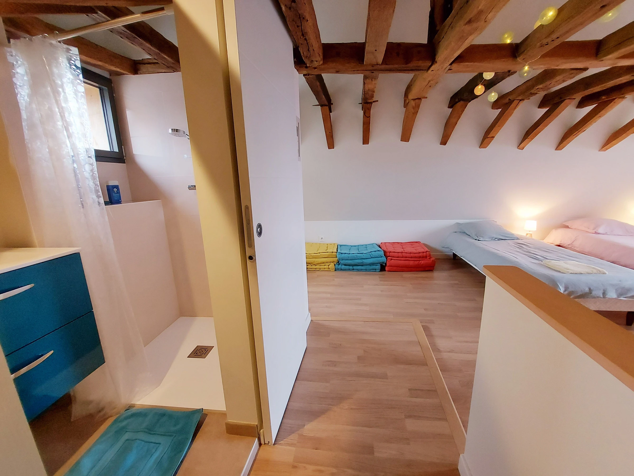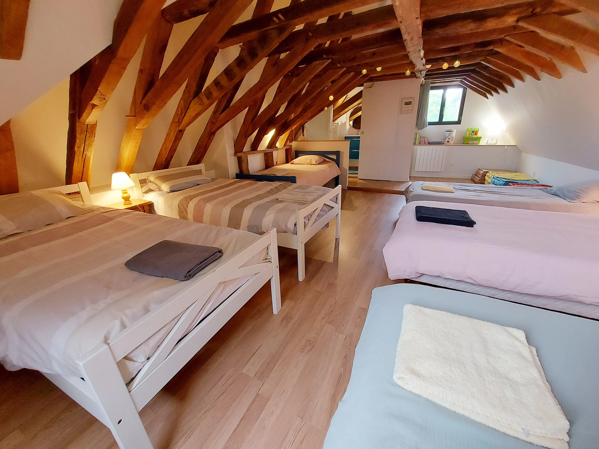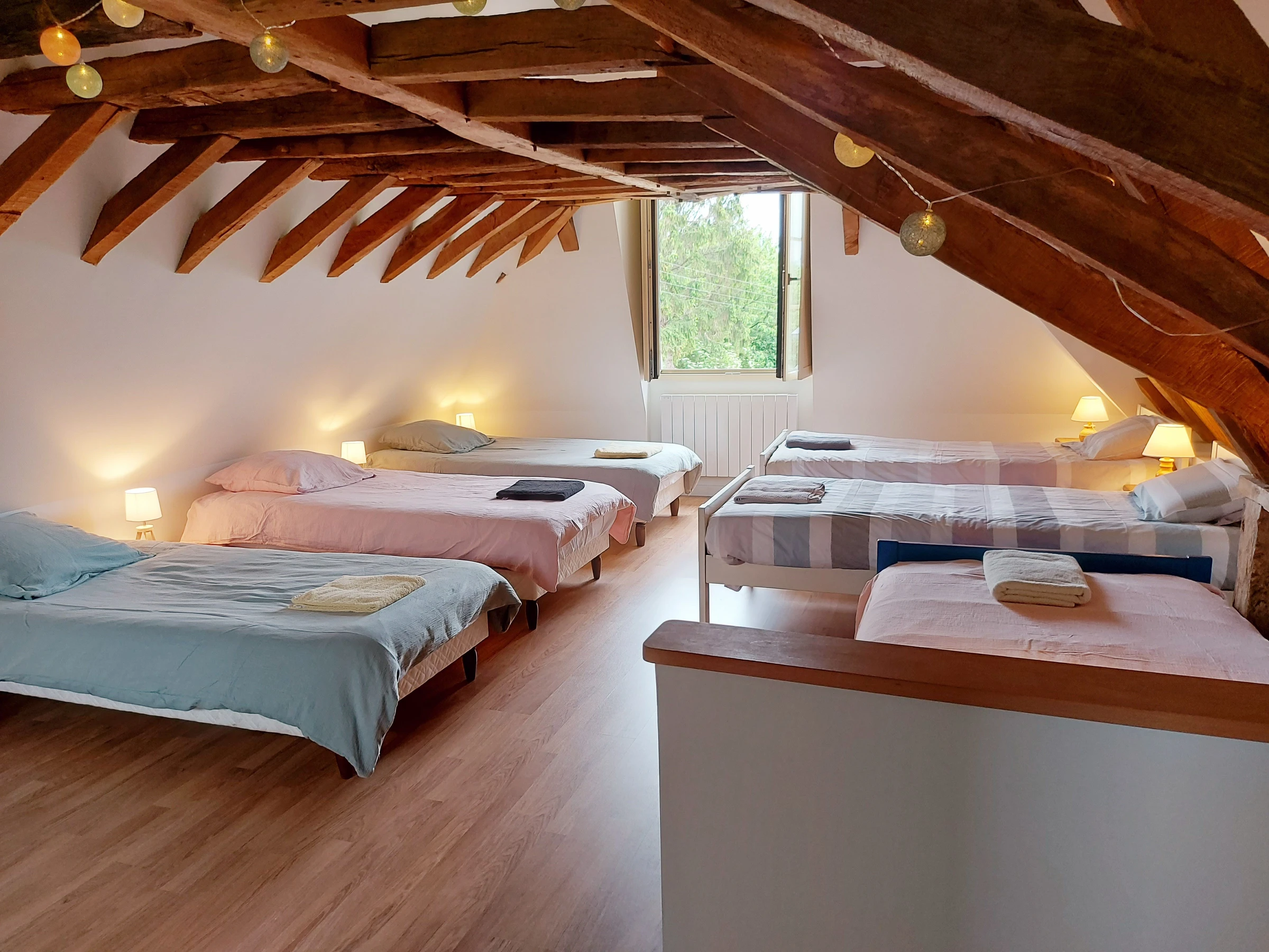 Au 1er étage: chambre Hulotte (2) avec salle d'eau privative, 6 lits 90*190 - chambre Bergeronnettes (3) avec sa salle d'eau et wc privatifs, 1 lit 160*200 - chambre Mésanges (4) avec 2 lits jumeaux 80*200*-chambre Rouge-gorge (5) avec 2 lits jumeaux 80*190* - 1 salle de bain et douche, lavabo double vasques pour les chambres 4 et 5.* lits jumeaux: peuvent être associés ou séparés, selon votre demande.