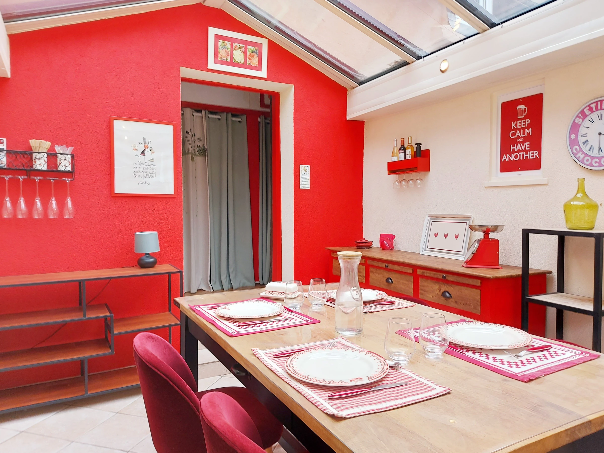 Une salle à manger lumineuse, installée dans une véranda, idéale pour savourer vos repas en toute convivialité.