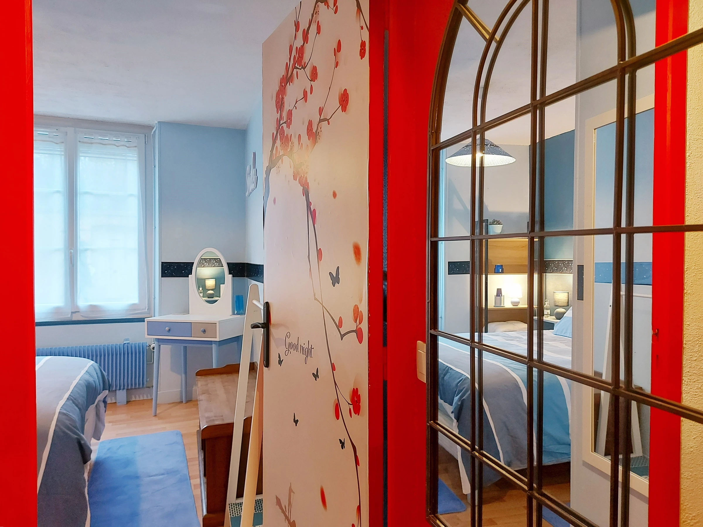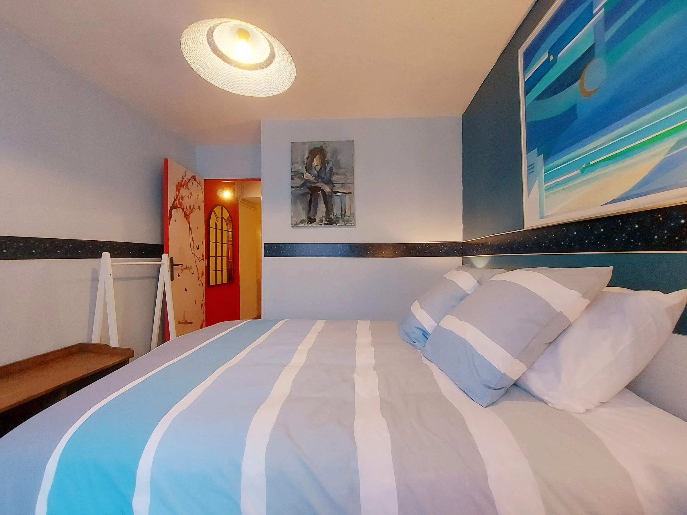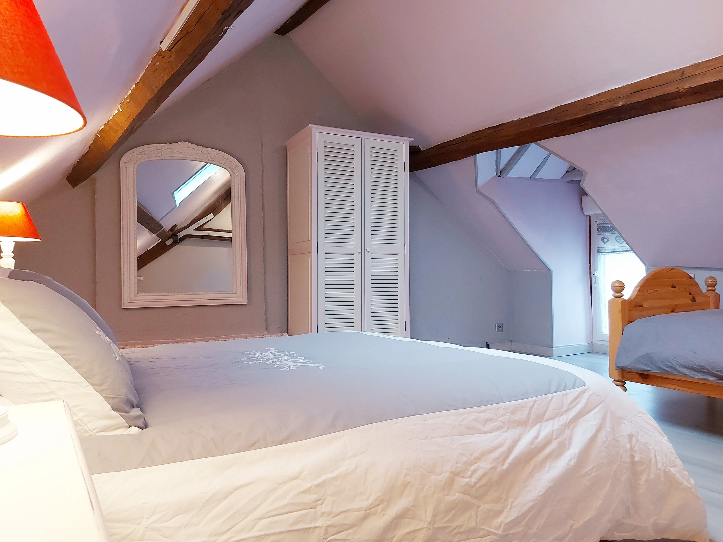 Une chambre spacieuse avec un lit double et un lit simple, idéale pour une famille ou un groupe d’amis.
