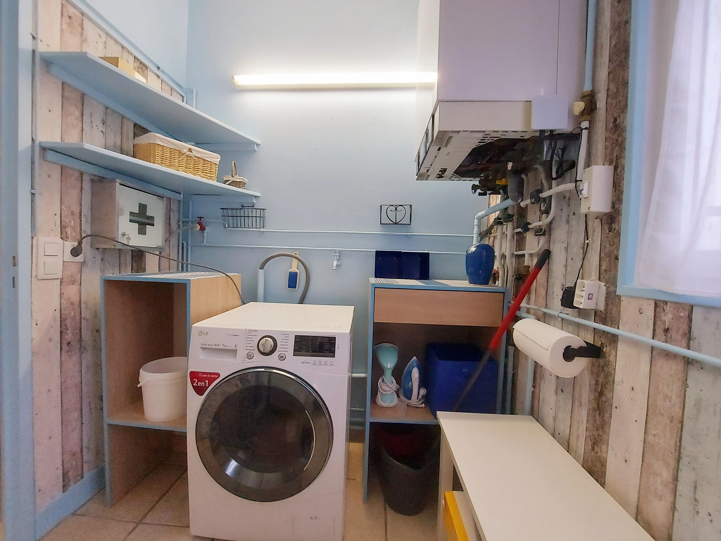 Une buanderie avec lave-linge, aspirateur et congélateur.