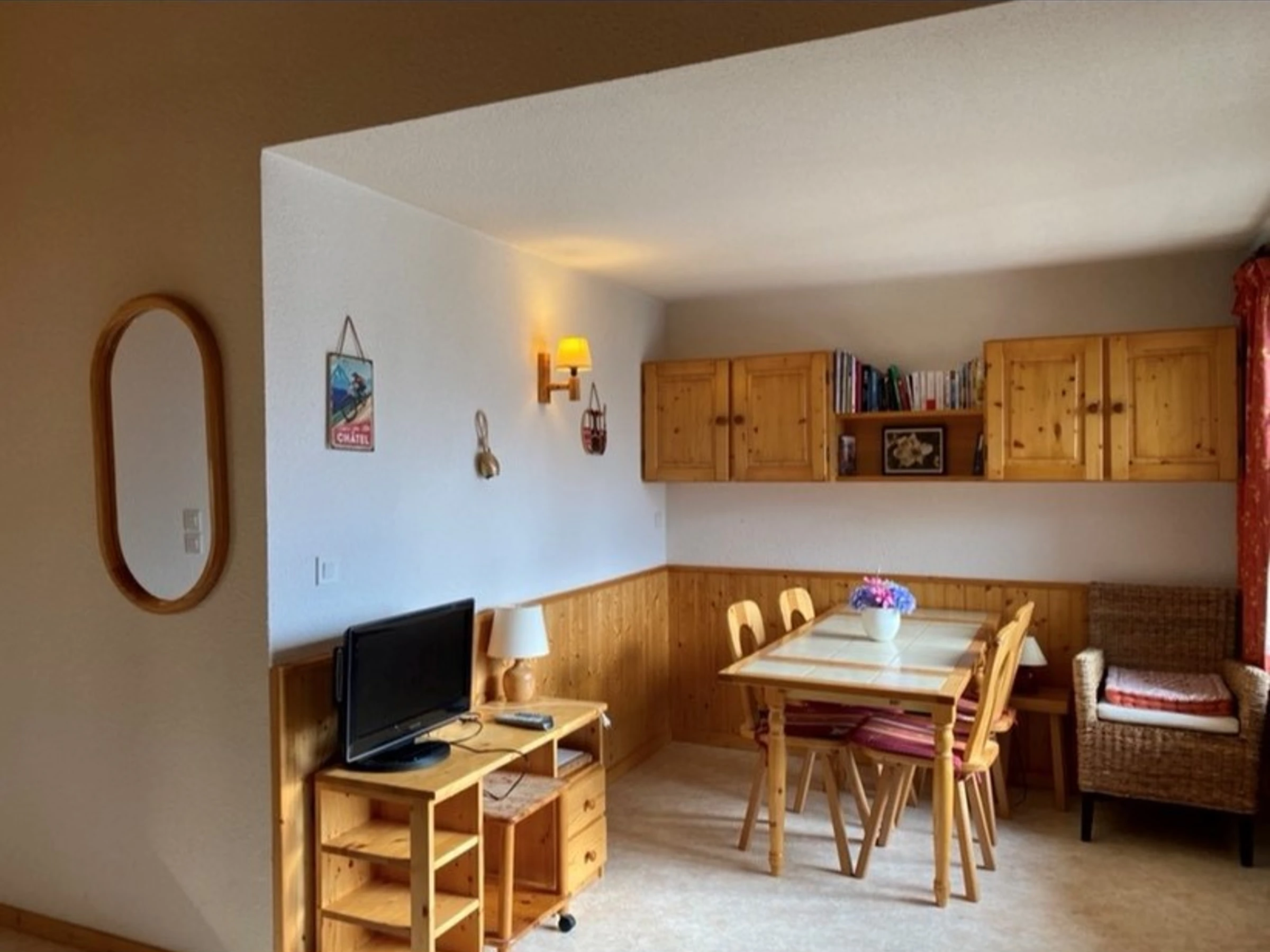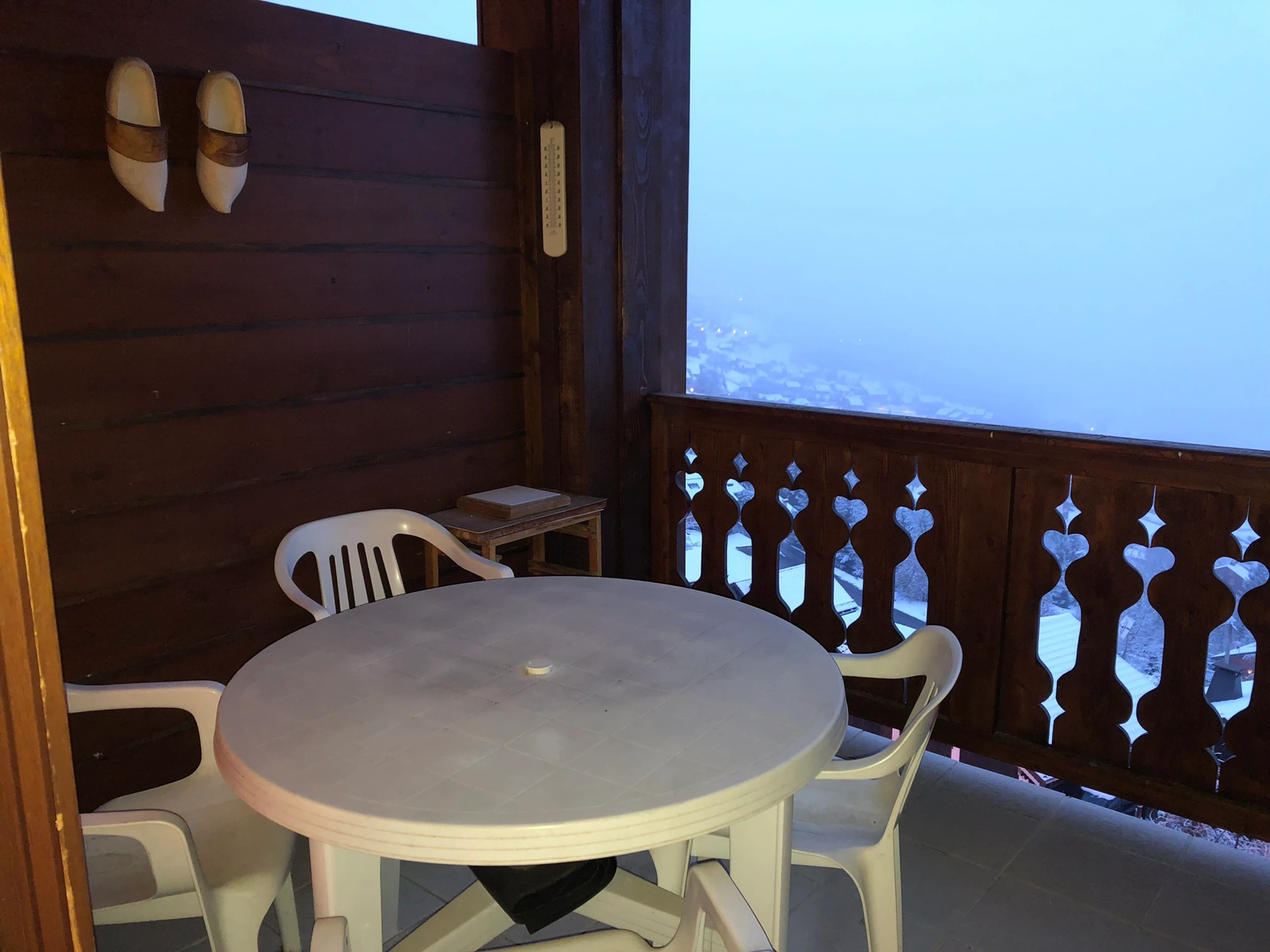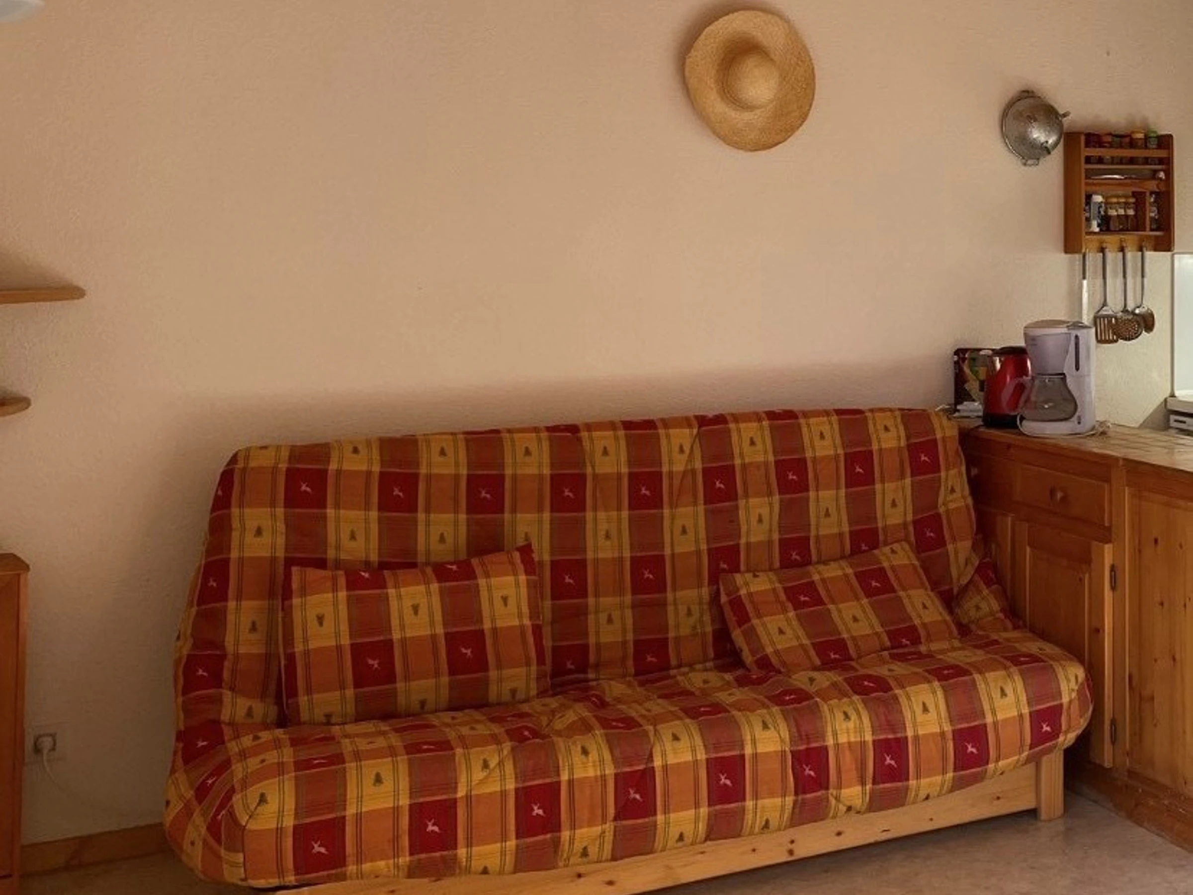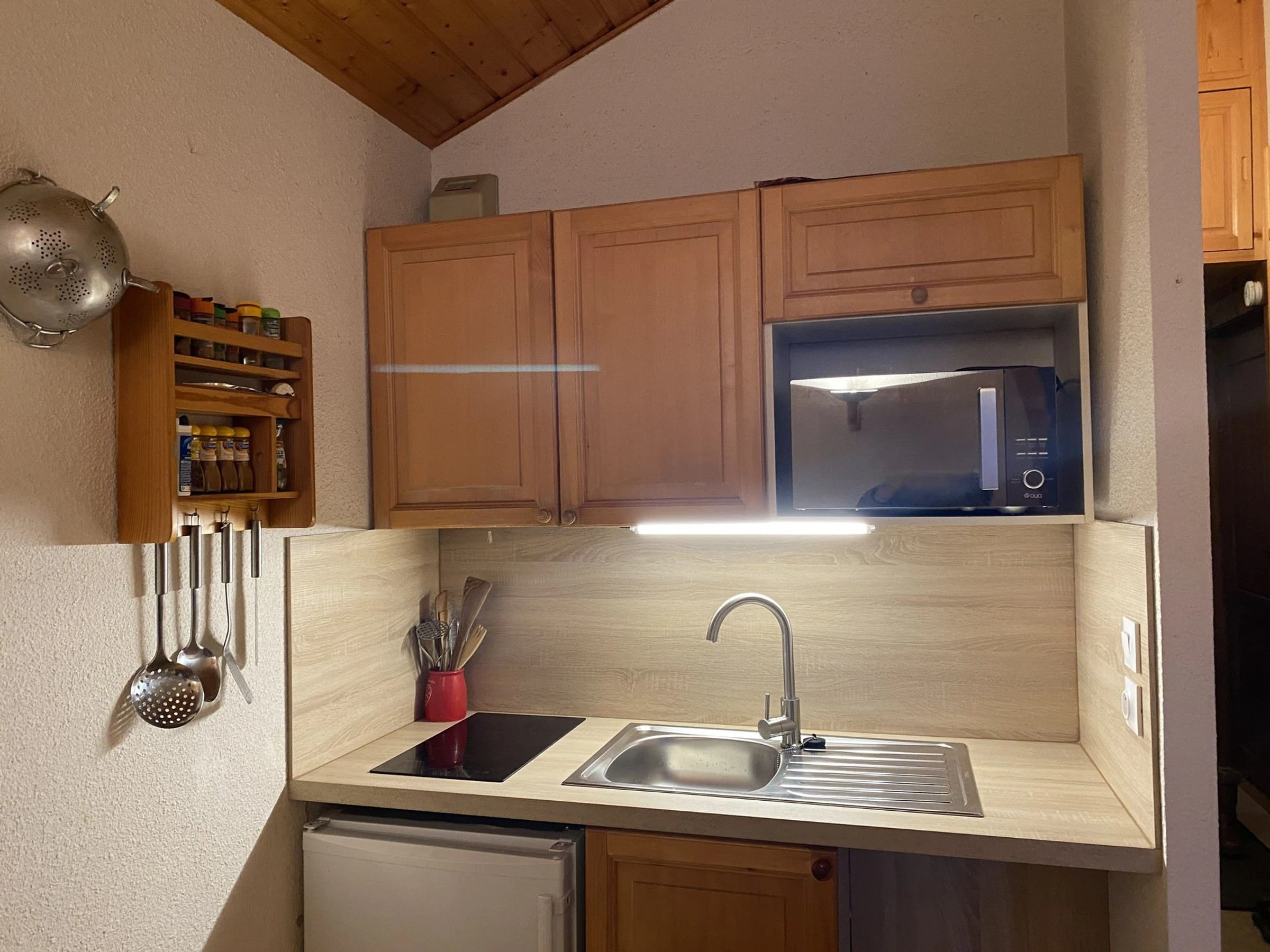 Il comprend une entrée avec placard de rangement, une salle de bain, un WC indépendant, une cuisine ouverte sur le séjour avec un canapé convertible, et une terrasse exposé côté sud permettant de profiter du soleil et de la magnifique vue sur les montagnes et le village.
