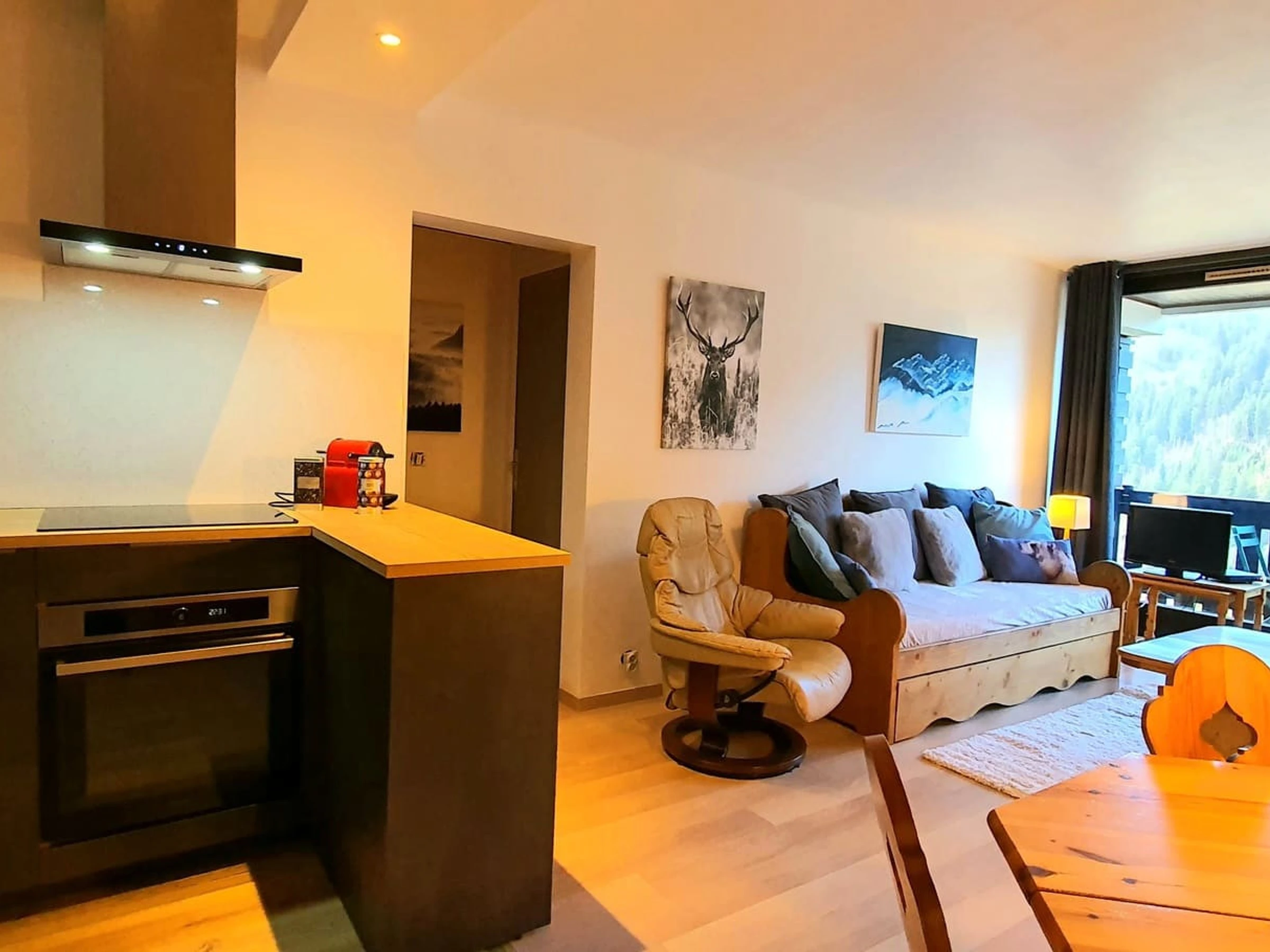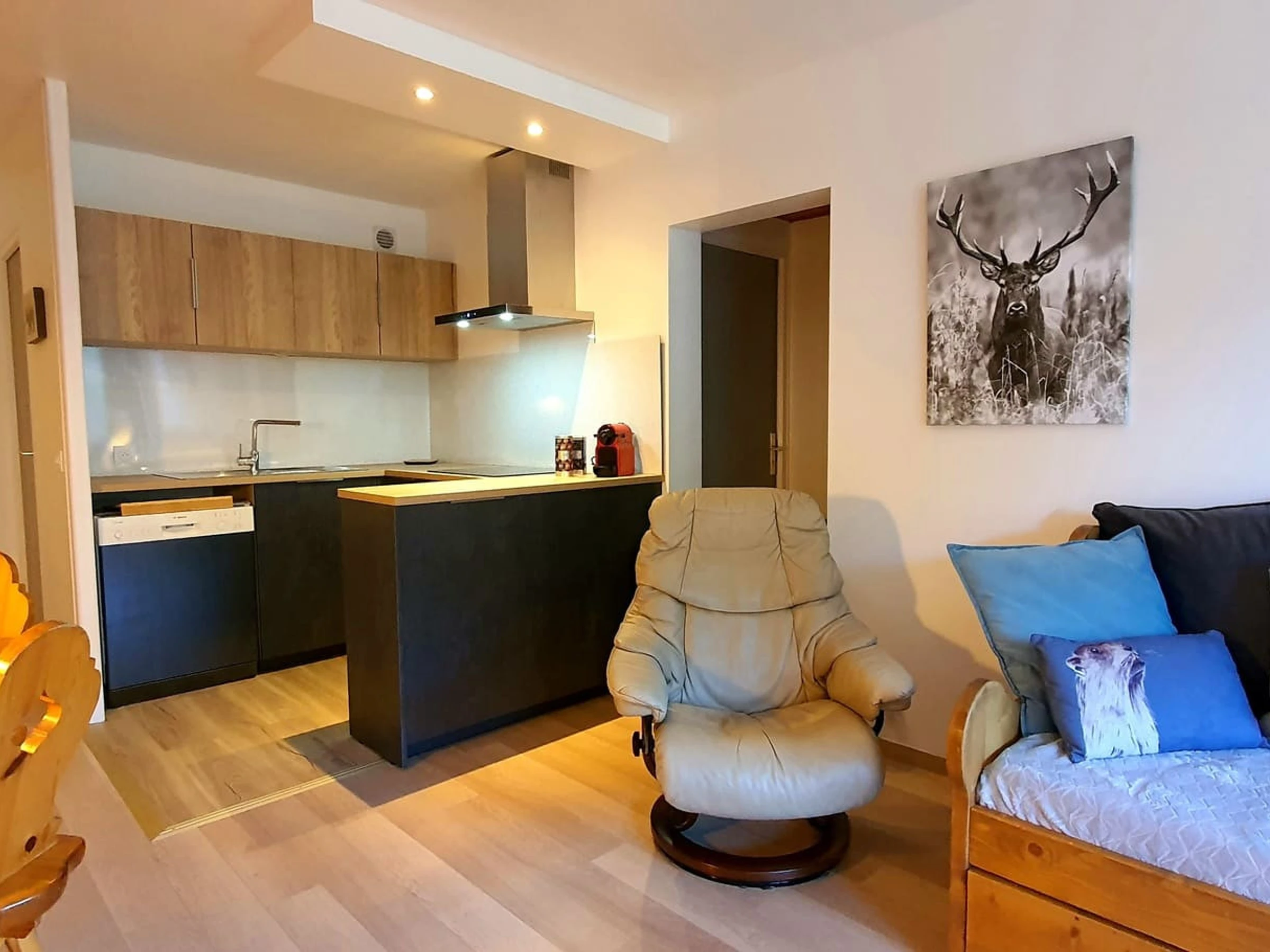Coin cuisine équipé, Réfrigérateur avec partie congélateur, Four, Micro-ondes, Lave-vaisselle, Appareil à fondue, Appareil à pierrade, Bouilloire électrique, Grille-pain, Cafetière filtre, Cafetière NESPRESSO, Gaufrier