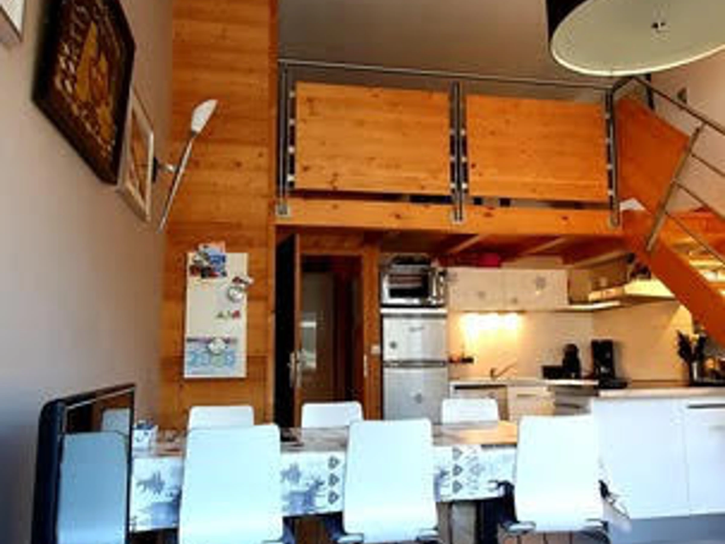 Coin montagne (séparé du séjour) 2 lits superposés (80 x 190), Mezzanine 1 lit double (140 x 200) + 1 lit simple (90 x 200), Attention, mezzanine basse