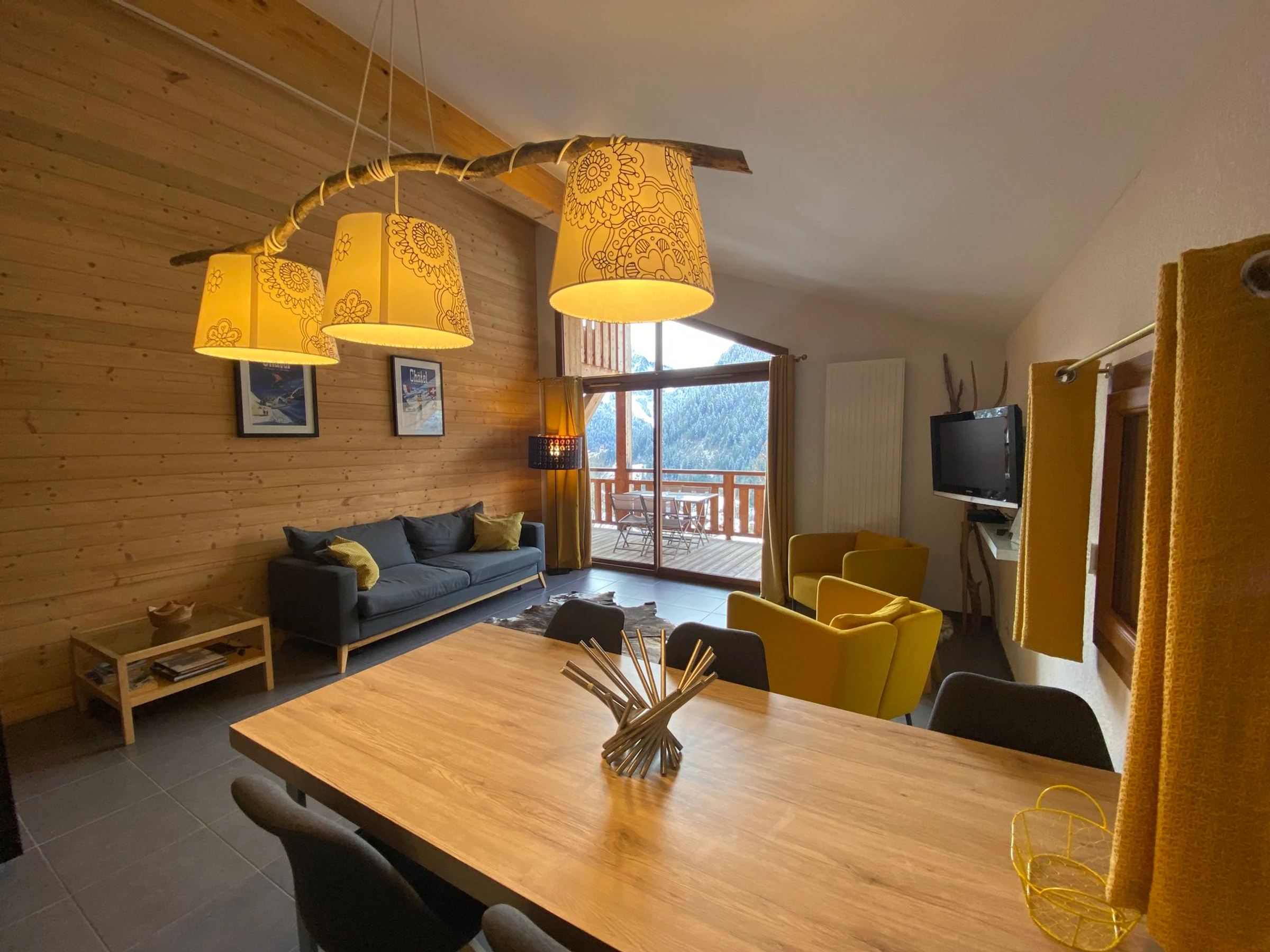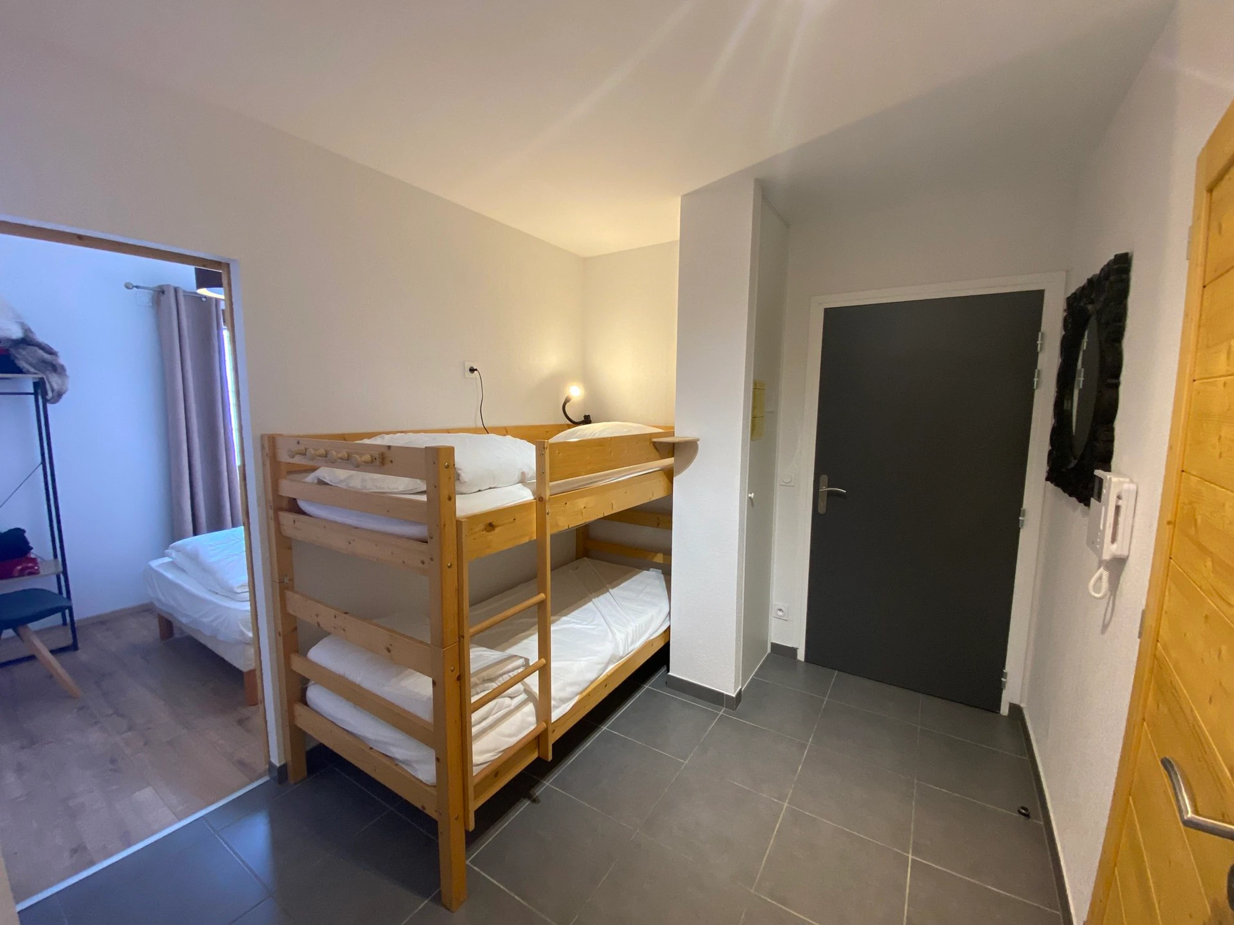Appartement au 2ème étage, de 64m², comprenant une entrée avec coin montagne, lits superposés (90x190), une chambre avec un 1 lit double (140x190), une chambre avec un un lit double (160x200), salle de bains avec douche, toilettes séparées, cuisine équipée ouverte sur salle à manger-séjour, balcon exposé Sud.