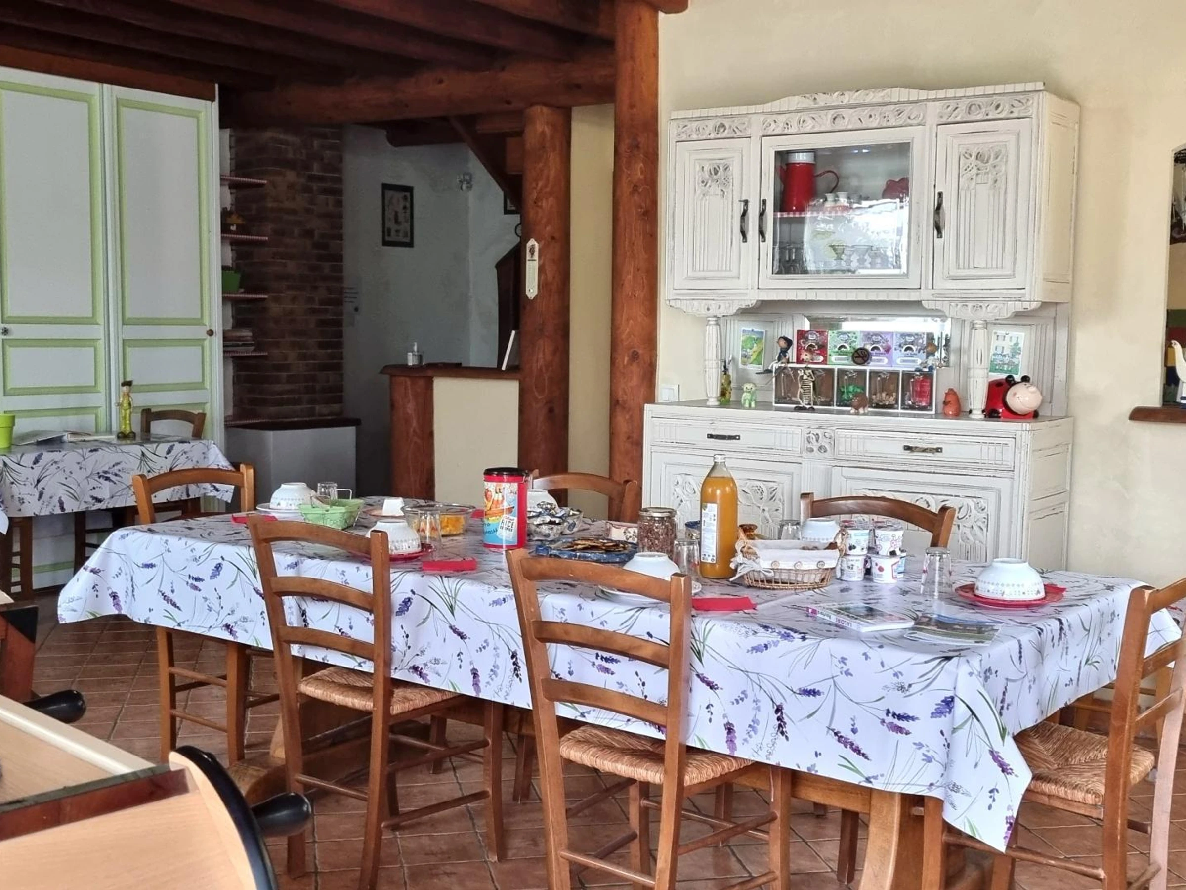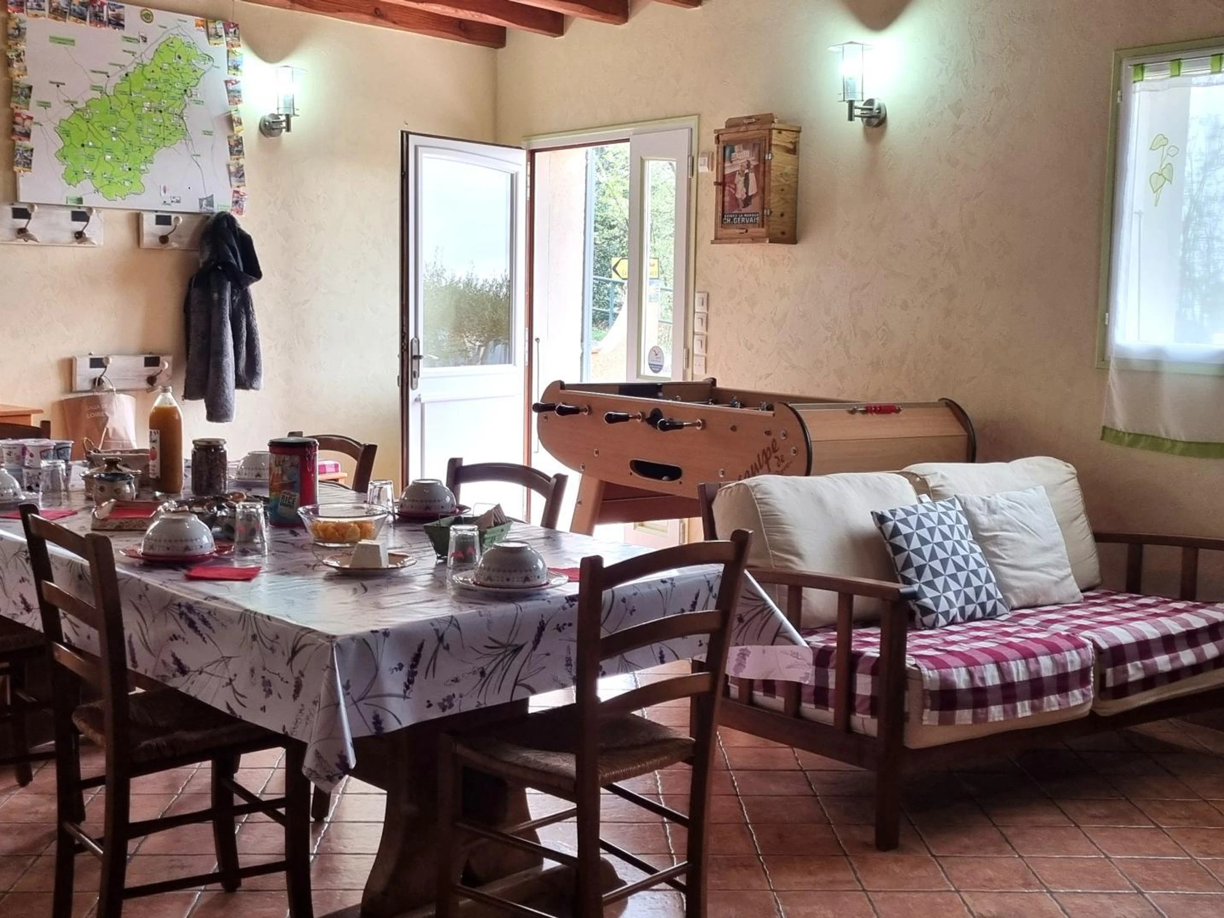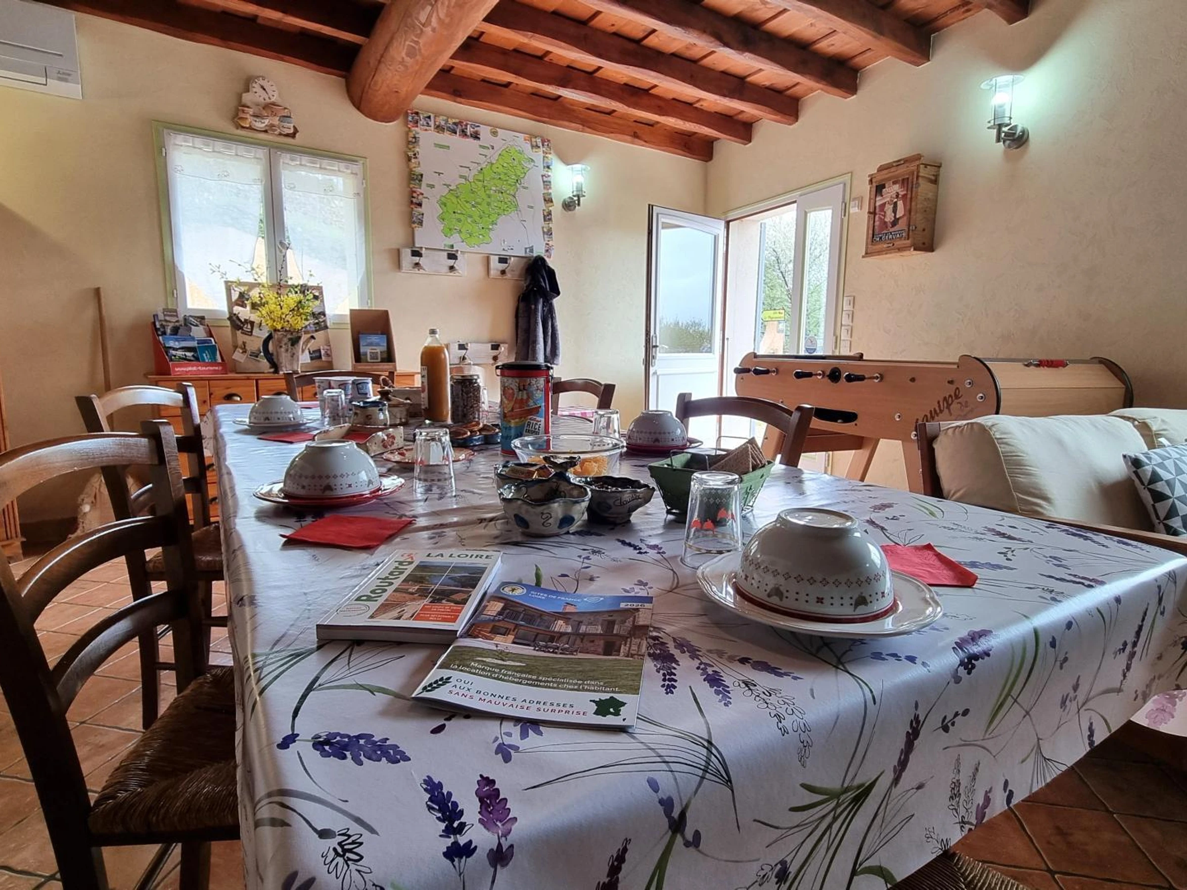 Mitoyen à la maison des propriétaires, Le Piegonnier est un gîte de 190 m² sur plusieurs niveaux. L'entrée s'ouvre sur la pièce à vivre avec cuisine ouverte, salle à manger et espace détente, ainsi qu'un WC indépendant au rez-de-chaussée.