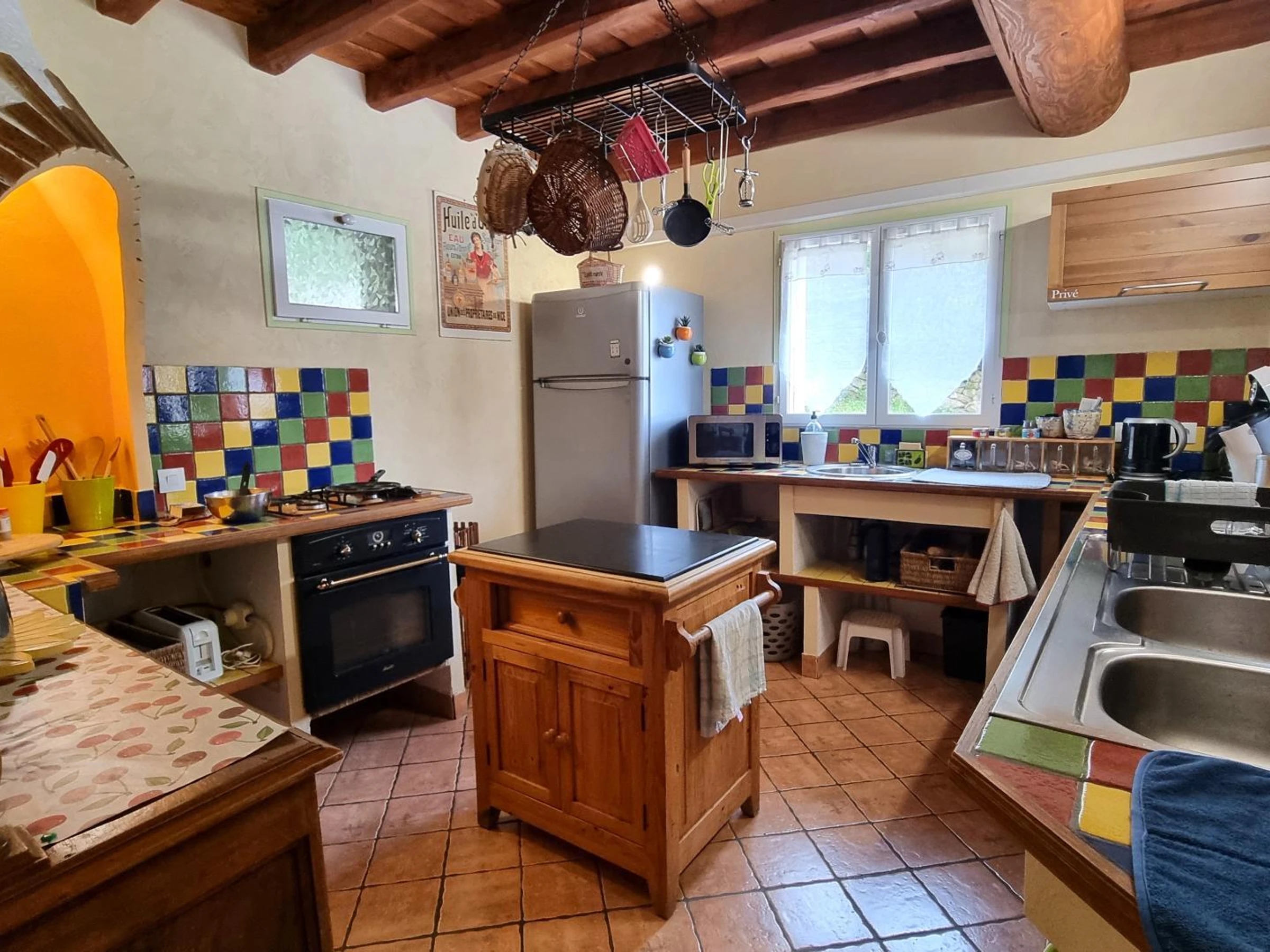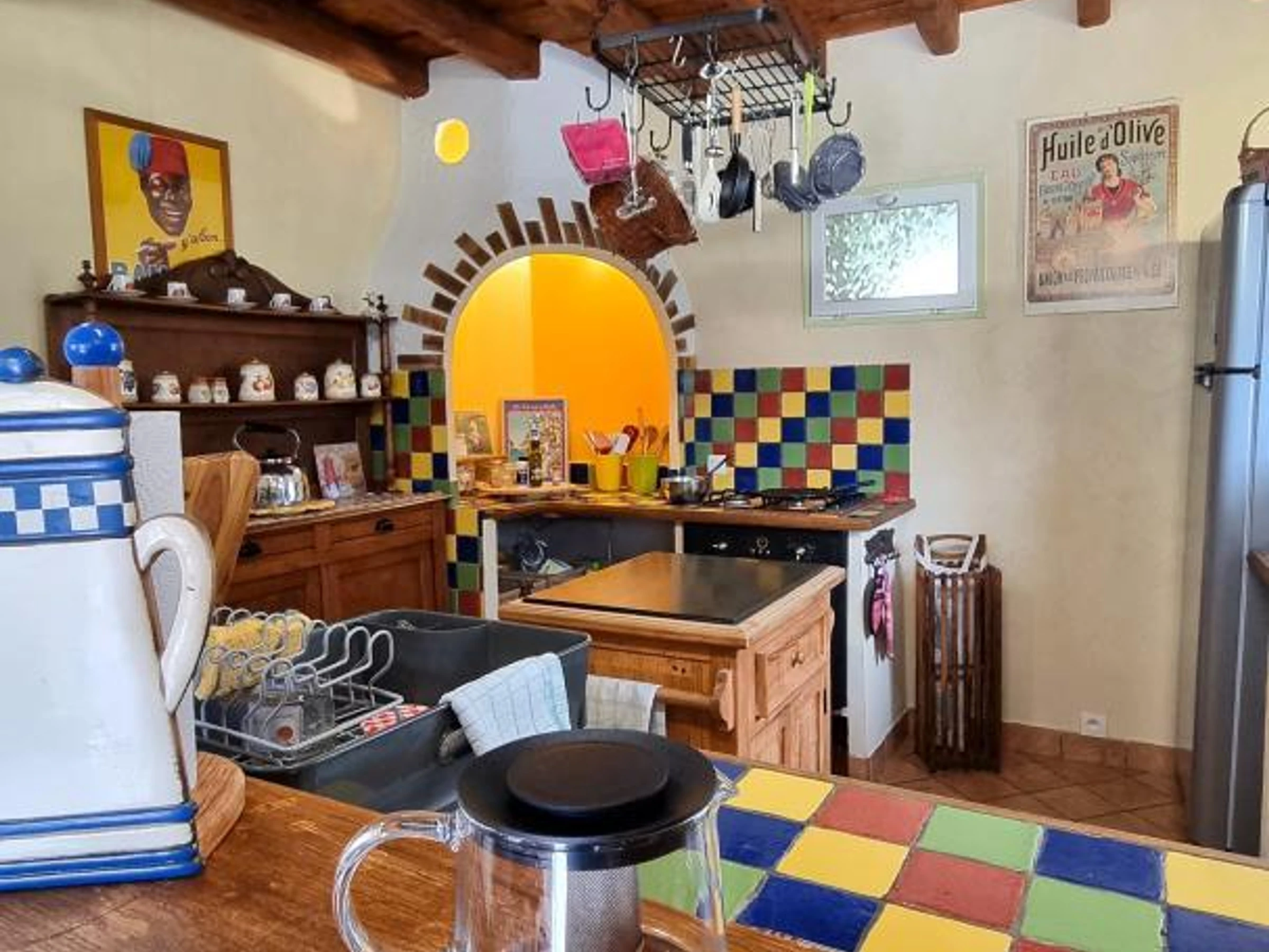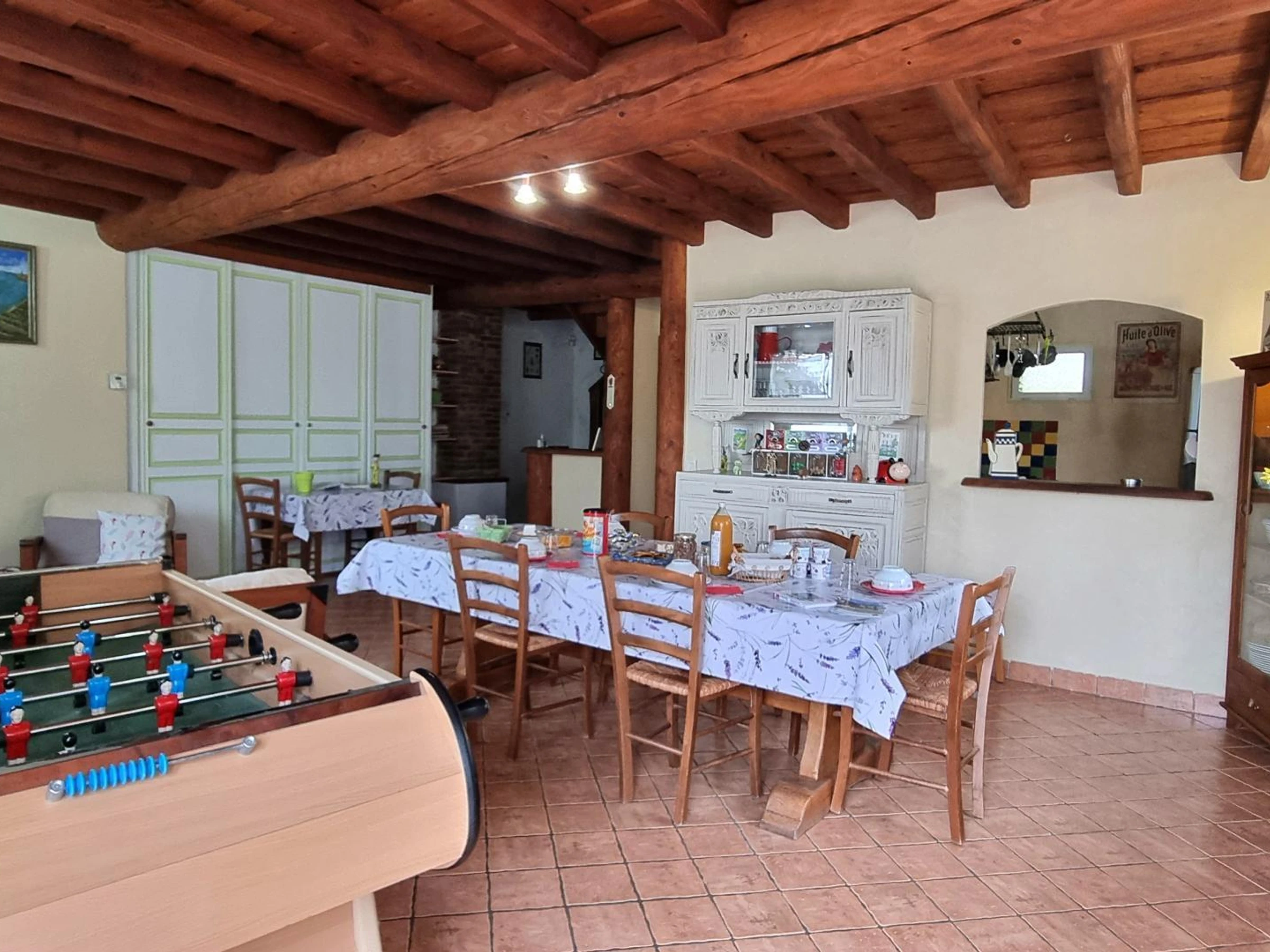 Mitoyen à la maison des propriétaires, Le Piegonnier est un gîte de 190 m² sur plusieurs niveaux. L'entrée s'ouvre sur la pièce à vivre avec cuisine ouverte, salle à manger et espace détente, ainsi qu'un WC indépendant au rez-de-chaussée.
