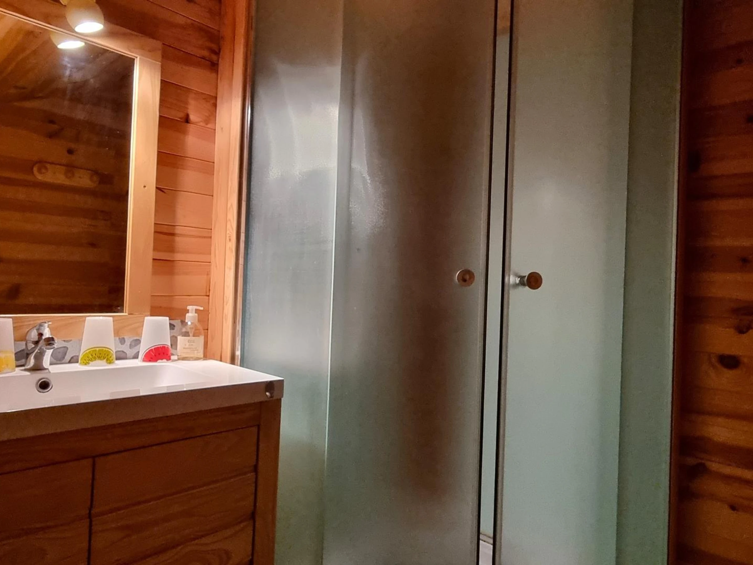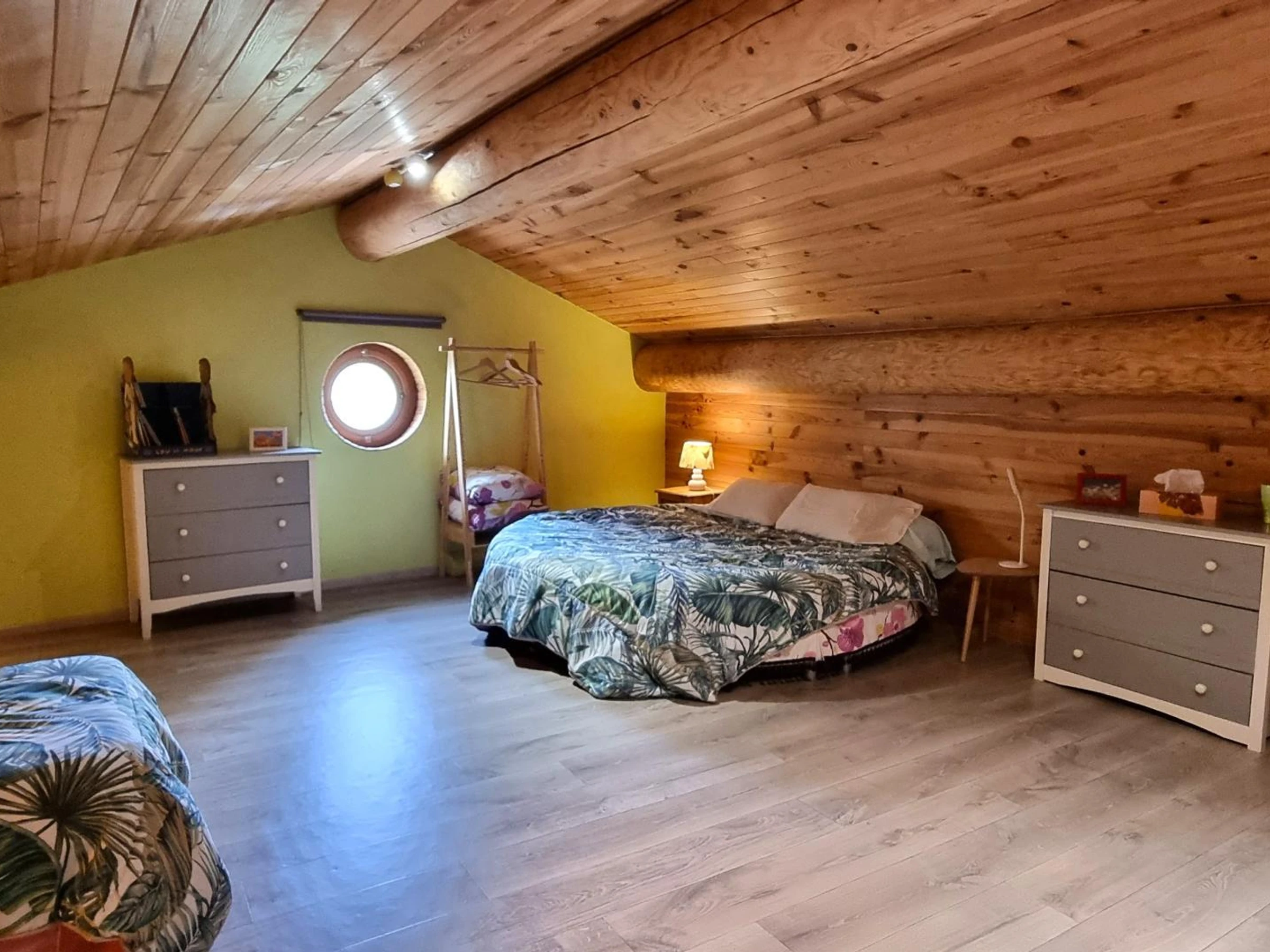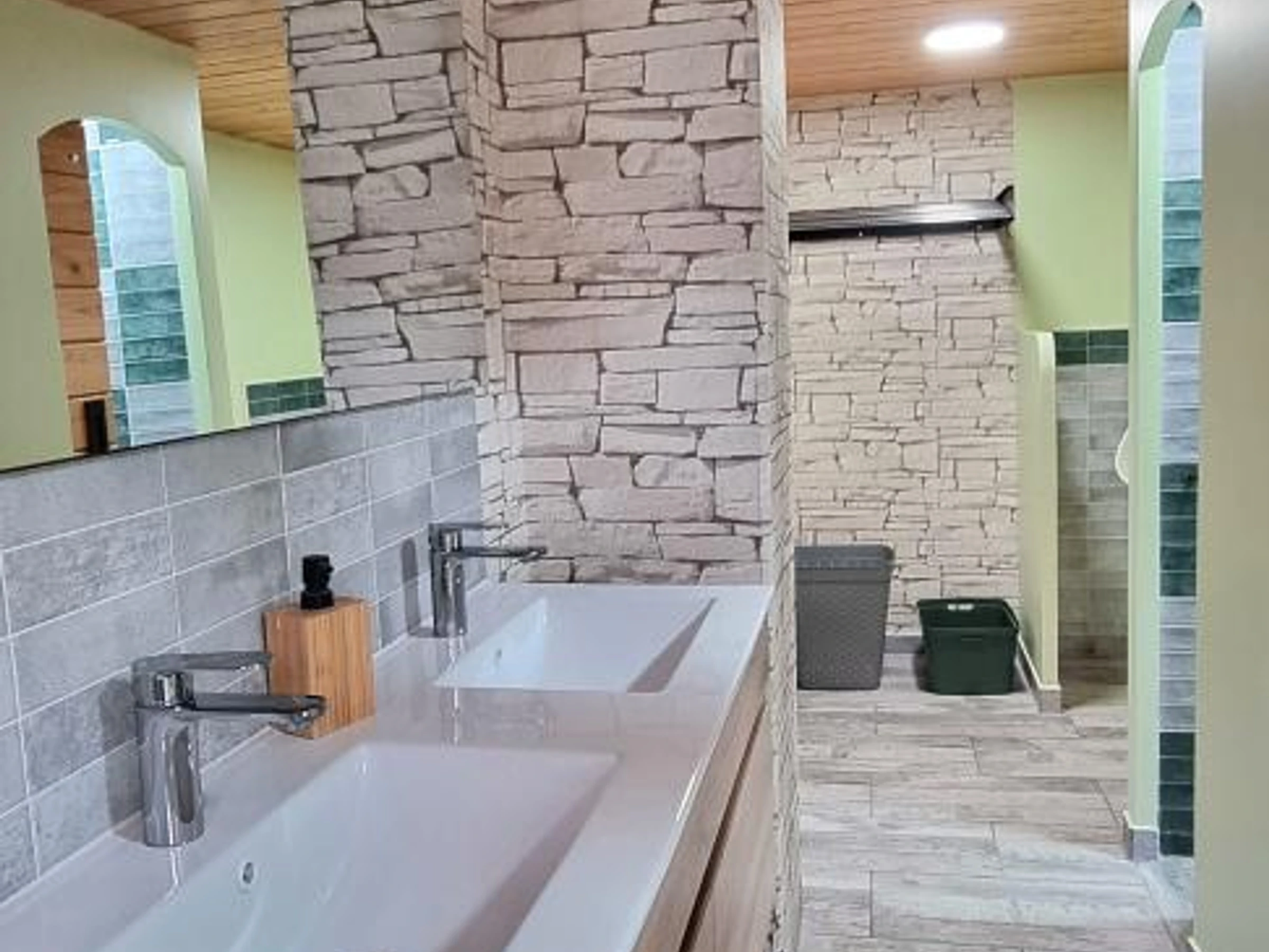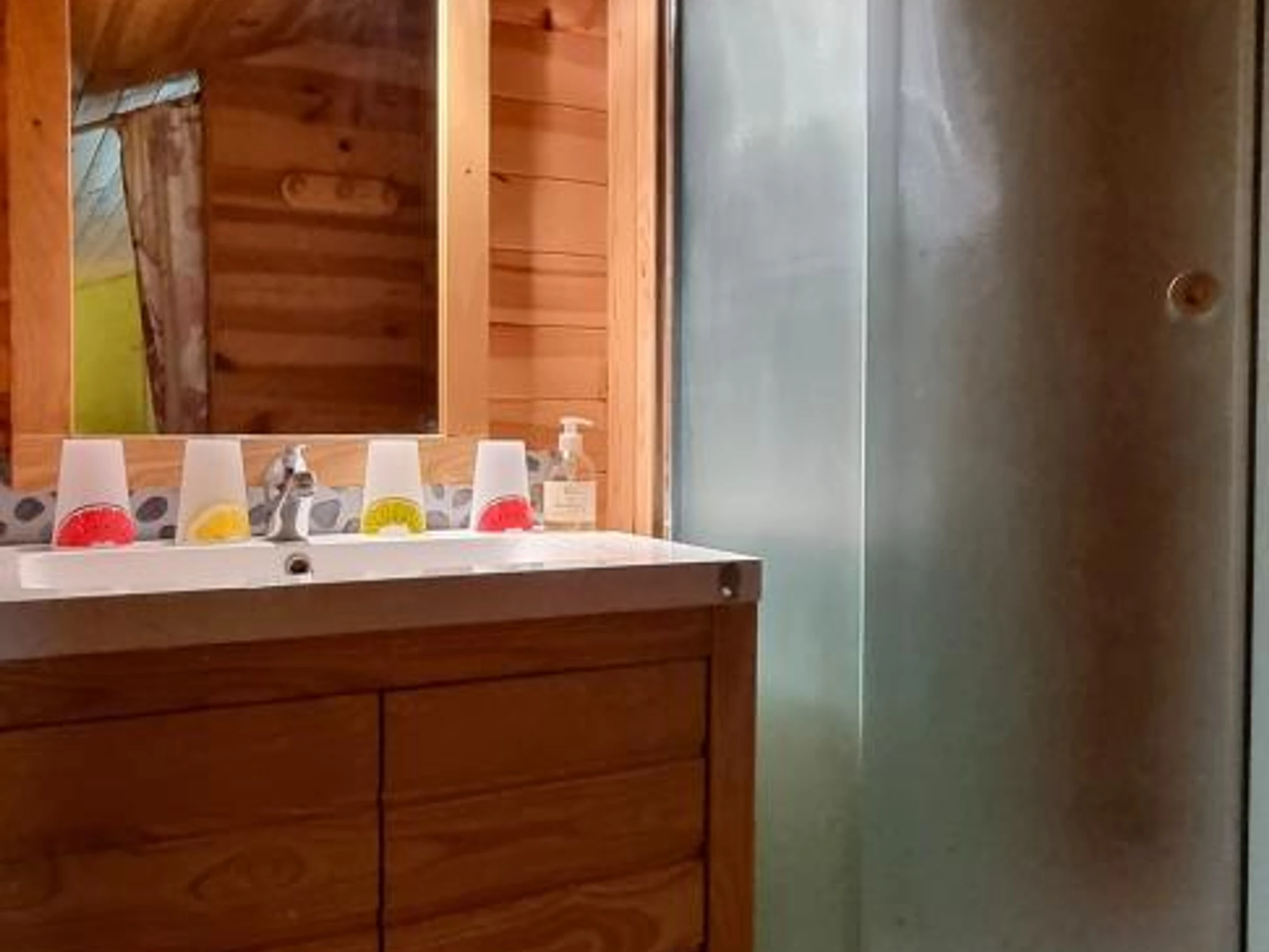 À l'étage, trois chambres sont aménagées : une avec un lit 140x190 et deux avec chacune deux lits 90x190. Ce niveau dispose d'un bloc sanitaire avec trois douches, une double vasque et un WC. Au dernier étage, une grande chambre propose deux lits 90x190 et un lit rond, ainsi qu'une salle d'eau.