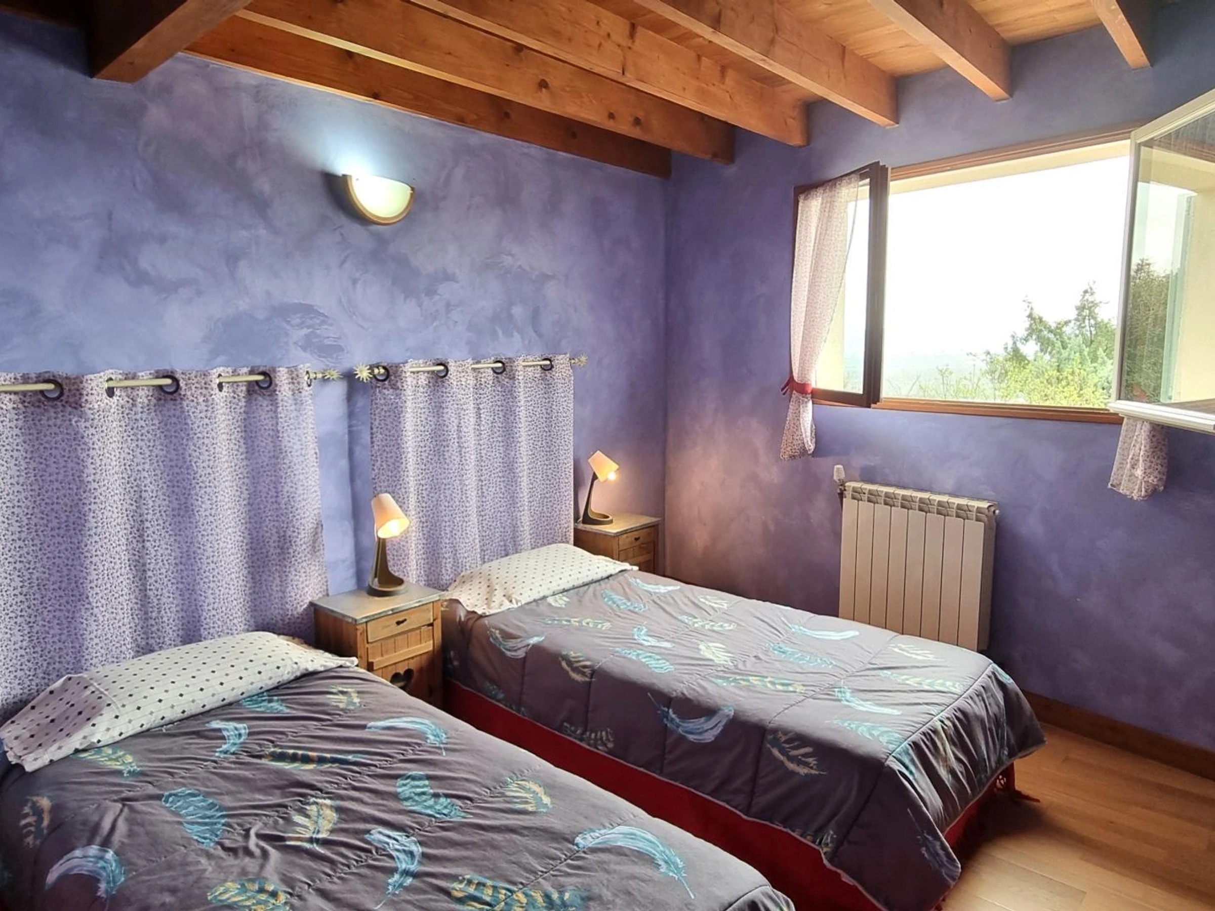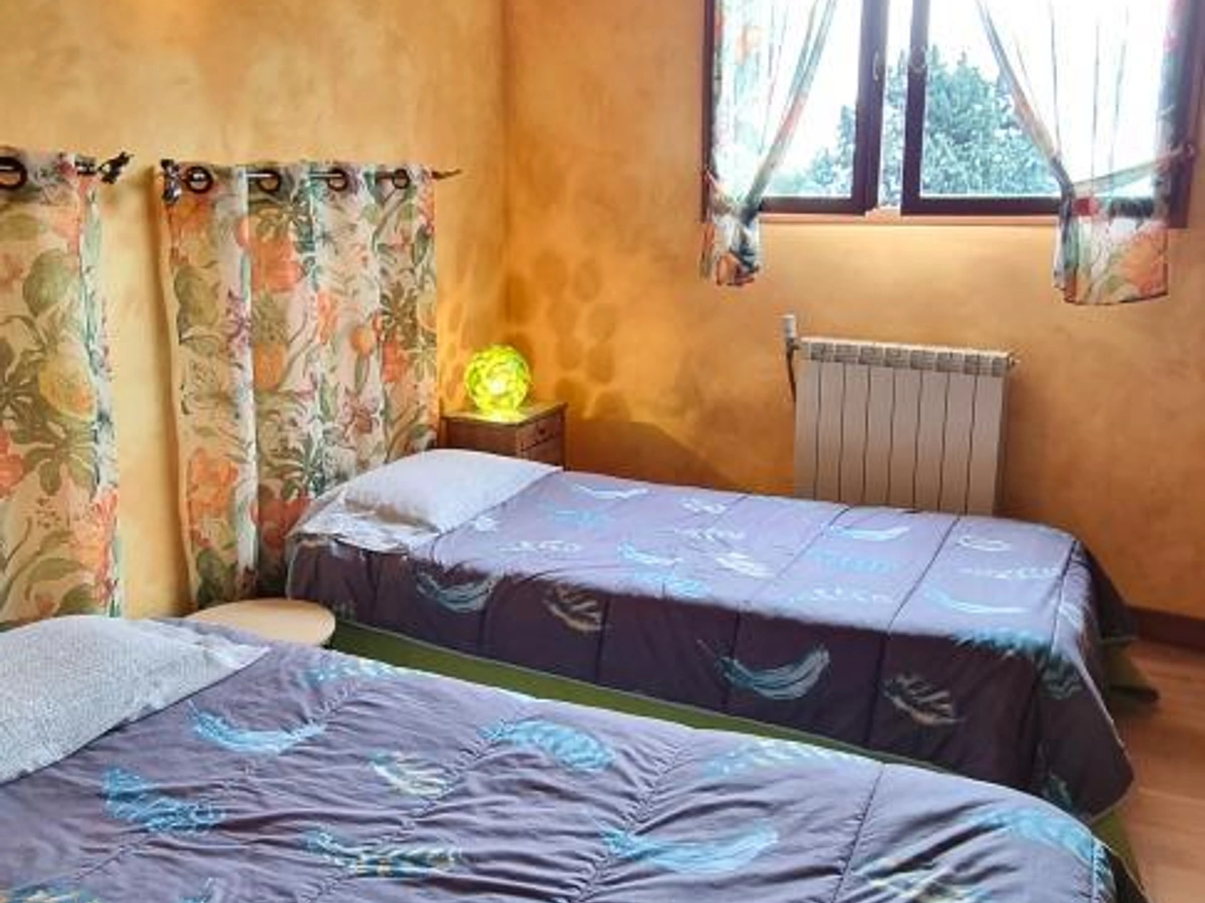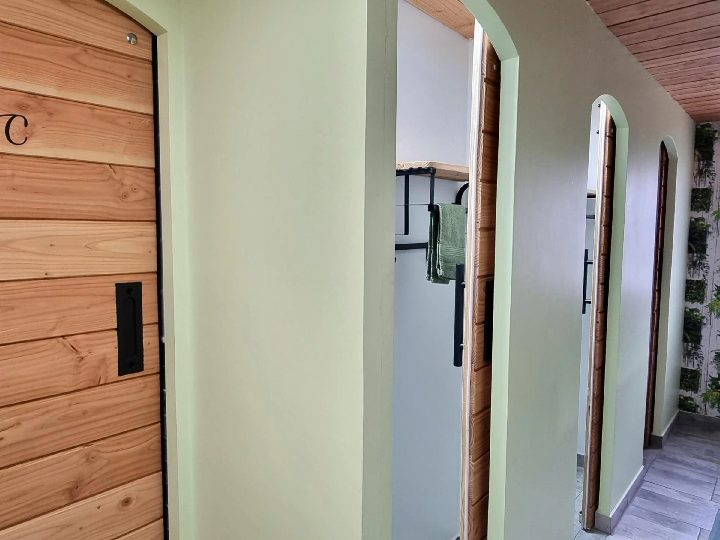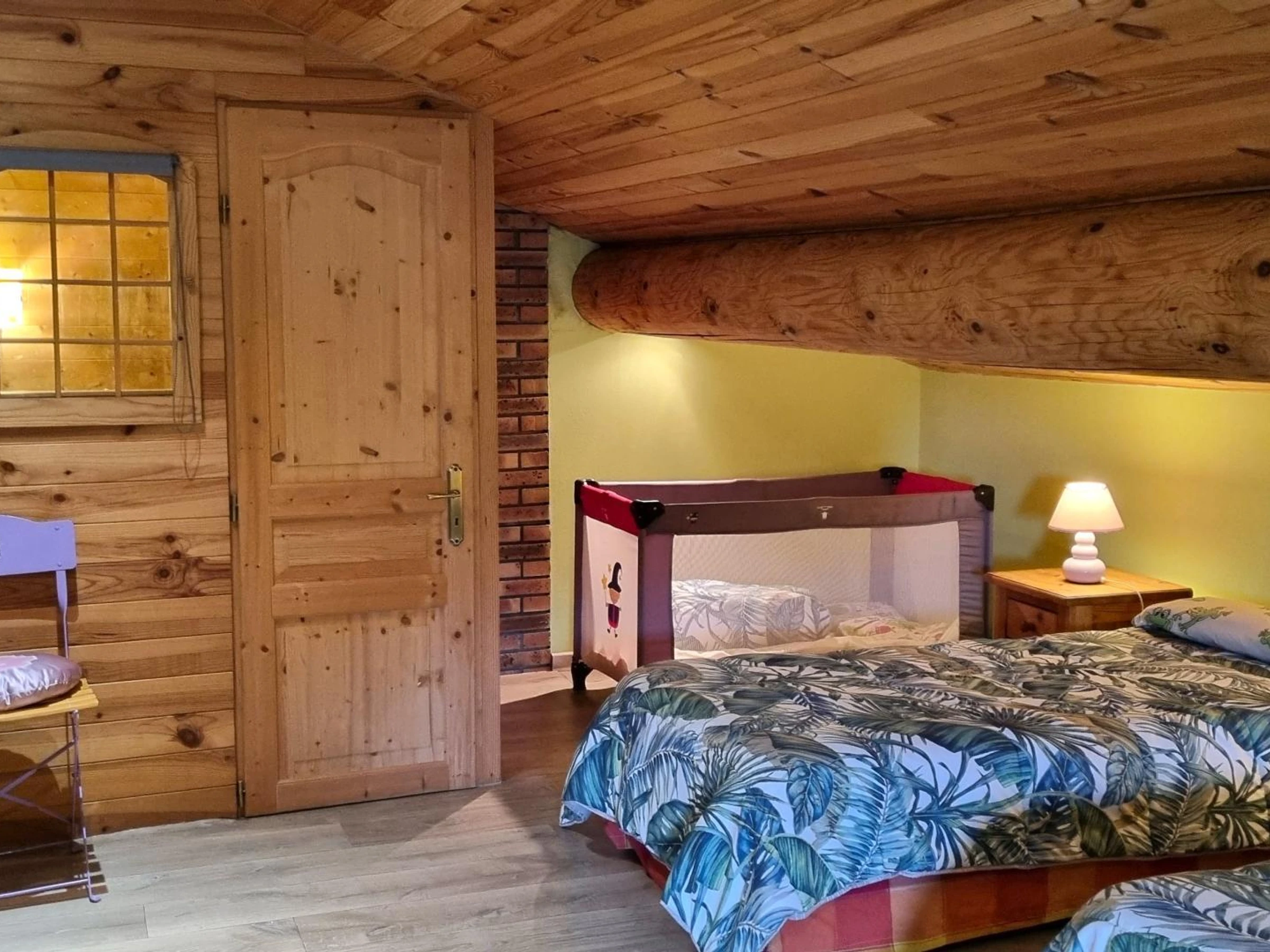 À l'étage, trois chambres sont aménagées : une avec un lit 140x190 et deux avec chacune deux lits 90x190. Ce niveau dispose d'un bloc sanitaire avec trois douches, une double vasque et un WC. Au dernier étage, une grande chambre propose deux lits 90x190 et un lit rond, ainsi qu'une salle d'eau.
