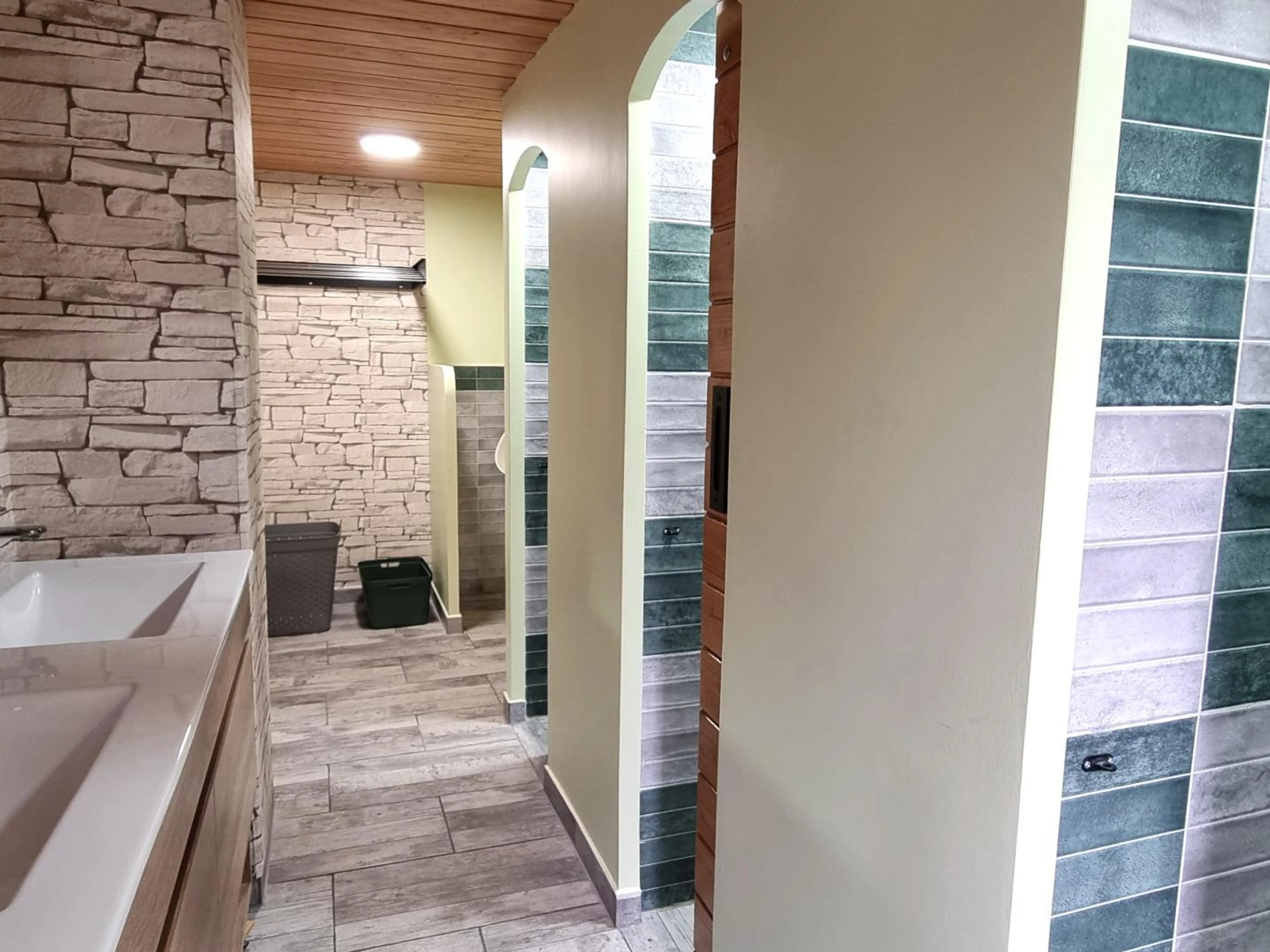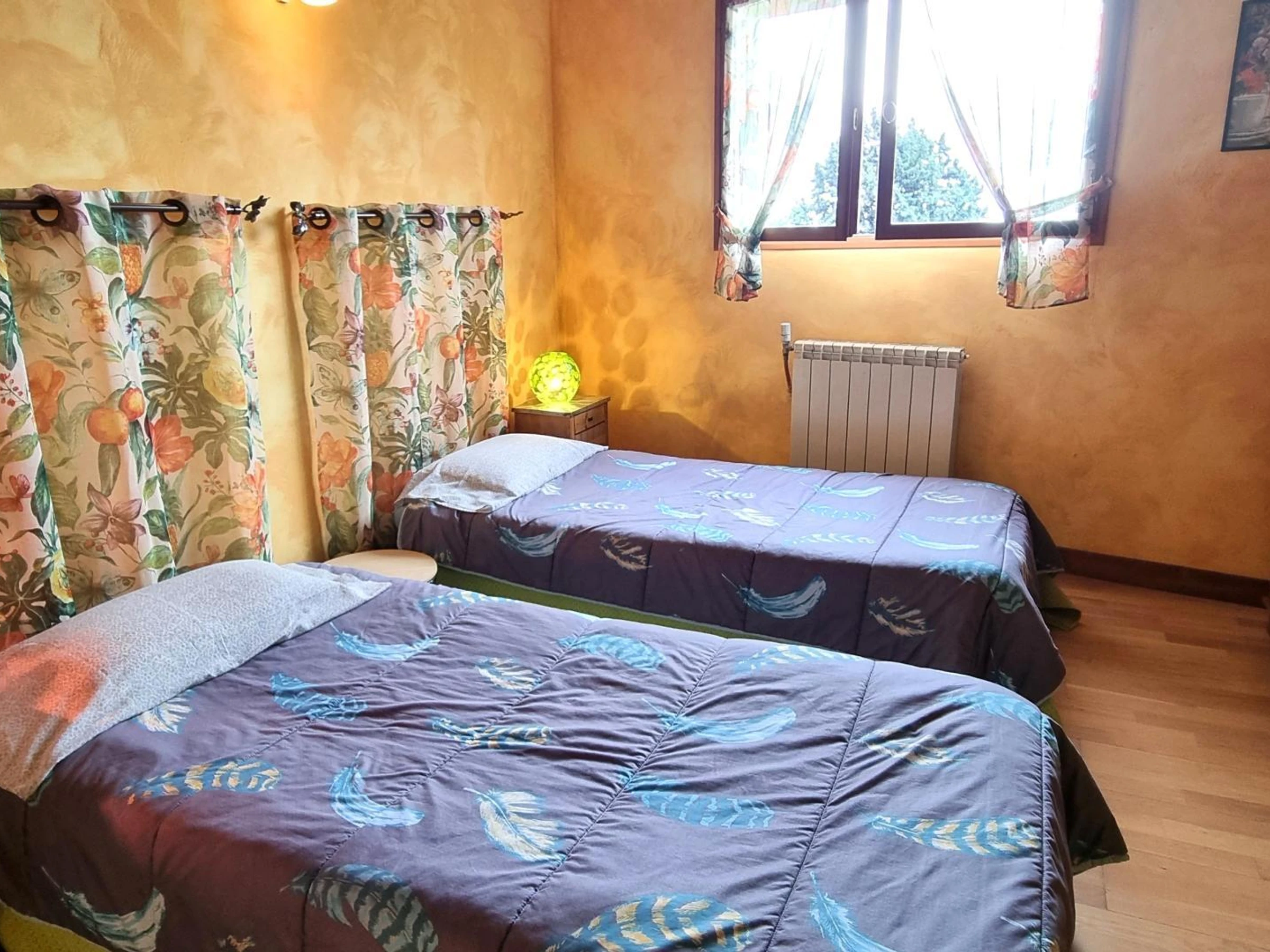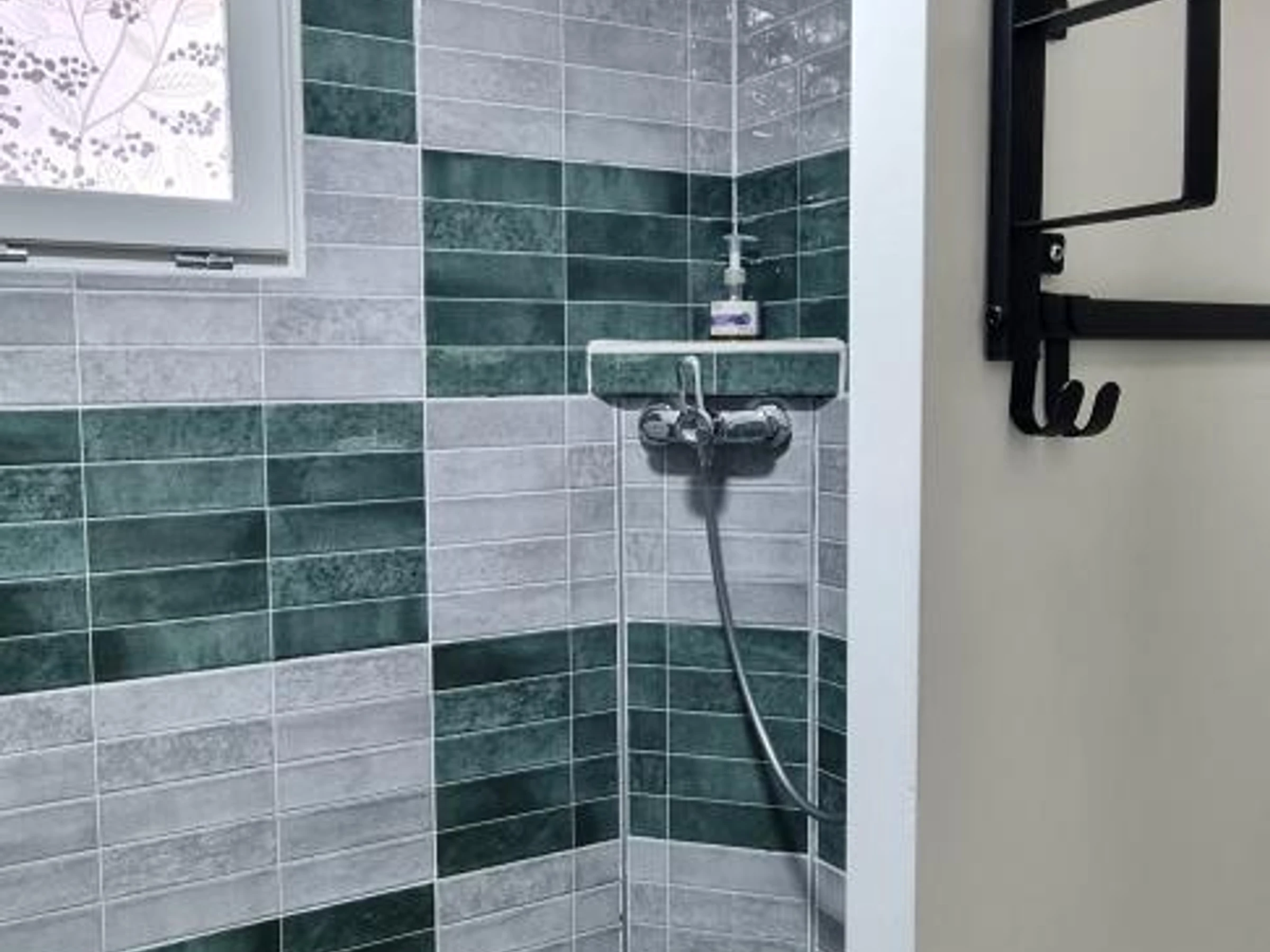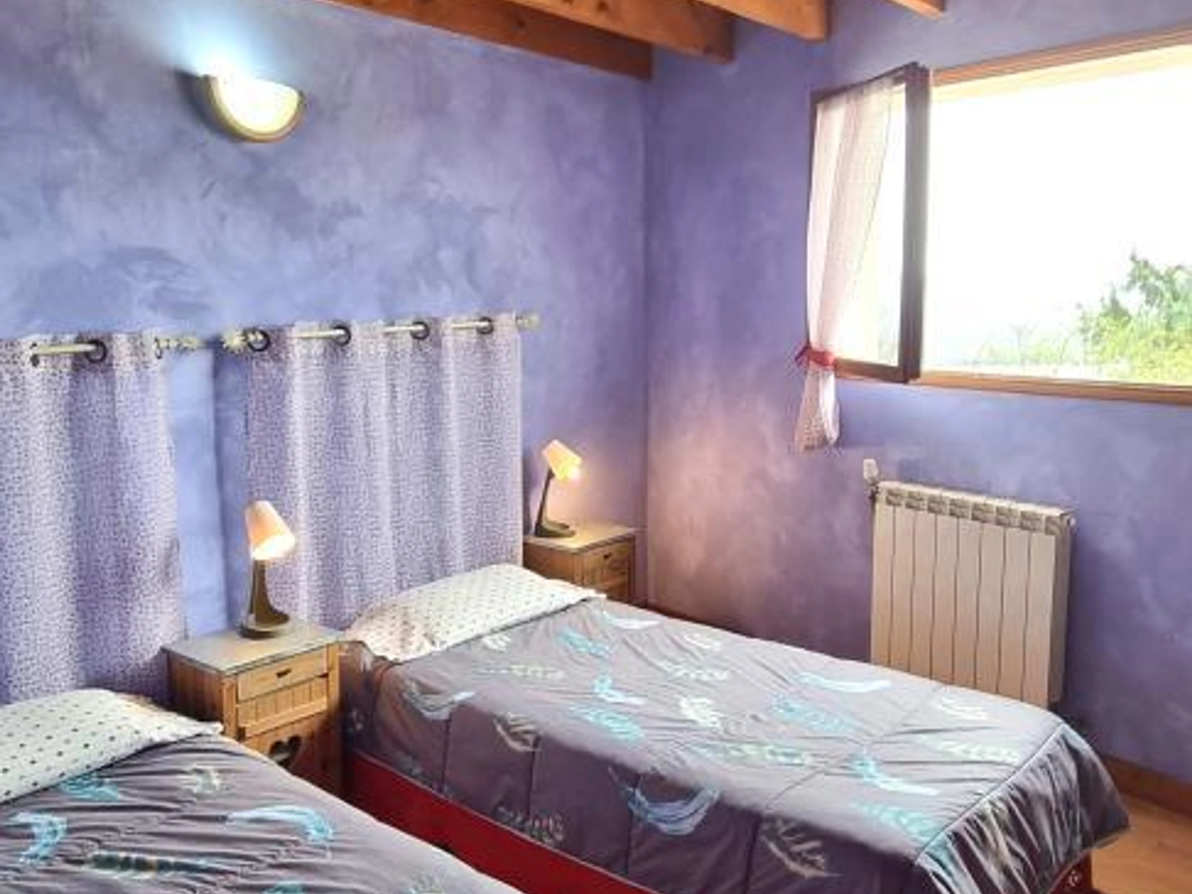 À l'étage, trois chambres sont aménagées : une avec un lit 140x190 et deux avec chacune deux lits 90x190. Ce niveau dispose d'un bloc sanitaire avec trois douches, une double vasque et un WC. Au dernier étage, une grande chambre propose deux lits 90x190 et un lit rond, ainsi qu'une salle d'eau.