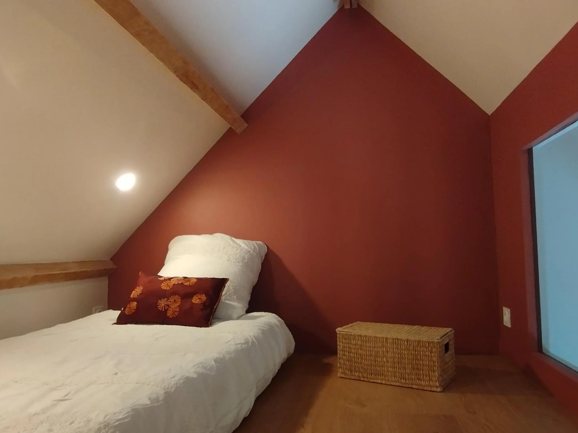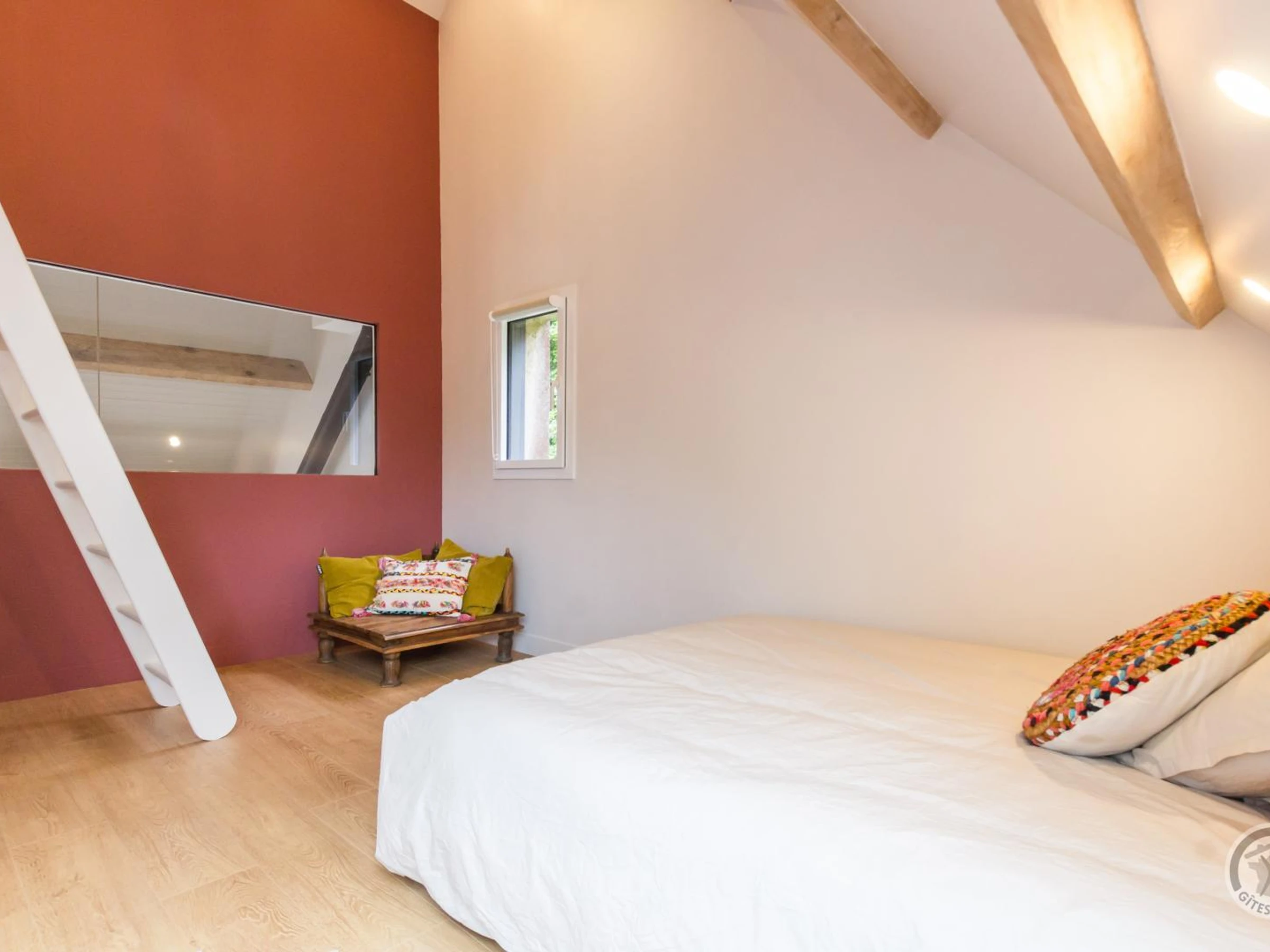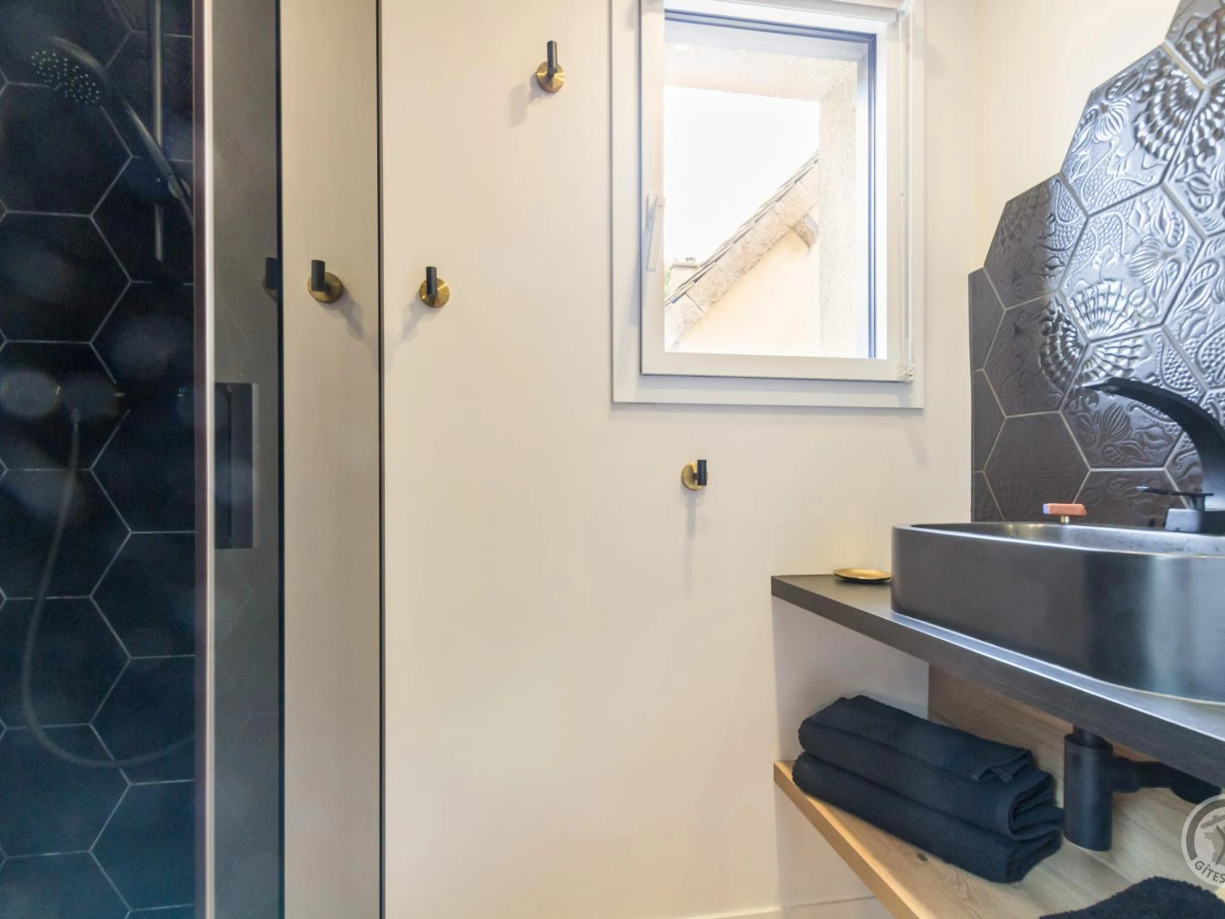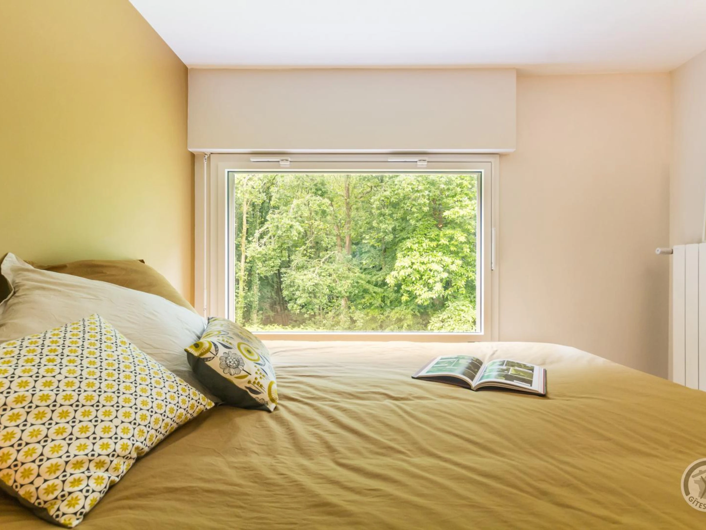 Maison indépendante. Séjour avec poêle à bois ( bois fourni d'oct à mars). TV, Internet, enceinte bluetooth. Cuisine ouverte sur séjour (cuisson feux gaz, four, micro-ondes, lave-vaisselle, réfrigérateur avec congélation). Wc. Ch 1 (lit 160x200) avec salle d'eau privée (plan vasque, douche italienne). A l'étage, palier, ch2 ( lit 140x190) avec salle d'eau privée (plan vasque, douche) et échelle de meunier donnant accès à une niche en mezzanine avec lit 1 pers (90x190). Equipement bébé sur demande. Chauffage inclus. Ttes charges comprises. Draps et linge de maison fournis. Lits faits à l'arrivée. Pas de lave-linge mais les propriétaires proposent un service blanchisserie sur demande. Service ménage en supplément. Du 1er mai au 1er octobre : piscine intérieure chauffée (8x5m) partagée avec les propriétaires (non disponible le reste de la saison). Terrasse privée bordée d'un bassin d'agrément. Salon de jardin.Transats. Barbecue. Parc boisé de 4ha commun . Terrain non clos. Parking. Tel un grand vaisseau posé dans la clairière, cette imposante construction des années 80 regarde vers la mer et la rade. Un coup de coeur enrichi d'une bonne dose de courage et un brin de folie, voilà Nolwenn et sa famille propriétaires de ce domaine boisé et parés à redonner vie à ce lieu magique! Ils vous invitent à profiter du confortable duplex entièrement rénové et repensé et à partager la magnifique piscine intérieure et son incroyable verrière qui sépare les 2 maisons. Depuis le bassin, la vue sur la mer est remarquable et de l'autre côté, c'est un véritable tableau végétal. A la floraison des rhodos, le décor est sublime. Une chambre par niveau avec chacune son sanitaire permet aux couples une intimité très préservée. Ce bel écrin de verdure est en bordure du golf de Cherbourg (9 trous). Vous pourrez rejoindre aisément Tourlaville par le beau château des Ravalets et atteindre le littoral tout proche.