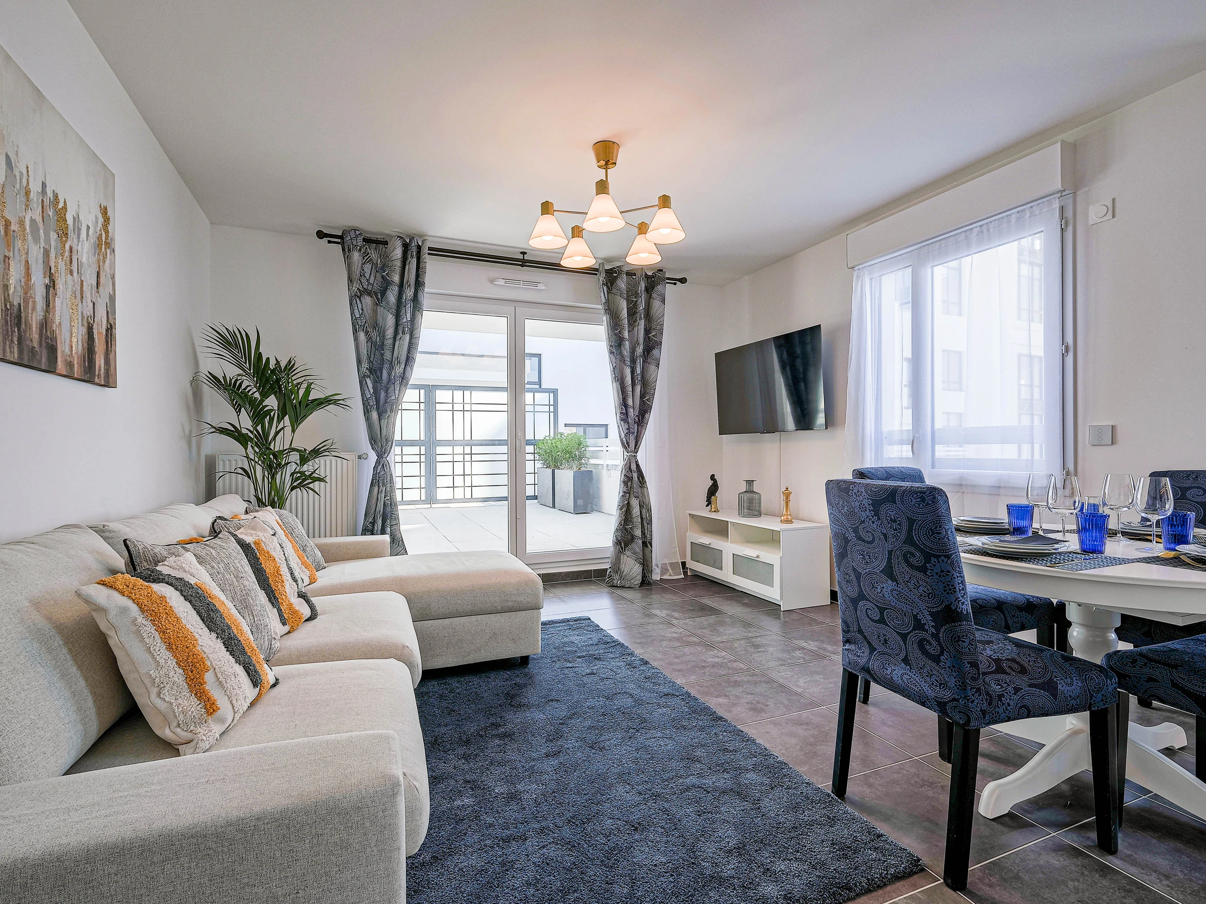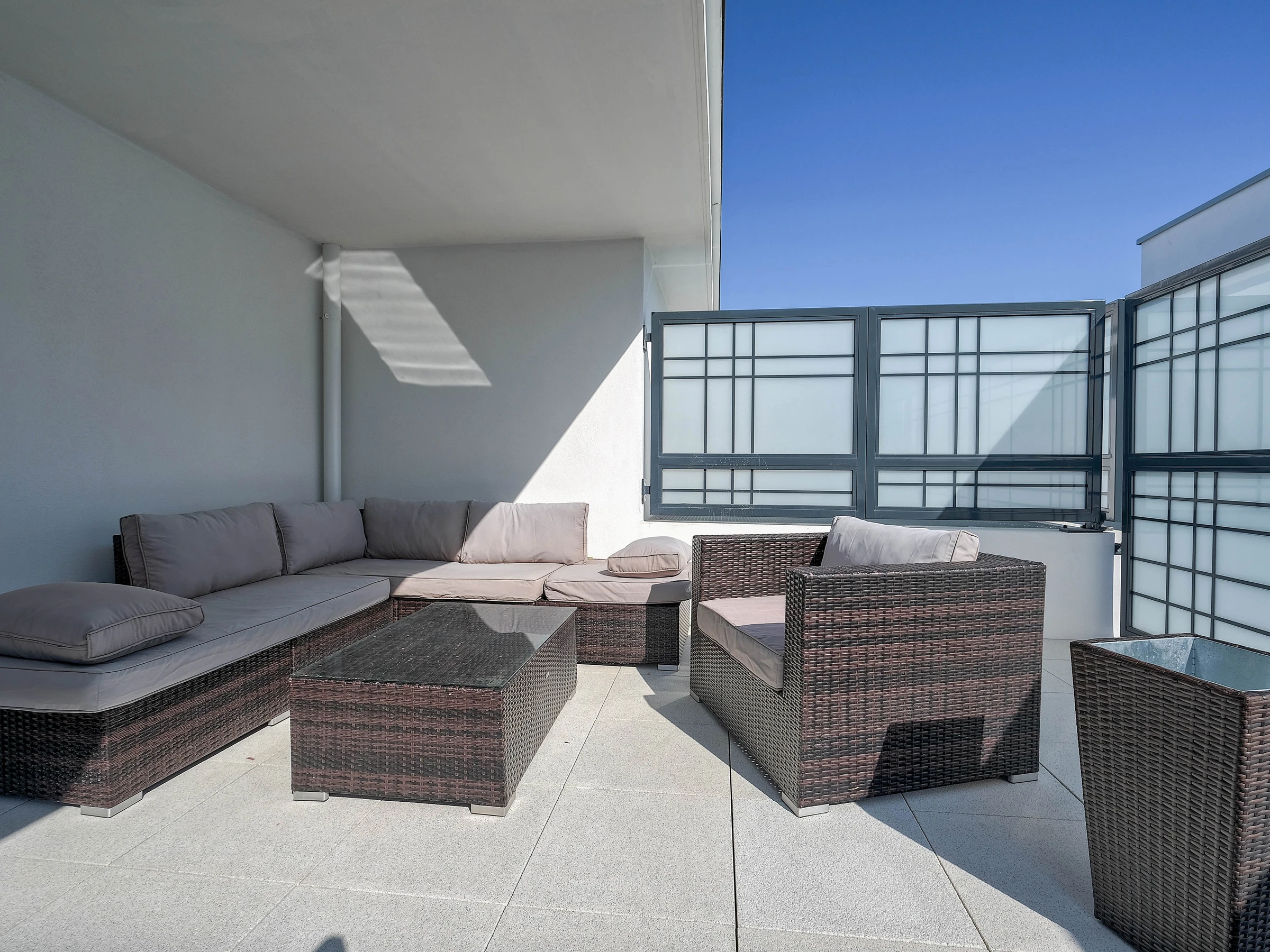 Bel appartement lumineux de 64 m² avec grande terrasse privée. Il comprend deux chambres confortables, un salon avec télévision à écran plat, une cuisine entièrement équipée (four, plaques induction, micro-ondes, lave-vaisselle, machine à café, bouilloire, vaisselle complète) ainsi qu’une salle de bains avec baignoire et sèche-cheveux. Lave-linge, table et fer à repasser sont à disposition.
