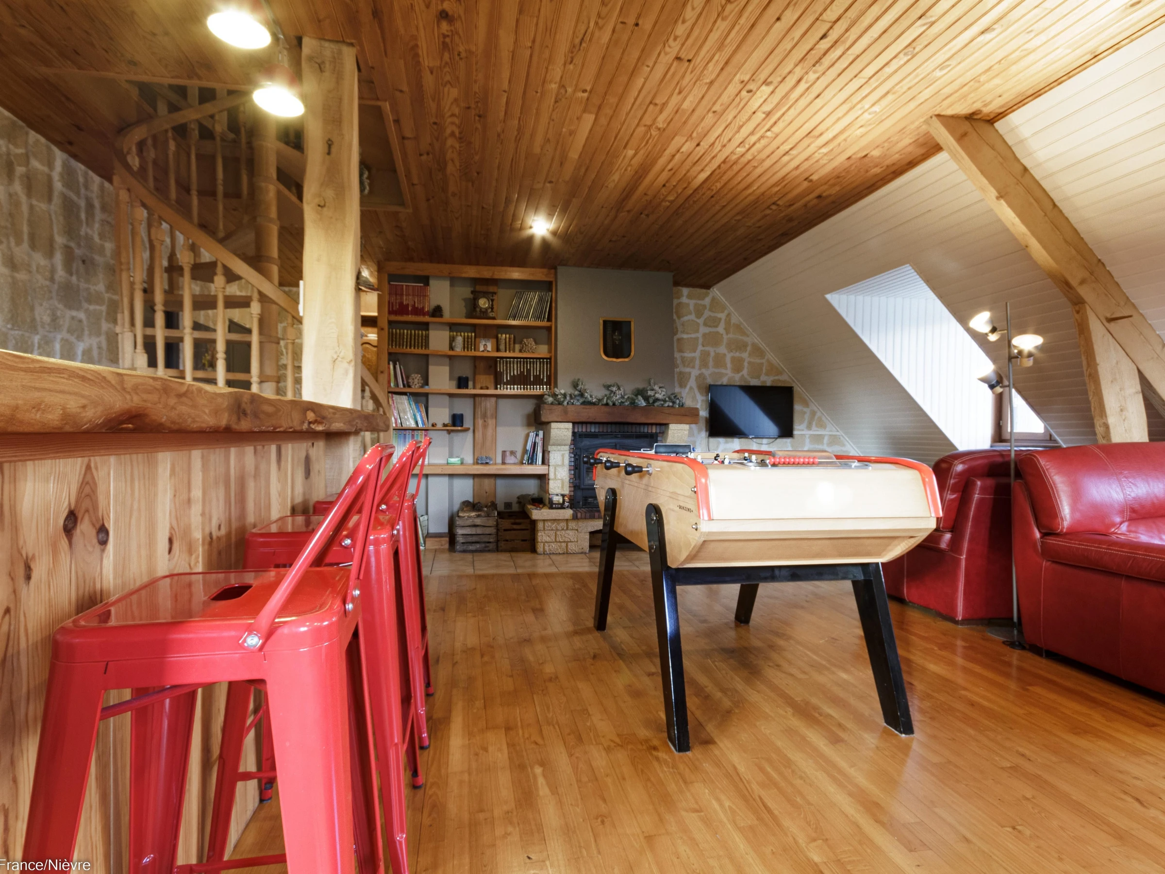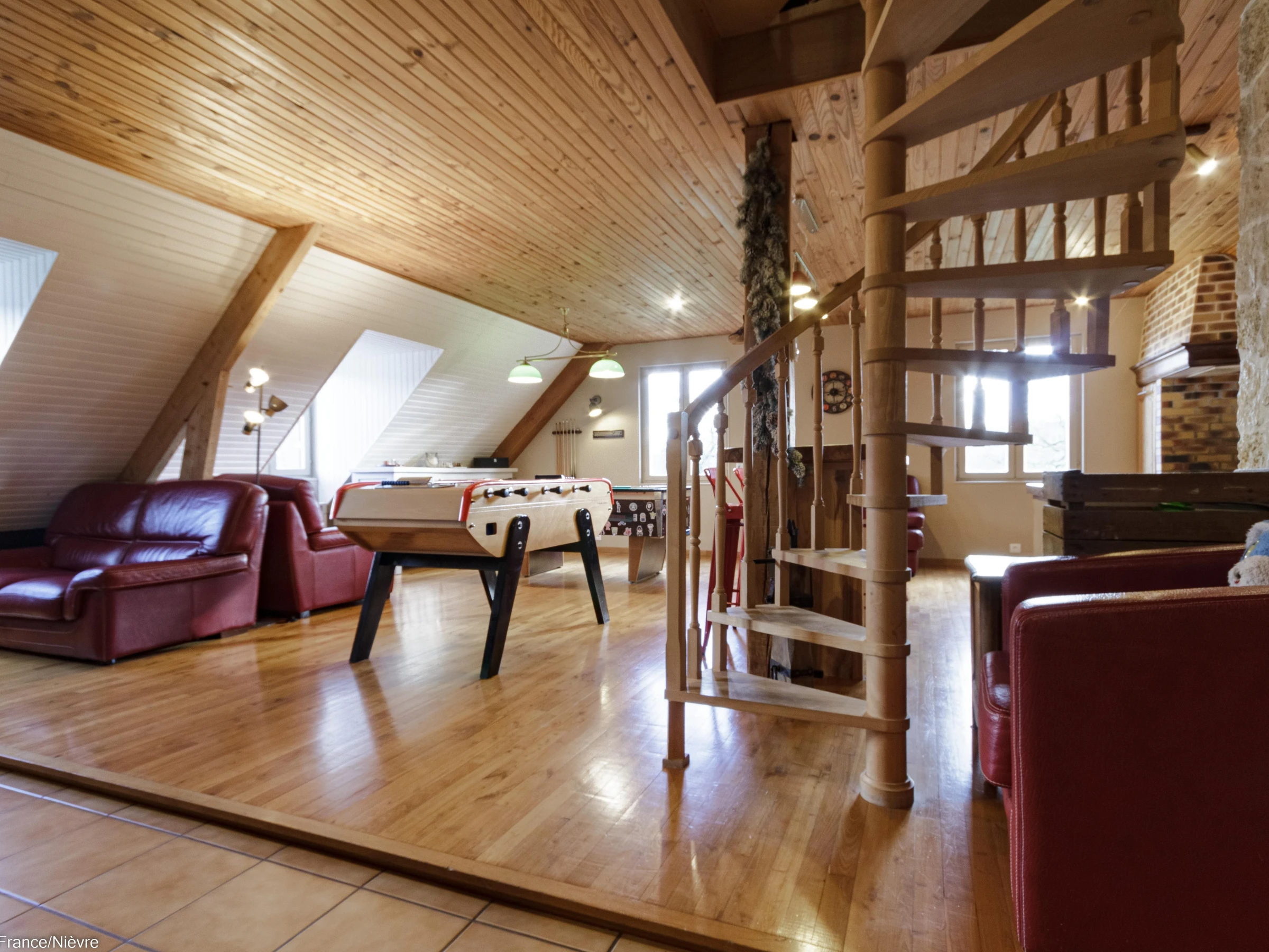 Au 1er étage : 2 chambres ayant chacune 1 lit 160x200, wc indépendant, 1 salle d'eau avec douche grande dimension et double vasque; une grande pièce à vivre (bibliothèque, babyfoot et billard).