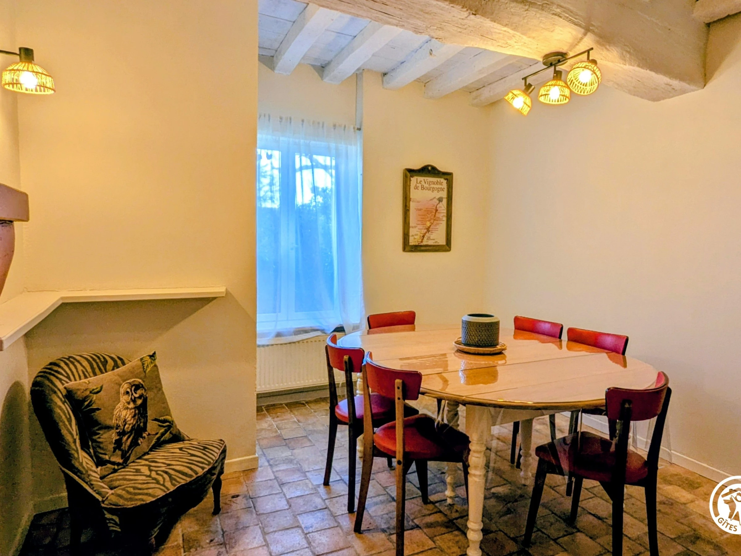 Dans un petit village calme à 5 kms de Seurre, le gîte "Le Jardin Suspendu", mitoyen à la maison de la propriétaire, vous offre : au rez-de-chaussée : salon avec beaucoup de charme (briques, tomettes, poutres etc...), avec TV grand écran, wifi, cuisine équipée (cafetière à dosettes Tassimo), salle à manger. A l'étage (escalier un peu raide) : 1 chambre avec 1 lit de 140 cm et salle d'eau privative, avec douche, WC, 1 chambre avec 1 lit de 160 cm avec salle d'eau attenante et WC, accès par quelques marches à une autre chambre avec 2 lits de 90 jumelages. Matériel bébé sur demande (lit parapluie, chaise haute, matelas à langer). A l'avant : une terrasse en bois avec salon de jardin, barbecue. Parking privé 2 places. A l'arrière (accès par un portillon) : grand jardin arboré à partager, avec salon de jardin, transats, petite terrasse, piscine partagée de 10 X 5m, ouverte de Mai à Fin Septembre (selon conditions météo), de 09h00 à 19h00, sécurisée par une alarme. En contrebas, terrain de pétanque (boules fournies) et balançoire pour enfants. Animaux sur demande. Vue imprenable sur la plaine.