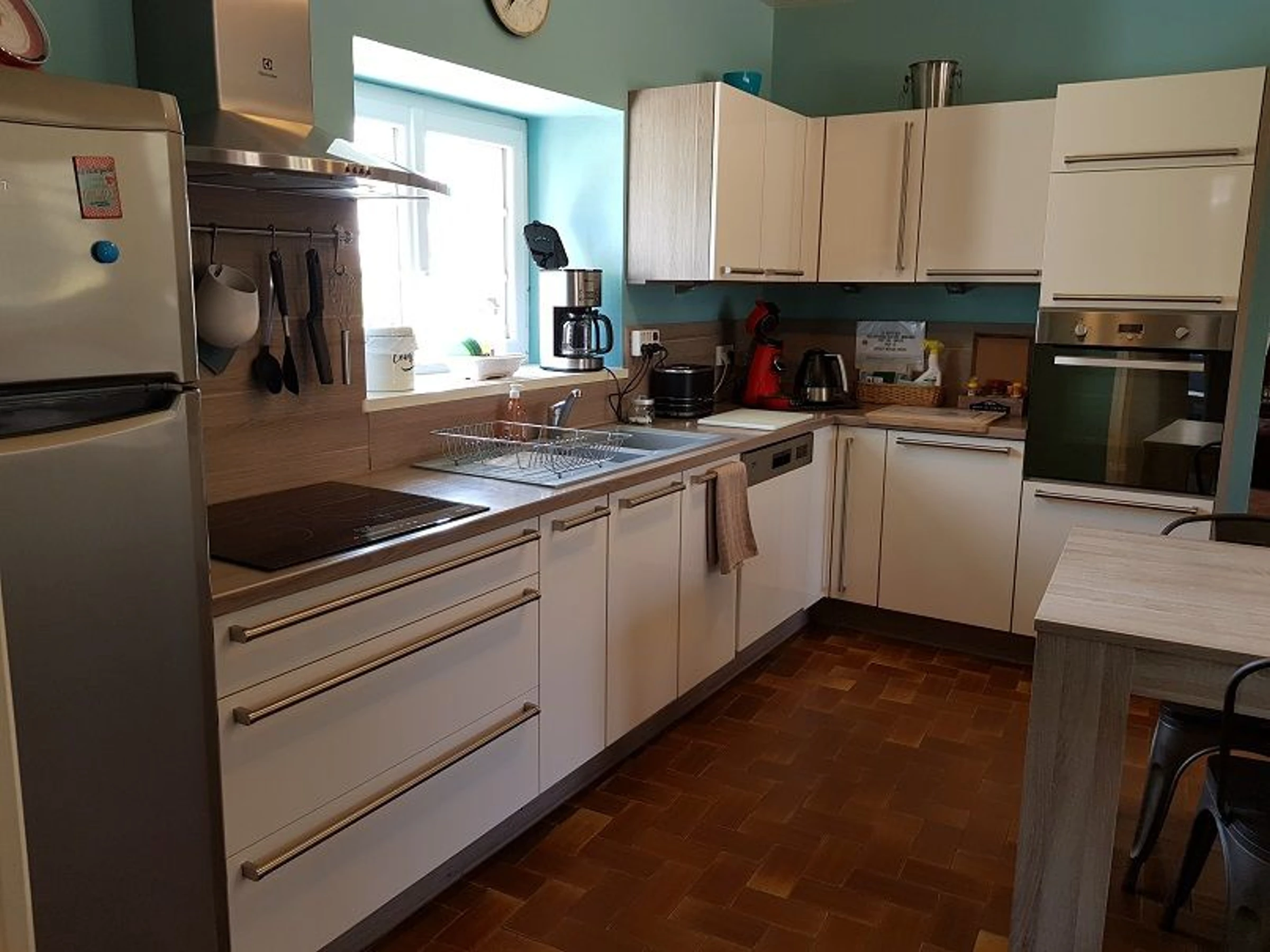 Au RDC : cuisine équipée (29m²) avec cheminée (bois gratuit) - séjour - 2 chambres - salle d'eau/wc - wc séparés - buanderie.
