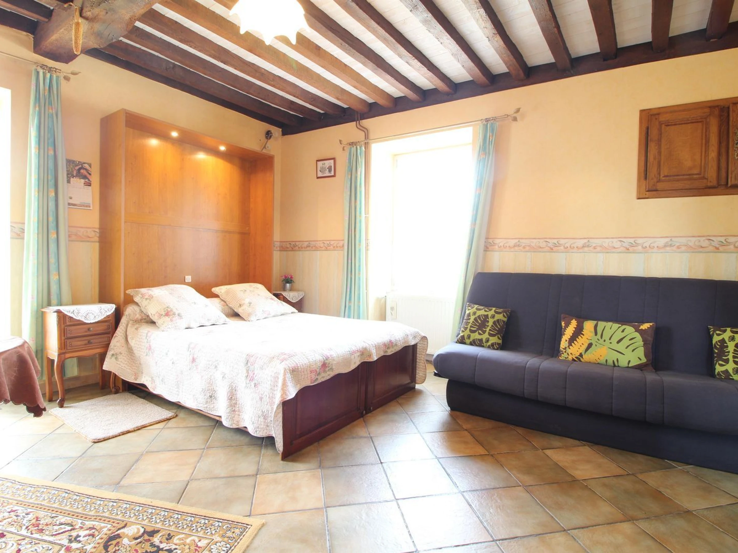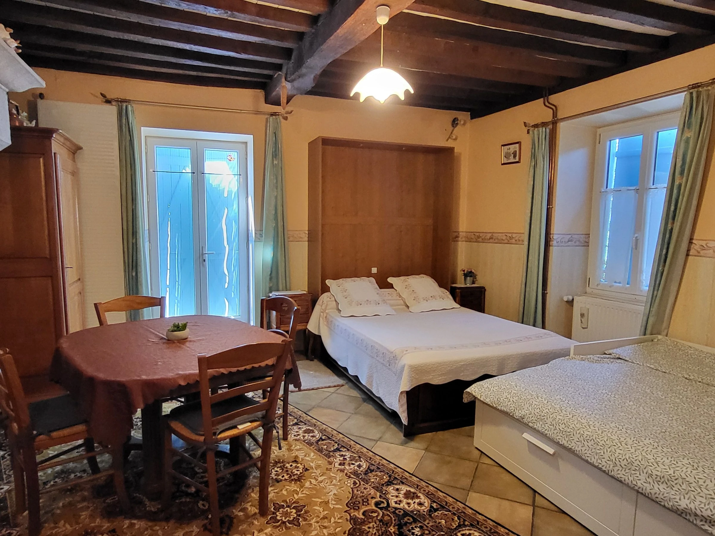Local abrité et bétonné pour motos et vélos, cour fermée. La chambre comprend un lit double de 140 cm et un canapé lit pour 2 personnes avec une salle de bain et WC