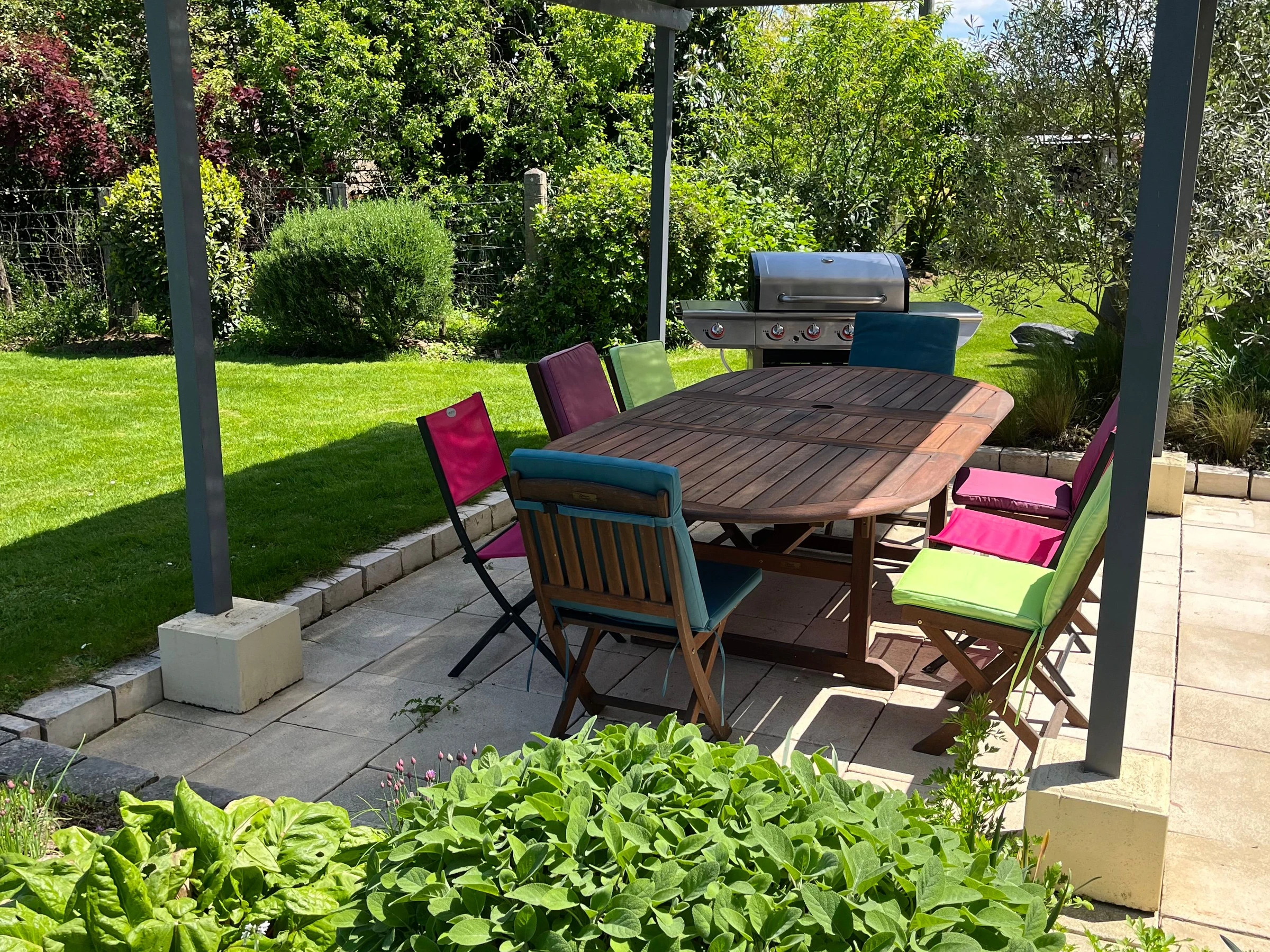 A l'extérieur à l'avant une cour privative avec la possibilité de garer plusieurs véhicules et à l'arrière une terrasse protégée par une pergola et un grand jardin privatif avec un potager et un verger.