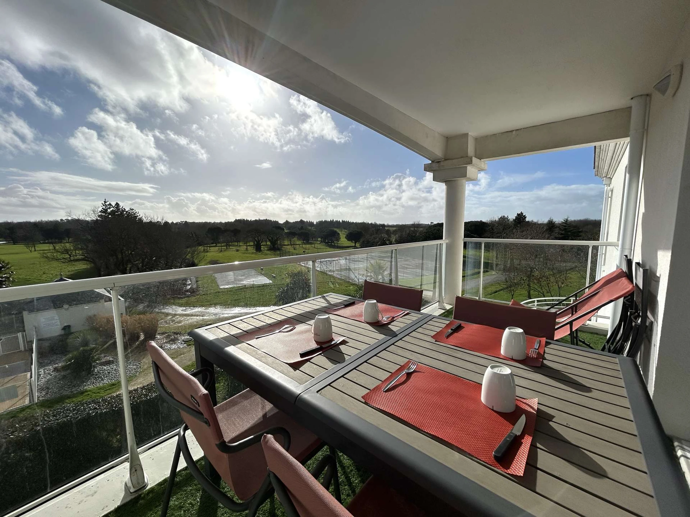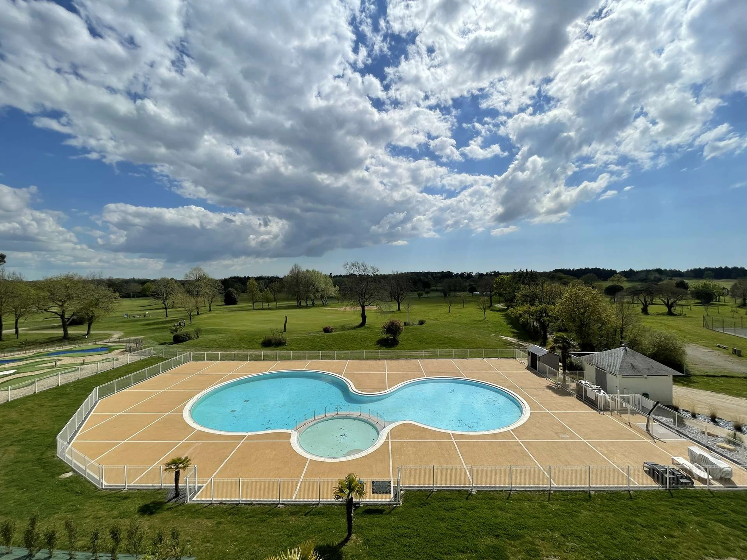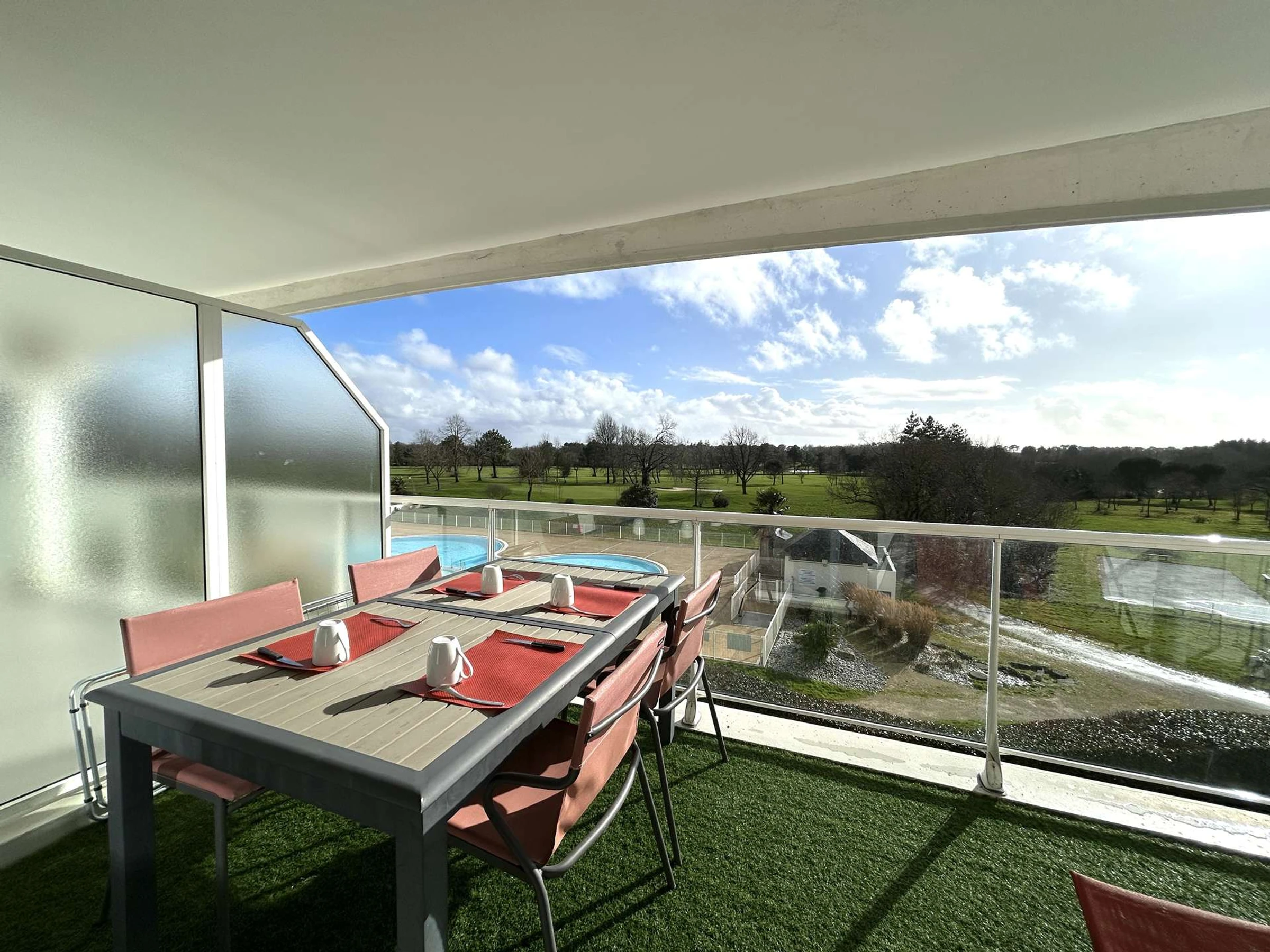 Les Plus de cette location de vacances : un balcon avec salon de jardin offrant une vue dégagée sur la piscine et le golf, un parking privatif en sous-sol, ainsi qu’une piscine chauffée et sécurisée, ouverte de juin à mi-septembre.