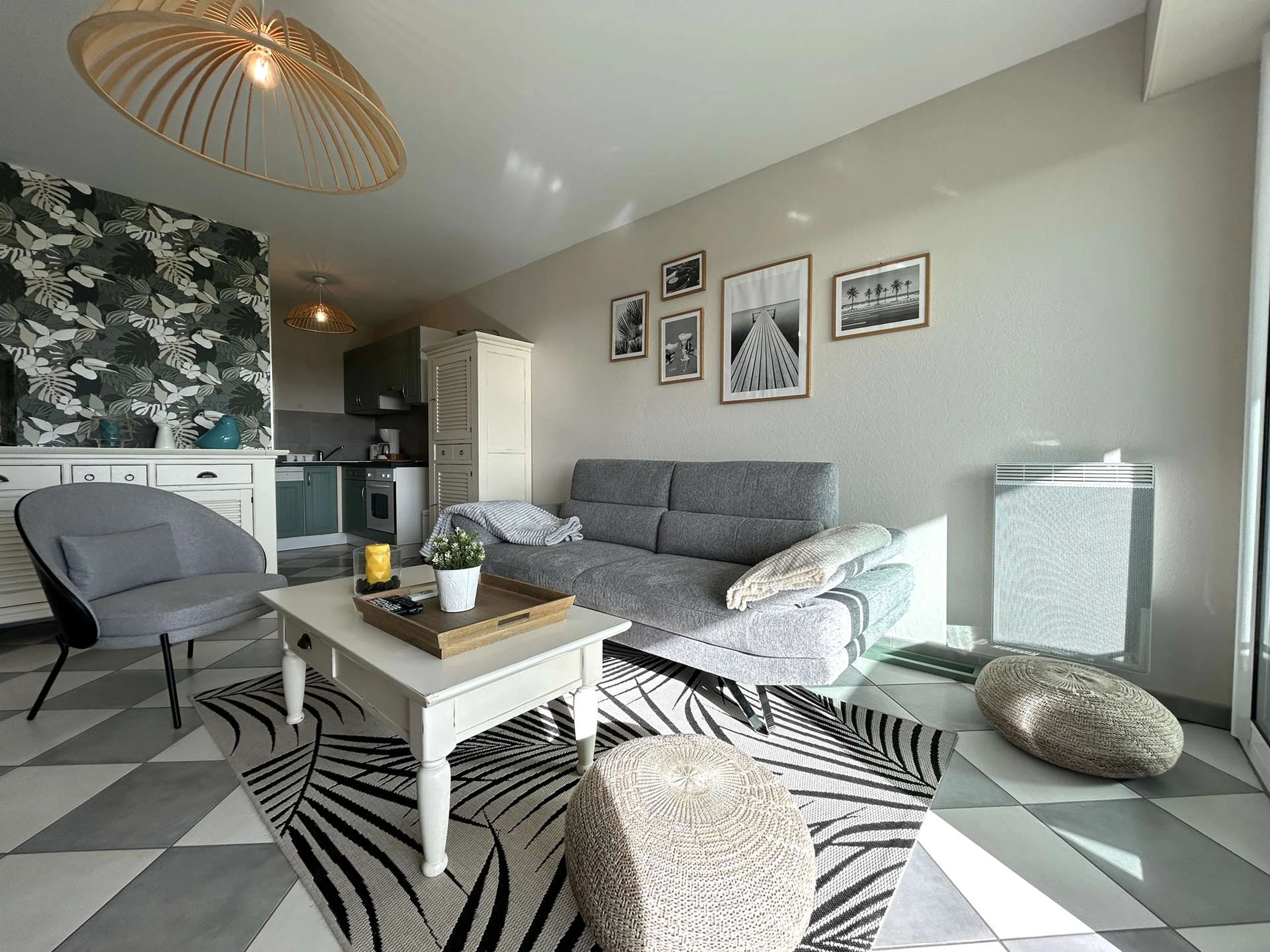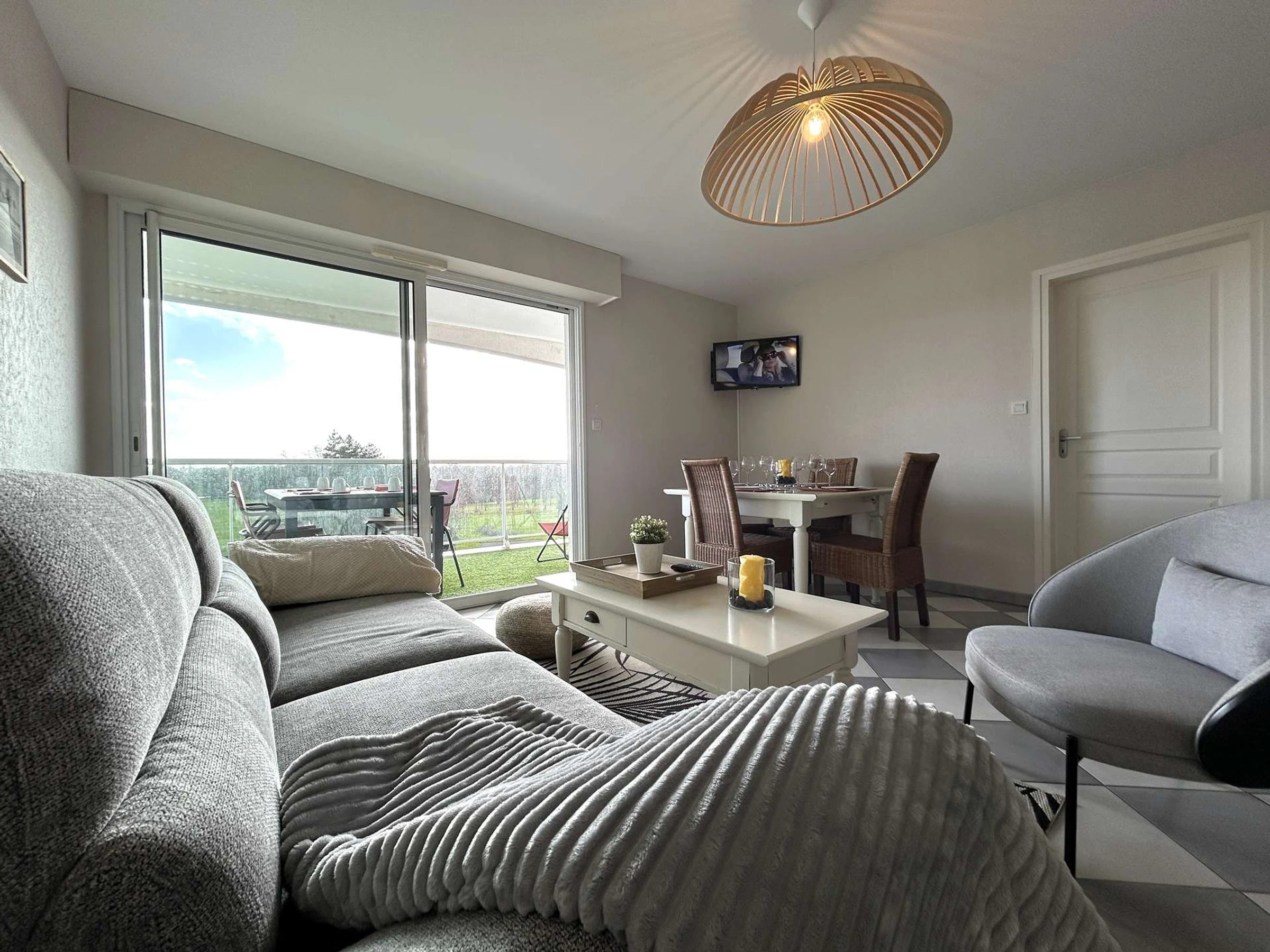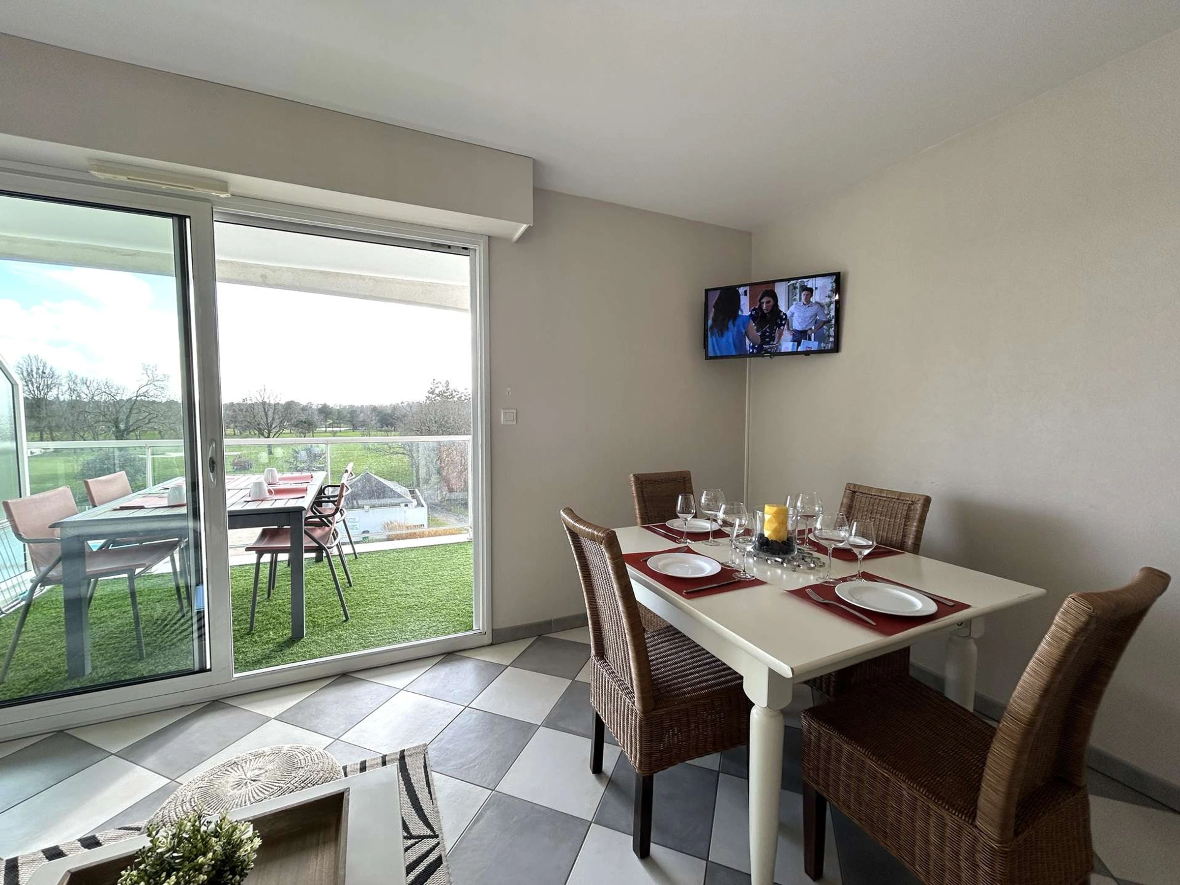 Les Plus de cette location de vacances : un balcon avec salon de jardin offrant une vue dégagée sur la piscine et le golf, un parking privatif en sous-sol, ainsi qu’une piscine chauffée et sécurisée, ouverte de juin à mi-septembre.