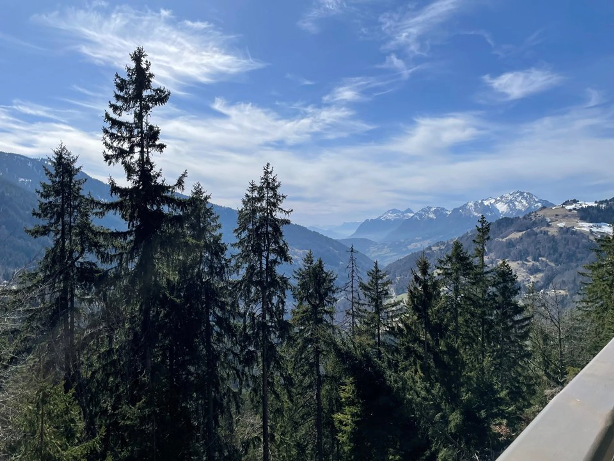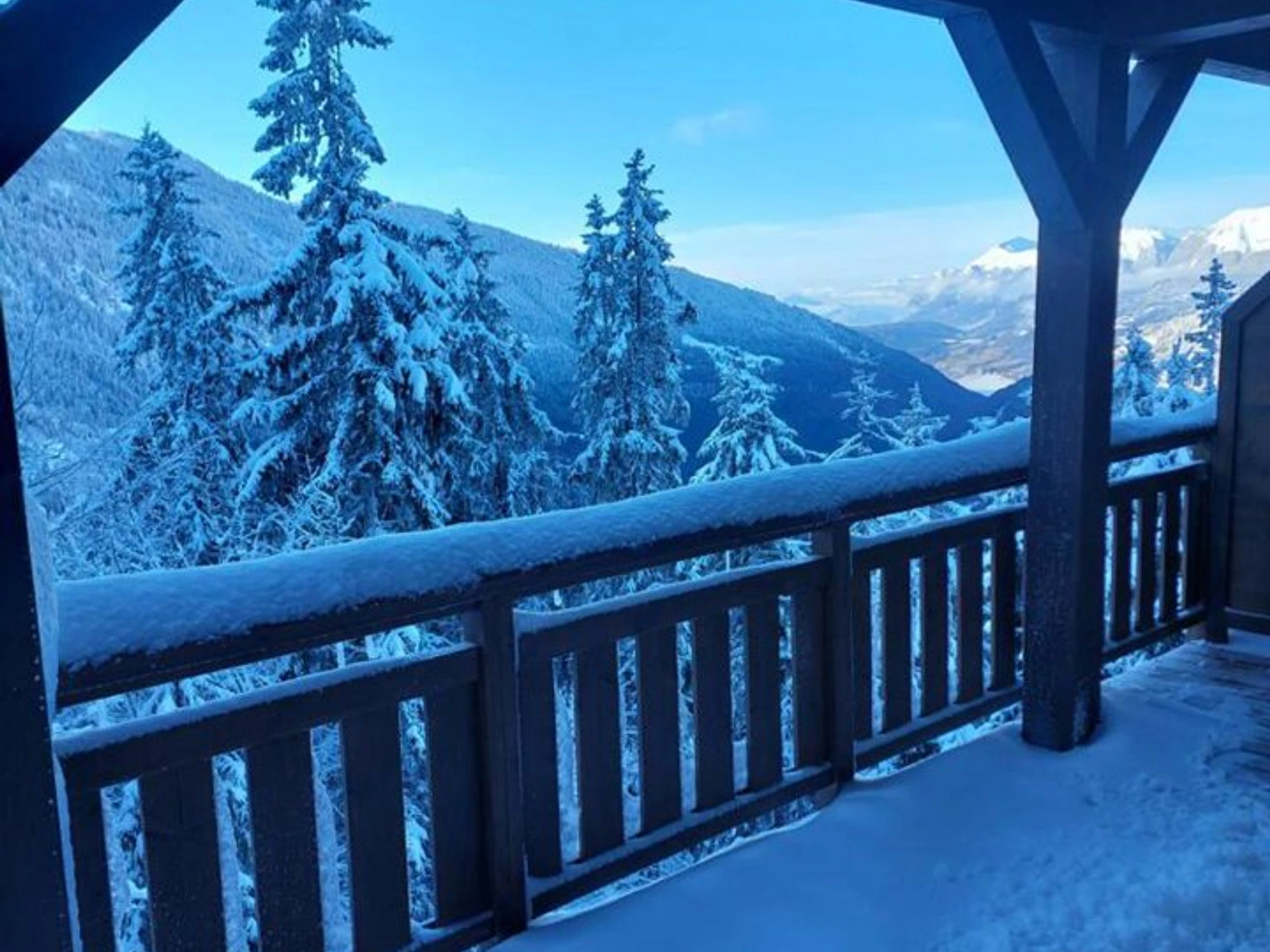 Terrasse de 15 m² exposée plein Sud sans vis-à-vis avec vue magnifique sur vallée et forêt.