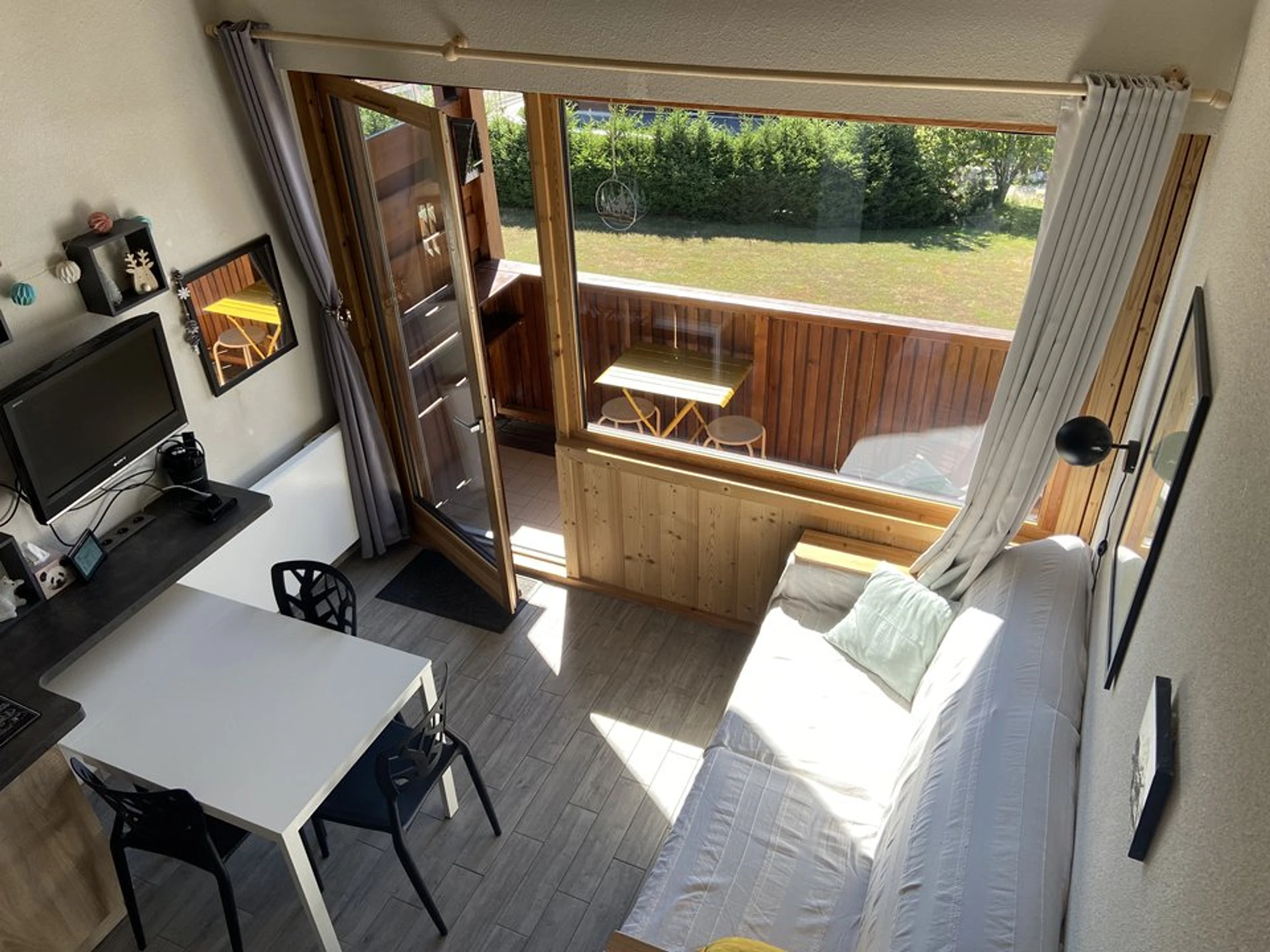 Pièce principale: canapé, TV, table à manger