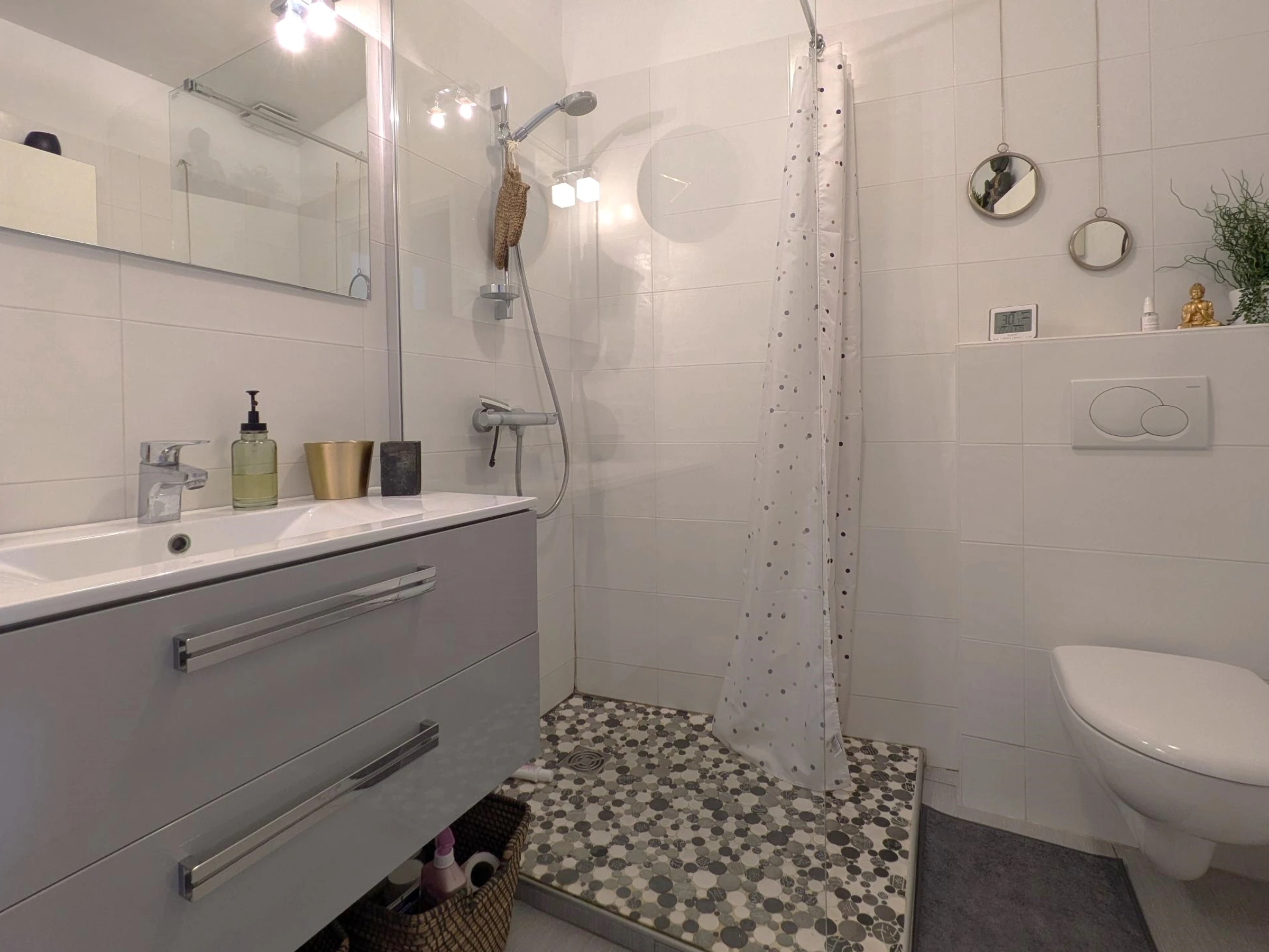 Vous accédez à la maison par le rez-de-chaussée avec un espace de rangement avec lave-linge et une pièce d'eau avec lavabo et toilette.