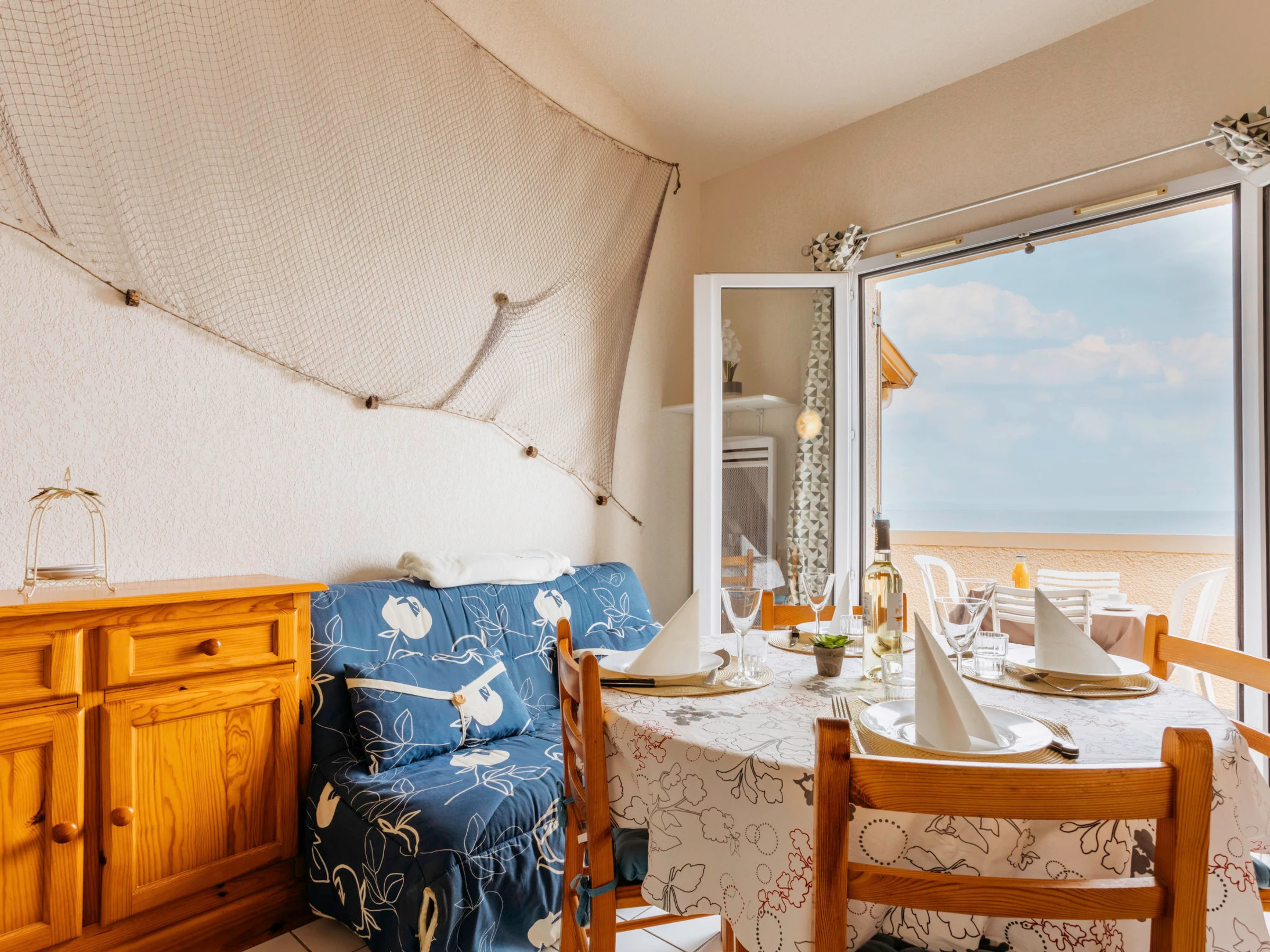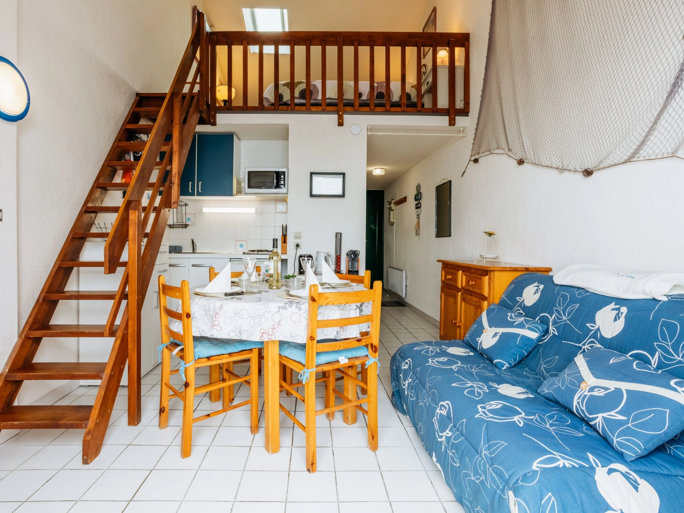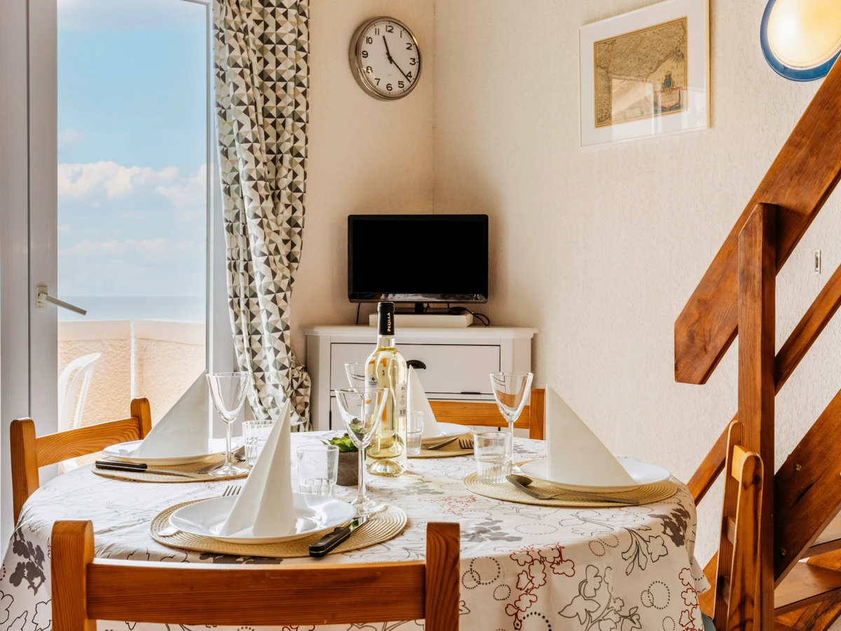 Apt 2 pièces 24 m2 sur 2 niveaux au 2ème étage. Séjour/salle à manger avec TV (écran plat). Sortie sur le balcon. 1 petite chambre avec 1 divan-lit double (140 cm, longueur 190 cm). Coin cuisine (2 plaques de cuisson, grille-pain, micro-ondes, cafetière électrique). Douche, WC séparé. À l'étage supérieur: (escalier raide) galerie mansardée avec 1 grand-lit (160 cm, longueur 200 cm). Balcon 6 m2. Mobilier de balcon. Superbe vue sur la mer. Garage. Veuillez noter: détecteur de fumée. Au lieu d'une chambre fermée, des espaces de couchage sont situés dans un zone ouverte (galerie, alcôve...).