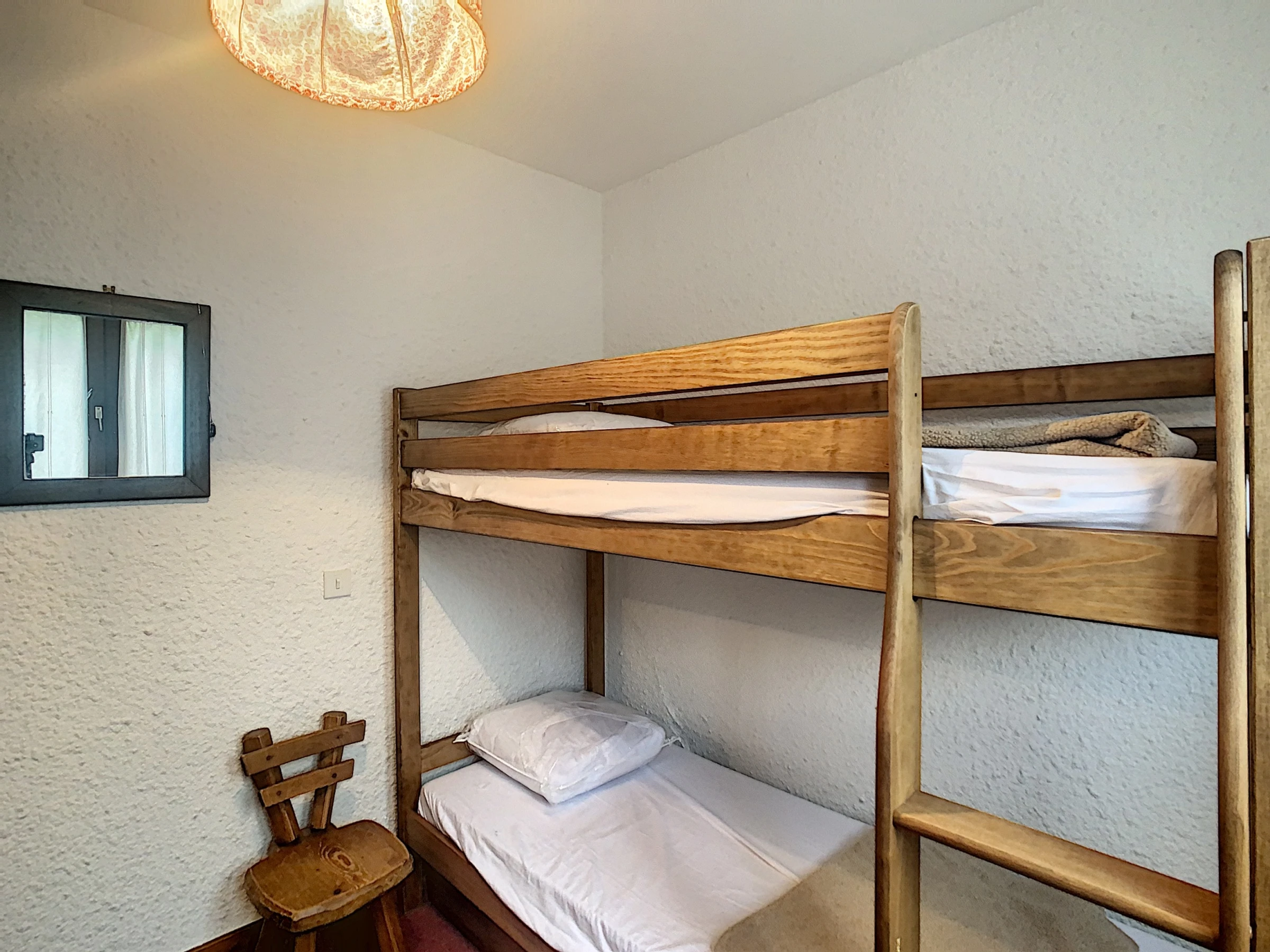 Dans une petite résidence située à 4,5 Km du centre de Combloux, dans un endroit calme et champêtre, situé à proximité des pistes de ski, 3 pièces au 1er étage d'environ 52 m2 composé d'une entrée, WC avec lave mains, salle de bains avec baignoire et LL, séjour avec cheminée, convertible 2 personnes, balcon d'angle exposé Est - Sud Ouest avec vue Mont Blanc. Petite cuisine équipée (four, plaques électriques, frigo et lave vaisselle). Une chambre avec lit double et balcon, une chambre avec 2 lits superposés + 1 lit tiroir. Pas d'animaux. Parking couvert n° 635. Casiers à skis.