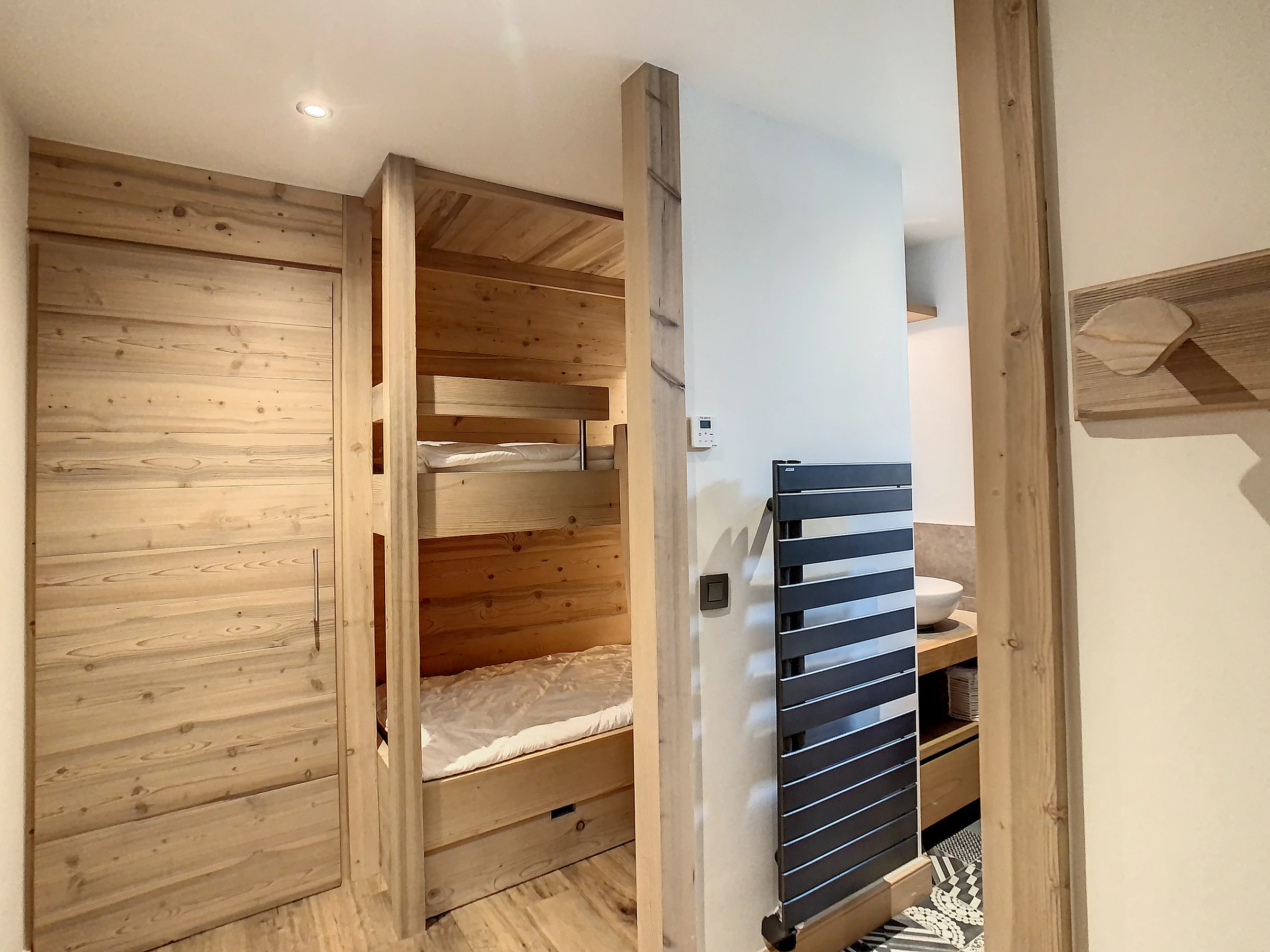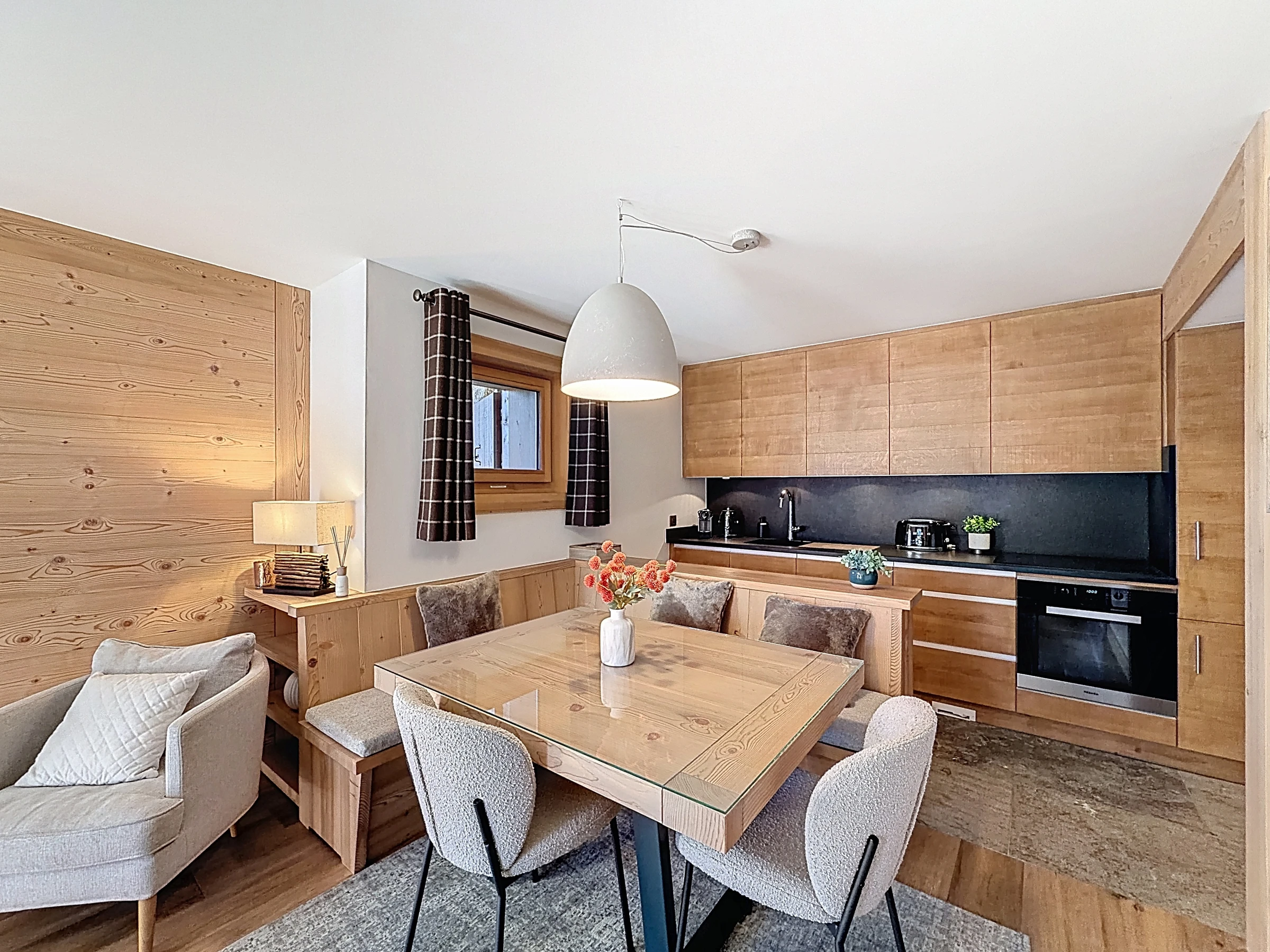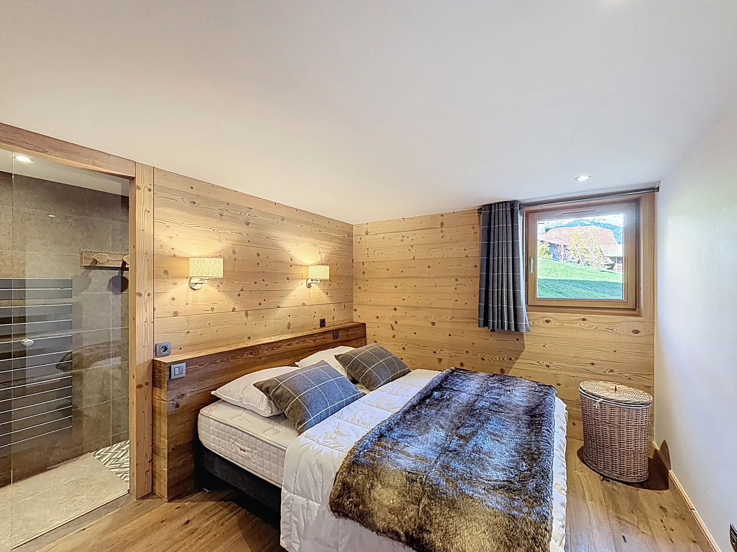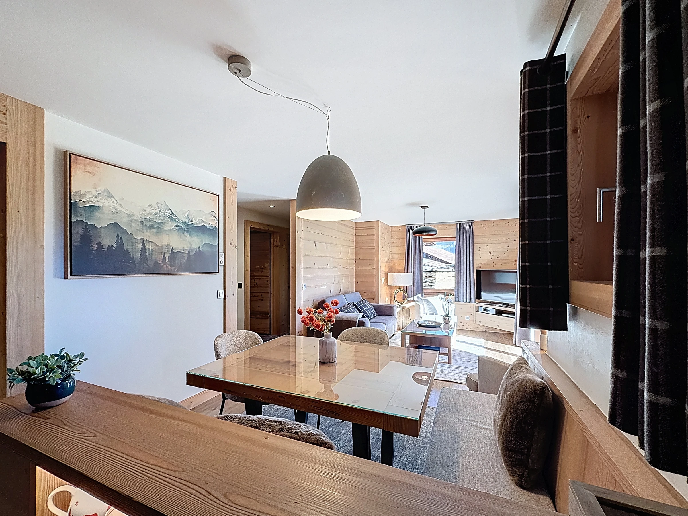 Situé à 3 km du centre village de Combloux, appartement 4 pièces neuf en rez de jardin de 63 m2 dans un chalet de 2 appartements, composé de : D’une entrée avec wc et lave main, d’une chambre avec 1 lit double (140) et sa salle de douche, d’une deuxième chambre avec 1 lit double (160) et sa salle de douche, d’un espace cabine avec 2 lits superposés (90) et sa salle de bain. D’un bel espace séjour-salle à manger et cuisine entièrement équipée donnant sur une belle terrasse bénéficiant d’une vue imprenable sur le Mont Blanc. Appartement avec une décoration raffinée et des prestations modernes et exceptionnelles !
