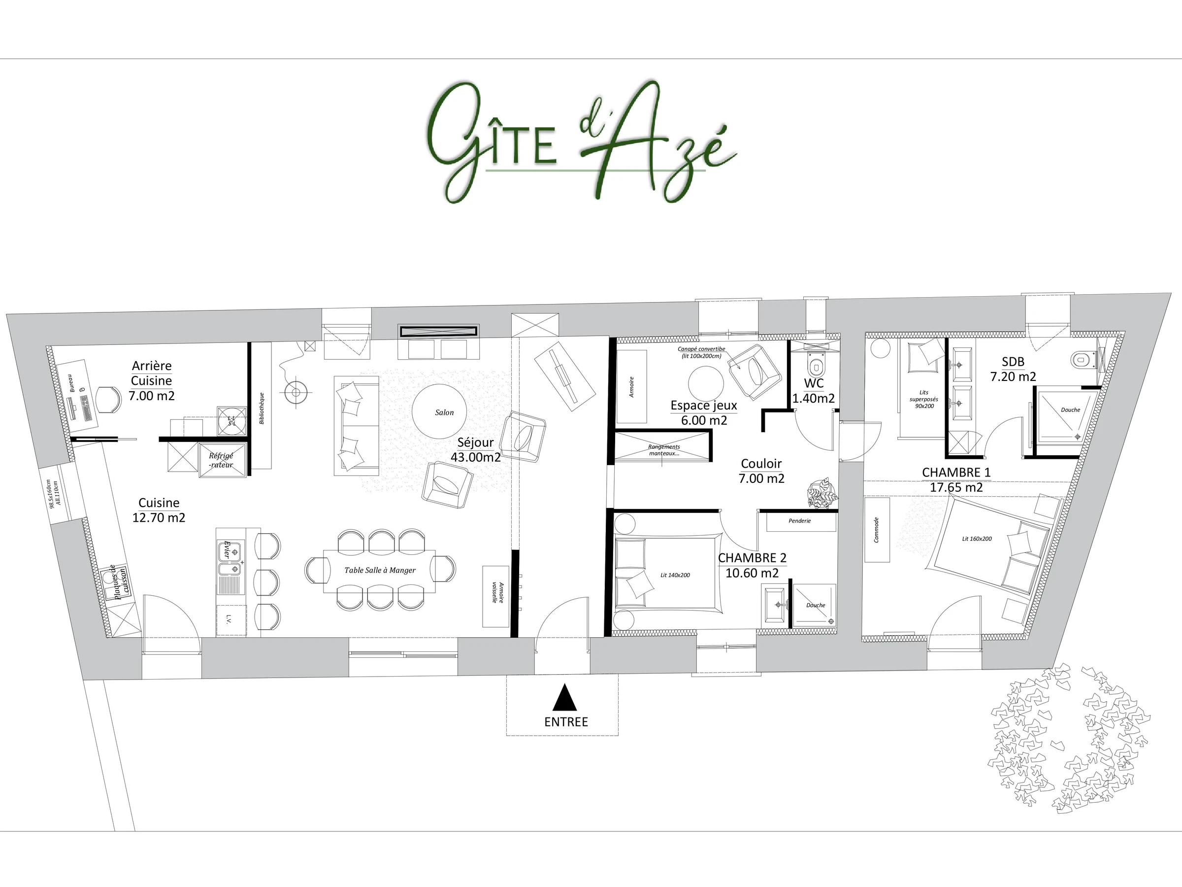 L'espace nuit, soigneusement séparé de la pièce principale pour préserver calme et intimité, se compose de deux chambres, chacune avec sa salle d'eau privative. La première chambre dispose d'un lit 140x190 cm et de sa salle d'eau attenante. Un WC indépendant ainsi qu'un agréable coin lecture viennent enrichir le couloir desservant les chambres. La seconde chambre, pensée pour accueillir petits et grands, propose un lit superposé ainsi qu'un lit 160x200 cm, une grande salle d'eau, et bénéficie d'un accès direct vers l'extérieur.