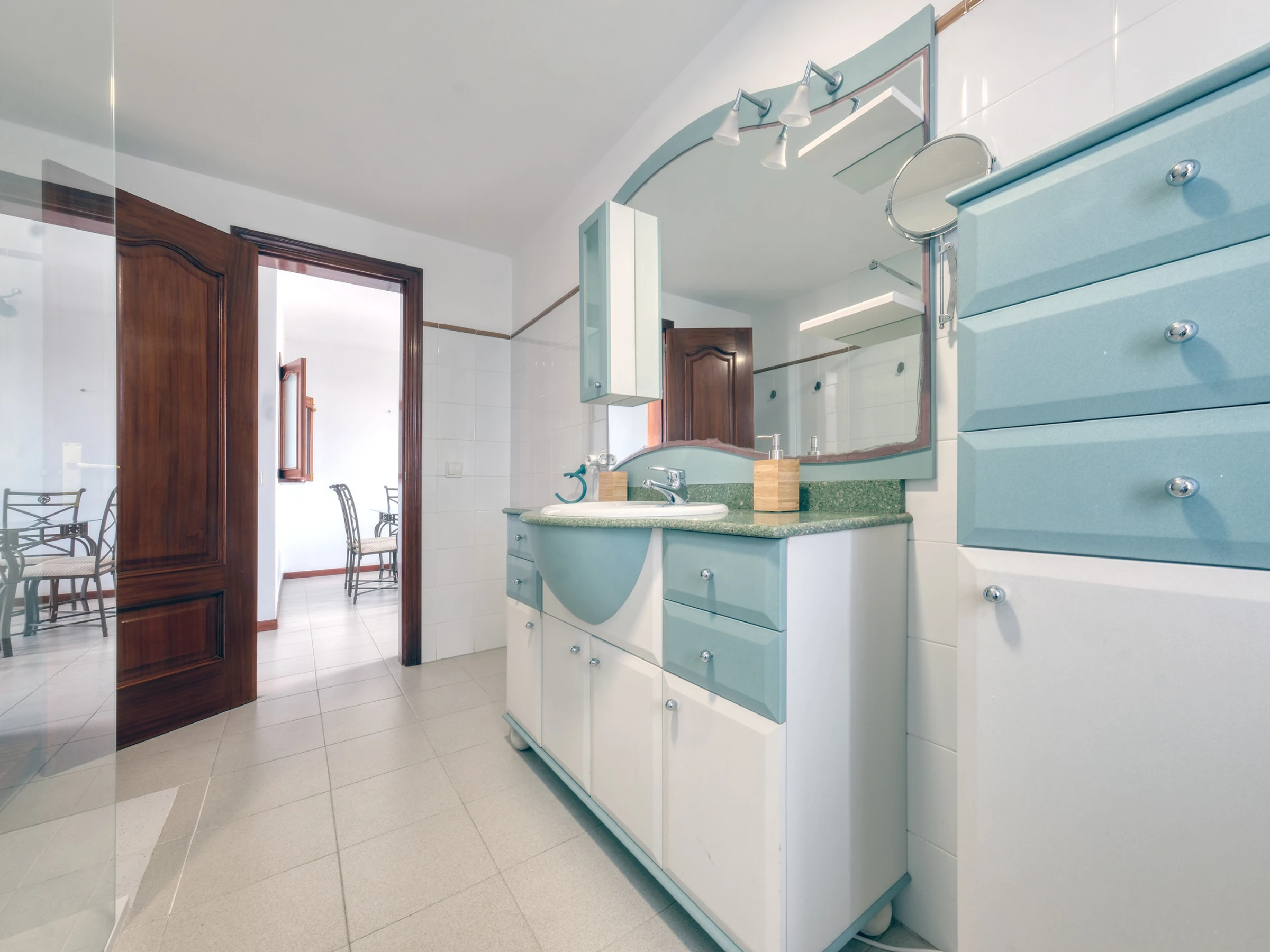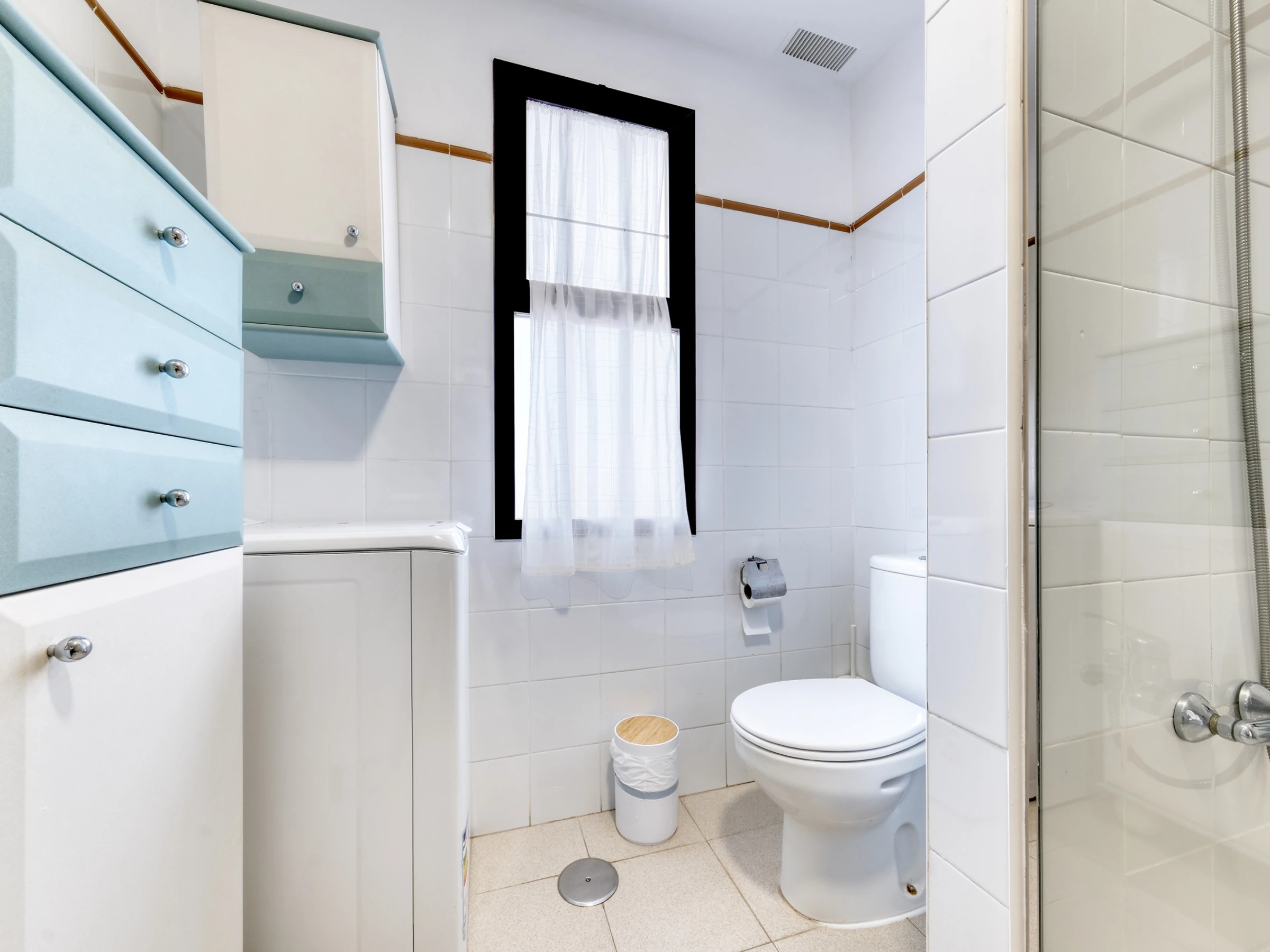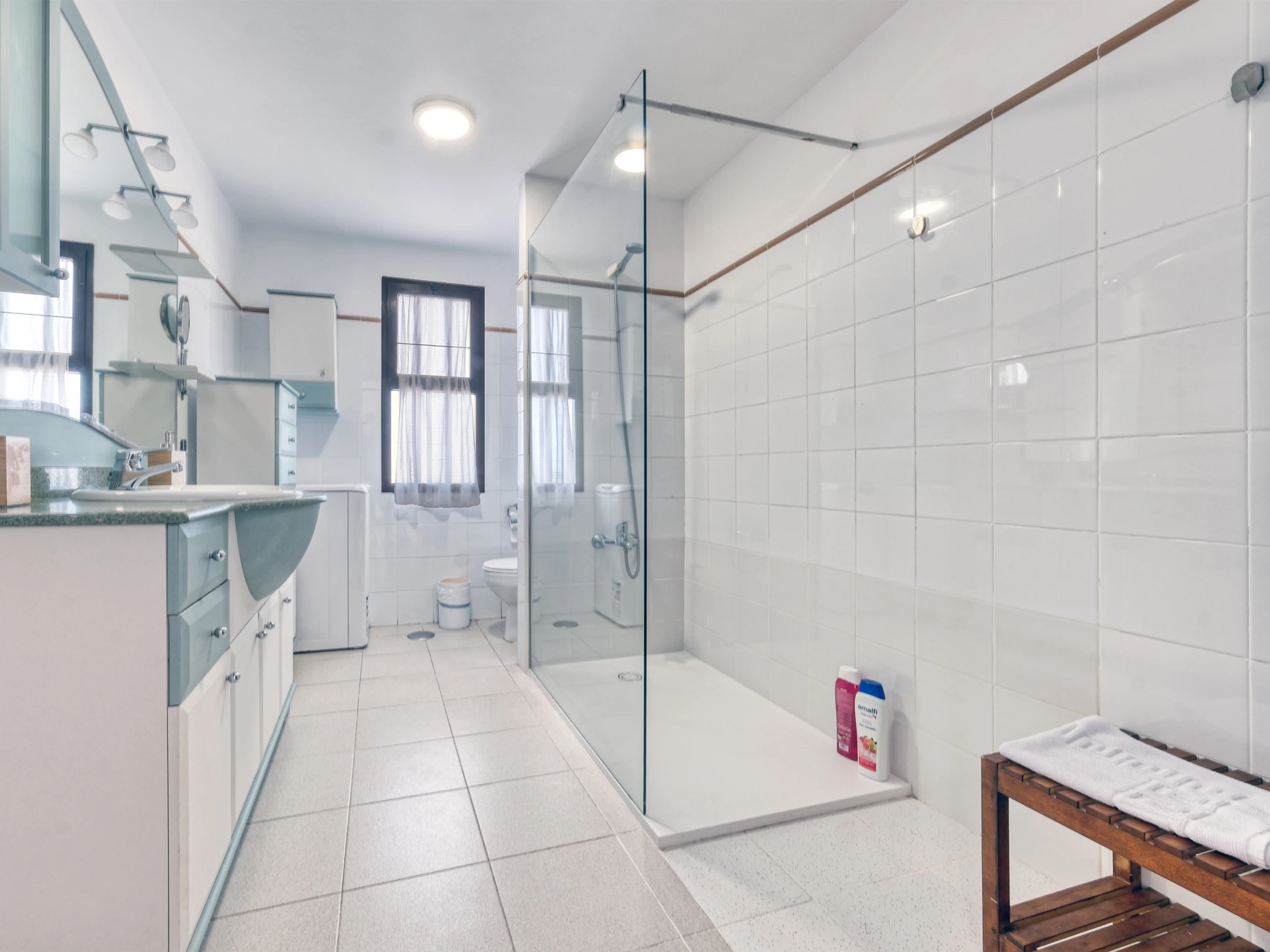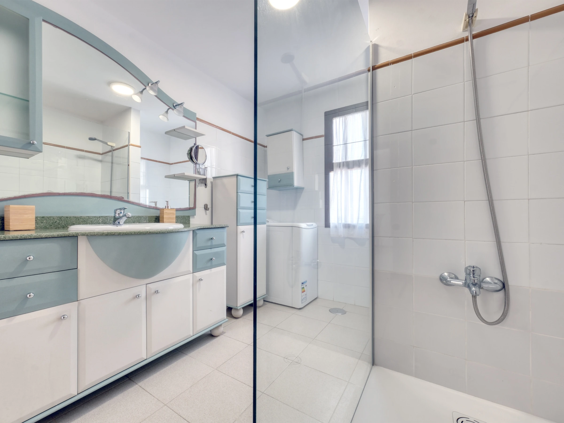 Il dispose de deux chambres, une principale avec un lit de mariage et un dressing, et une seconde avec deux lits individuels, idéale pour les familles ou les groupes d'amis. La salle de bain dispose d'une douche et d'un lave-linge, ainsi que d'un sèche-cheveux. Un fer à repasser et une planche à repasser sont également fournis pour plus de confort pendant le séjour.