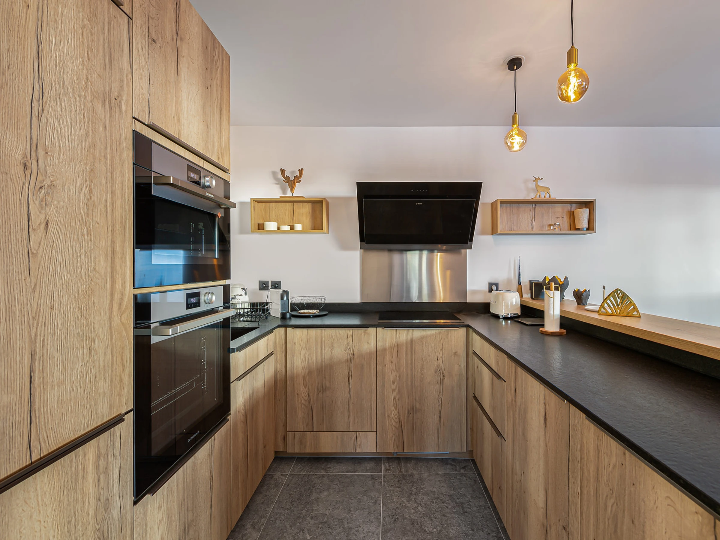 - Cuisine ouverte entièrement équipée:frigo-congélateur, four, micro-onde, lave vaisselle, hotte, grille pain, bouilloire, cafetières filtre et Nespresso, appareils à raclette et à fondue