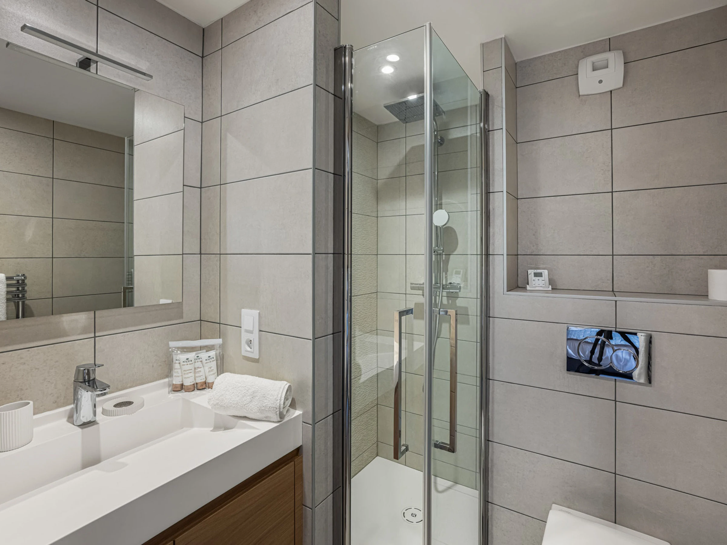- Chambre 1 en suite : lit double (160*200), salle de douche, sèche serviette, toilette, simple vasque