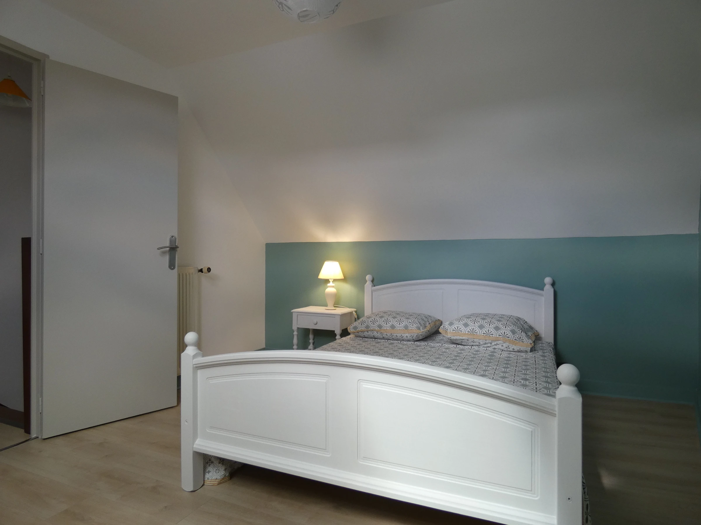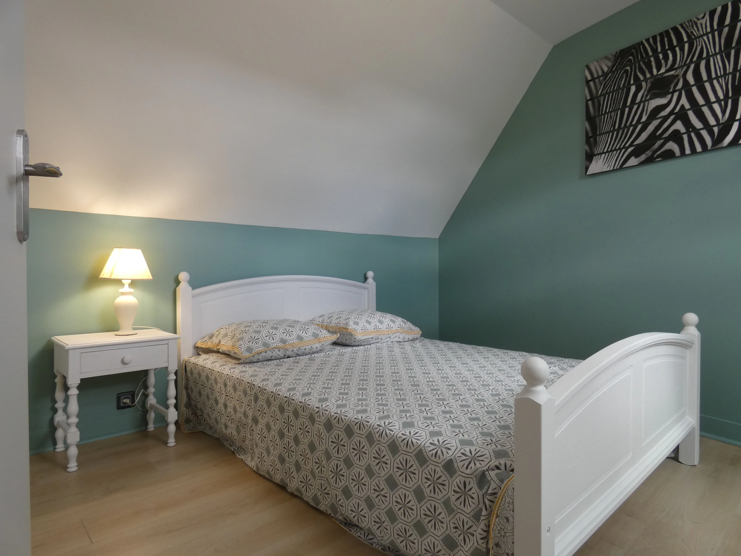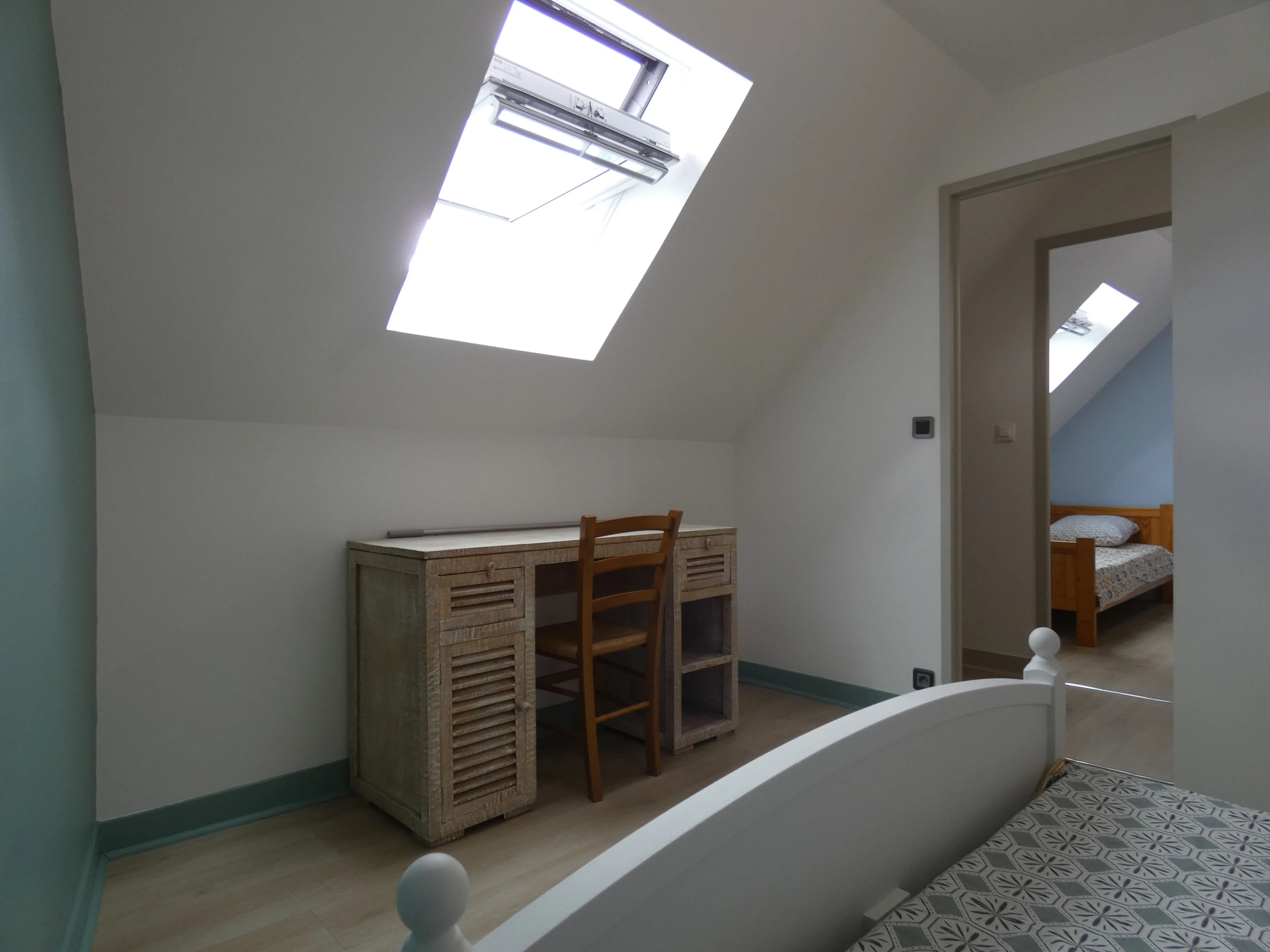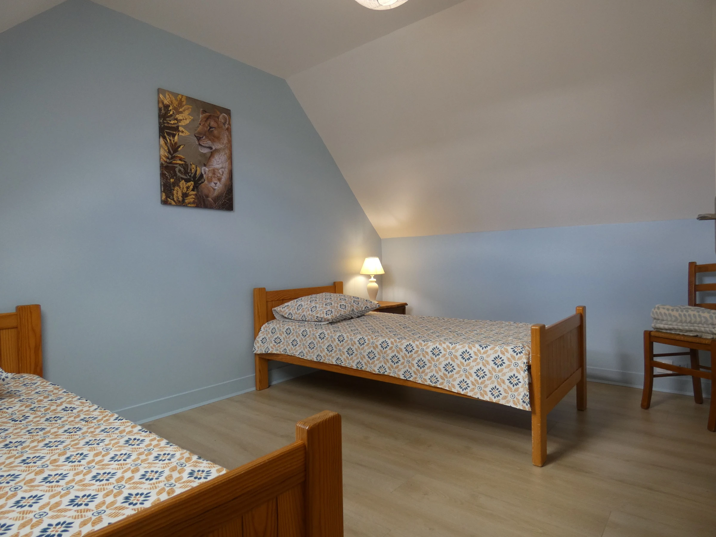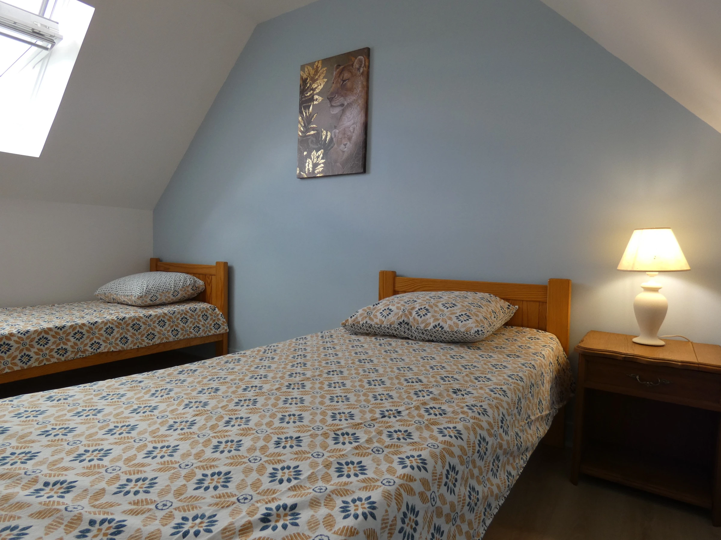 Il y a 2 chambres à l'étage : 1 chambre avec un lit de 140cm et 1 chambre avec 2 lits de 90cm.