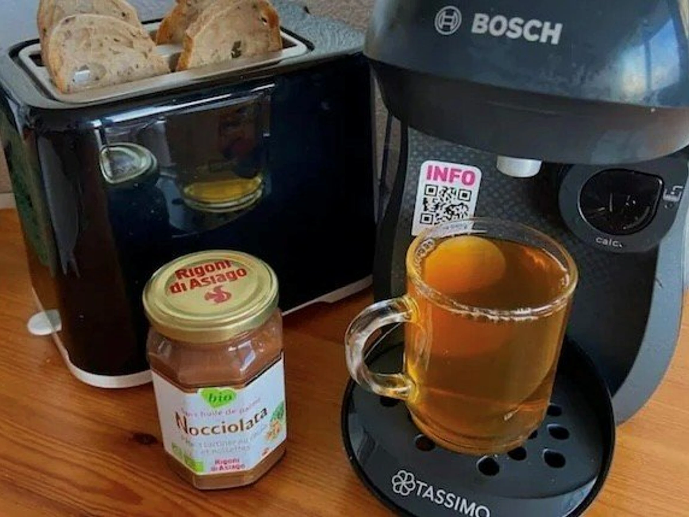 Kitchenette équipée : mini-four, cafetière électrique, réfrigérateur.