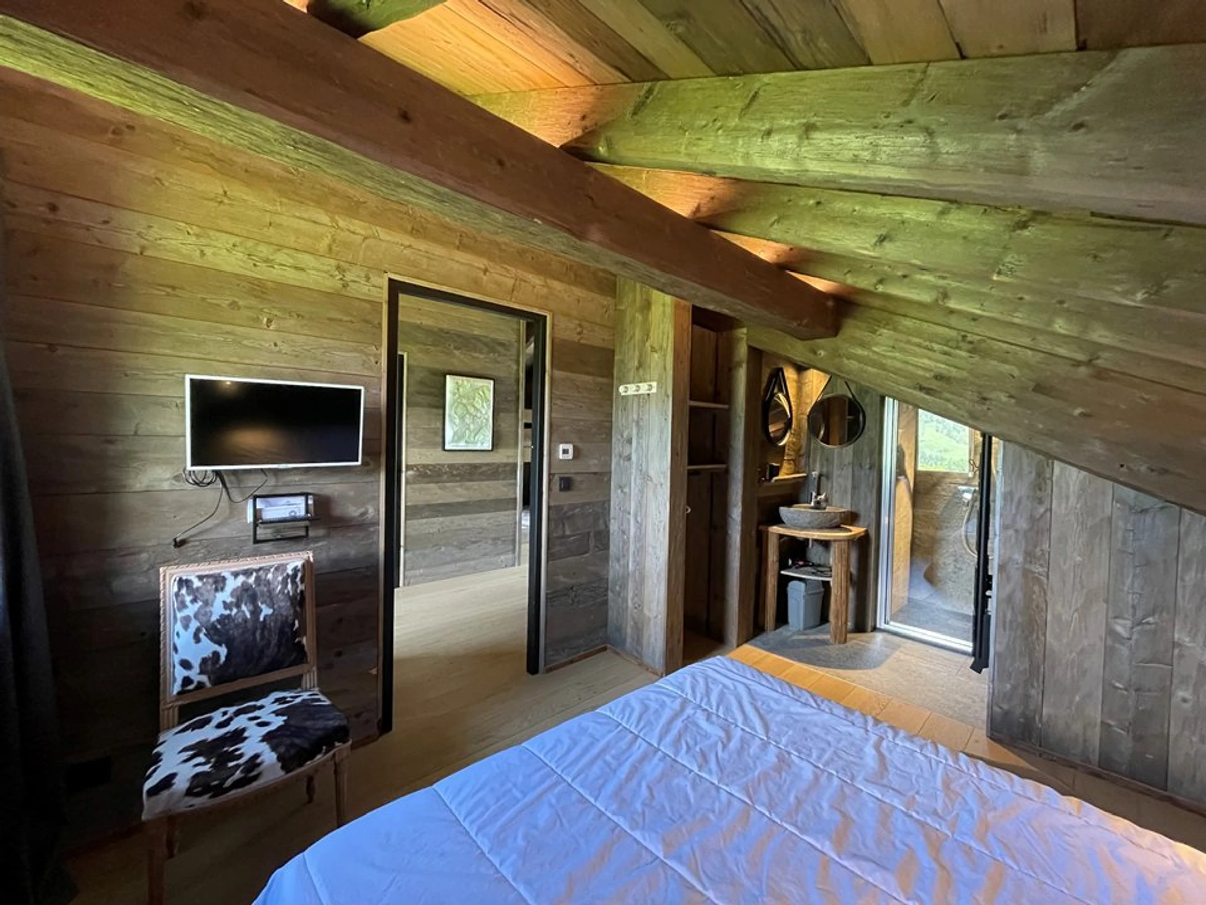 1 grande pièce à vivre avec espace salon, salle à manger, cheminée avec insert (bois fourni) et cuisine équipée (four, micro-ondes, réfrigérateur, congélateur, lave-vaisselle, plaques,...)