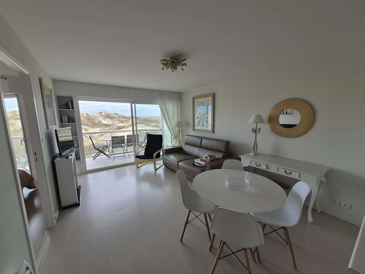 Bel appartement à la décoration soignée de type 2 cabine, dans un immeuble de standing - comprenant 1 chambre avec rangement, un coin cabine avec 1 lit simple, une salle de bains avec baignoire, lave-linge, un wc indépendant, un séjour lumineux, un coin cuisine entièrement équipée. Un balcon avec une vue dunes et latérale mer. Résidence avec ascenseur, place de parking privative.