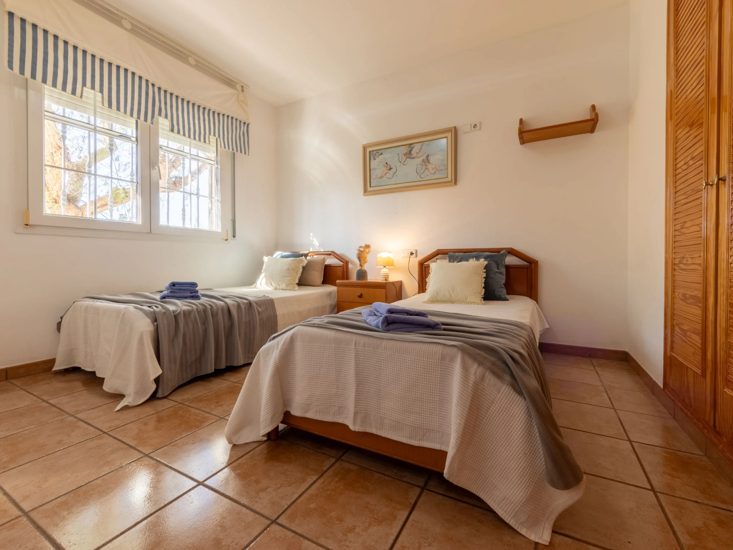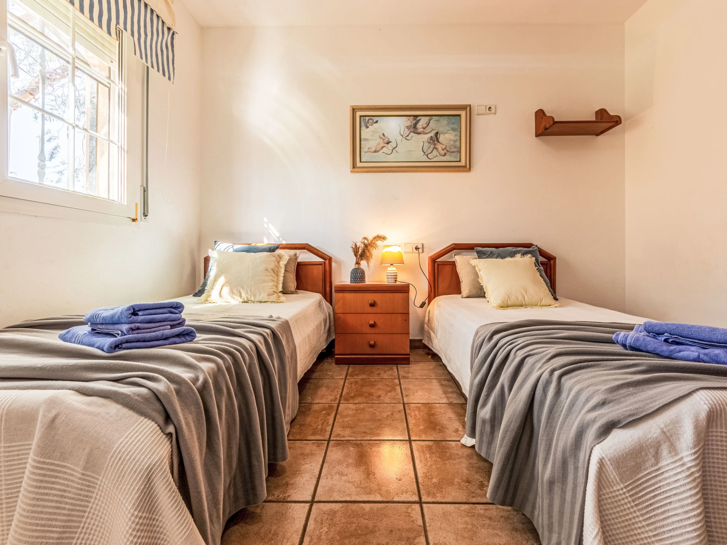 "Primavera", maison 4 pièces 120 m2 sur 2 niveaux. Aménagement confortable et plaisant: séjour/salle à manger avec cheminée (uniquement à titre de décoration), table pour les repas et Télévision numérique. Sortie sur le jardinet, sur la piscine. 1 chambre double avec 2 lits (90 cm, longueur 190 cm). 1 chambre double avec 2 lits (90 cm, longueur 190 cm). Cuisine ouverte (four, lave-vaisselle, 4 plaques vitrocéramiques, grille-pain, micro-ondes, congélateur, cafetière électrique) avec bar. Douche/WC. Air-conditionné, chauffage à air chaud. Chauffage pas dans toutes les pièces. À l'étage supérieur: 1 chambre double avec 1 grand-lit (135 cm, longueur 190 cm), air-conditionné et chauffage à air chaud. Douche/WC. Jardinet. Meubles de terrasse, barbecue, chaises longues, loggia. Vue sur la piscine et le jardin. A disposition: lave-linge, fer à repasser, moustiquaire, sèche-cheveux. Internet (Connexion WIFI, gratuit). Place de parking (cloturée). Adapté(e) aux familles. Maximum 2 animaux/ chiens autorisés. [hidden] // Reg. Nr.: ESFCTU0000430190002677830000000000000000HUTTE-[hidden]