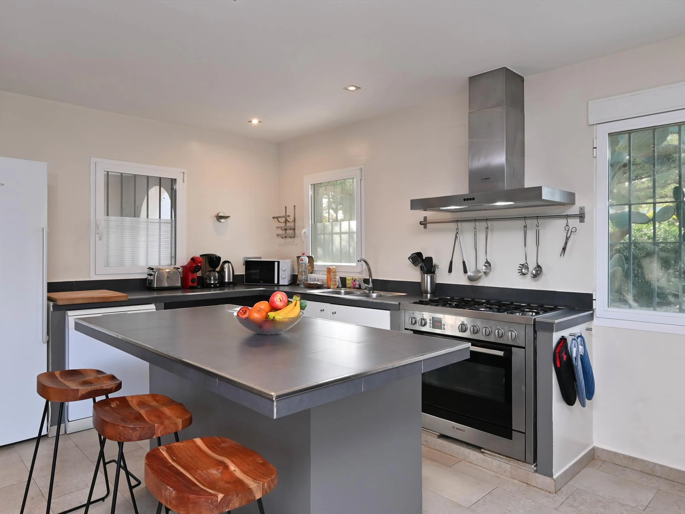 * cuisine avec cuisinière à gaz, four électrique, four à micro-ondes,
