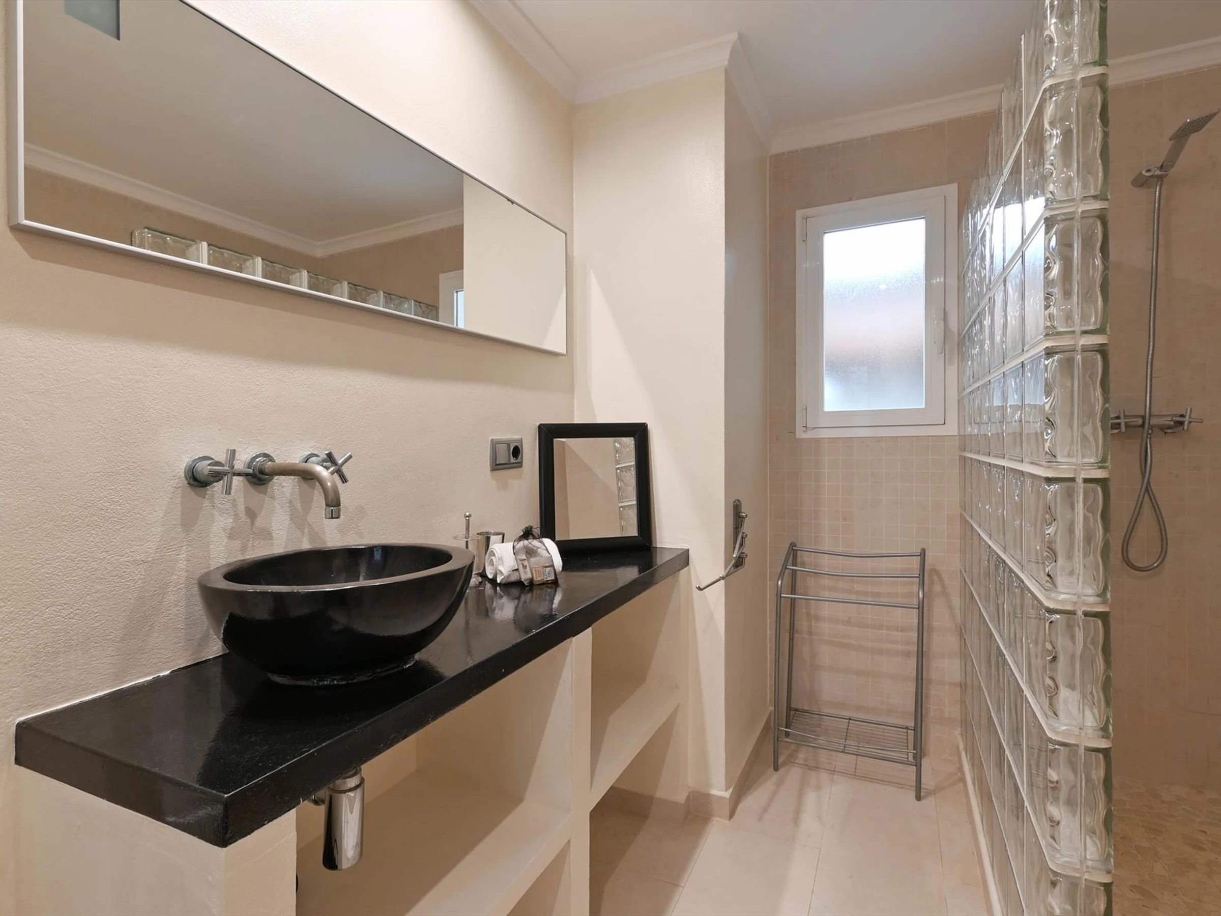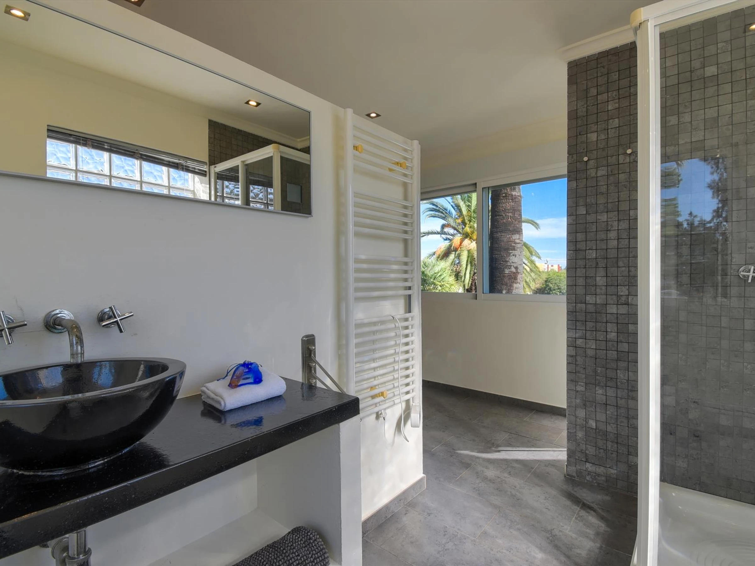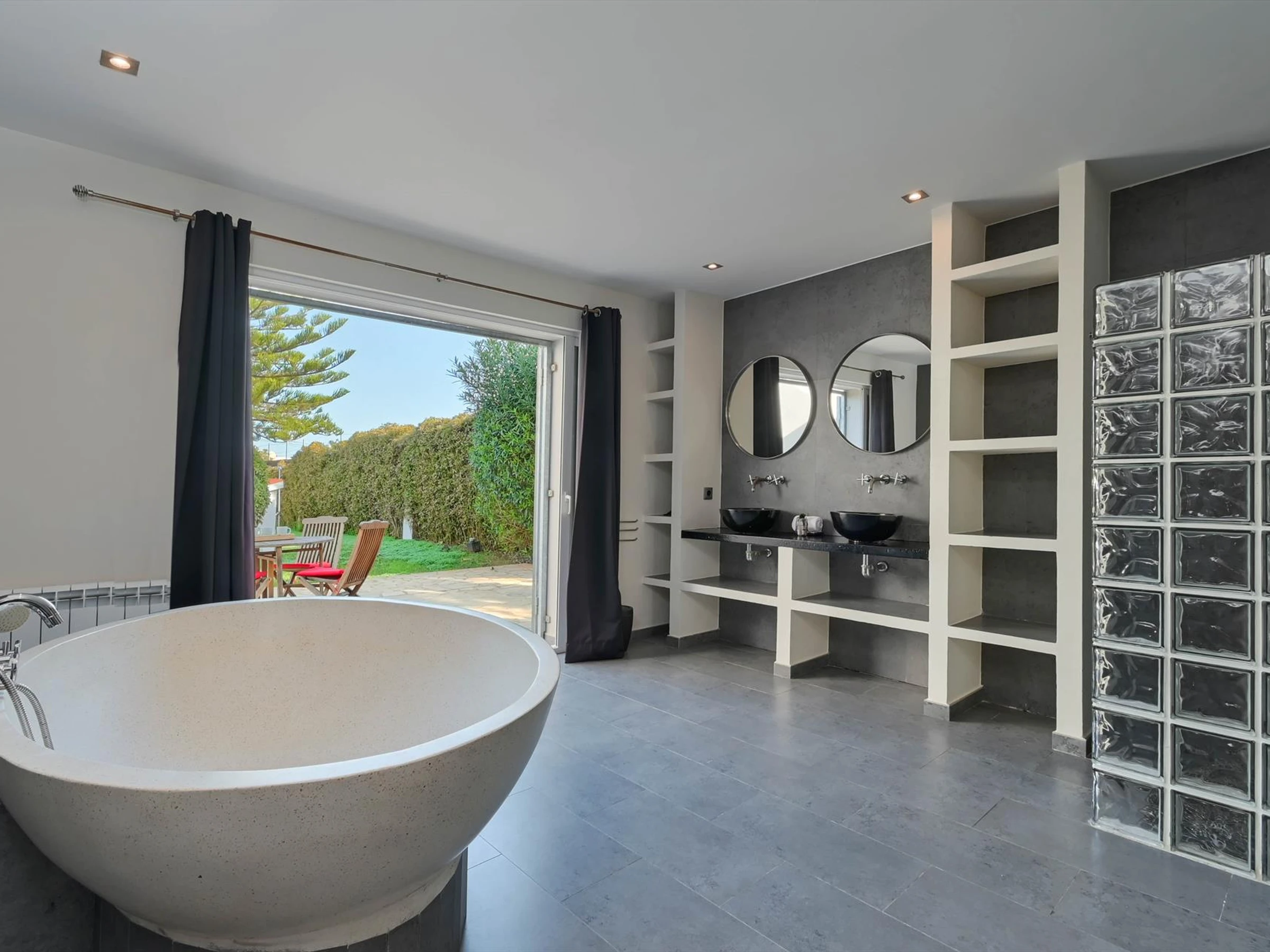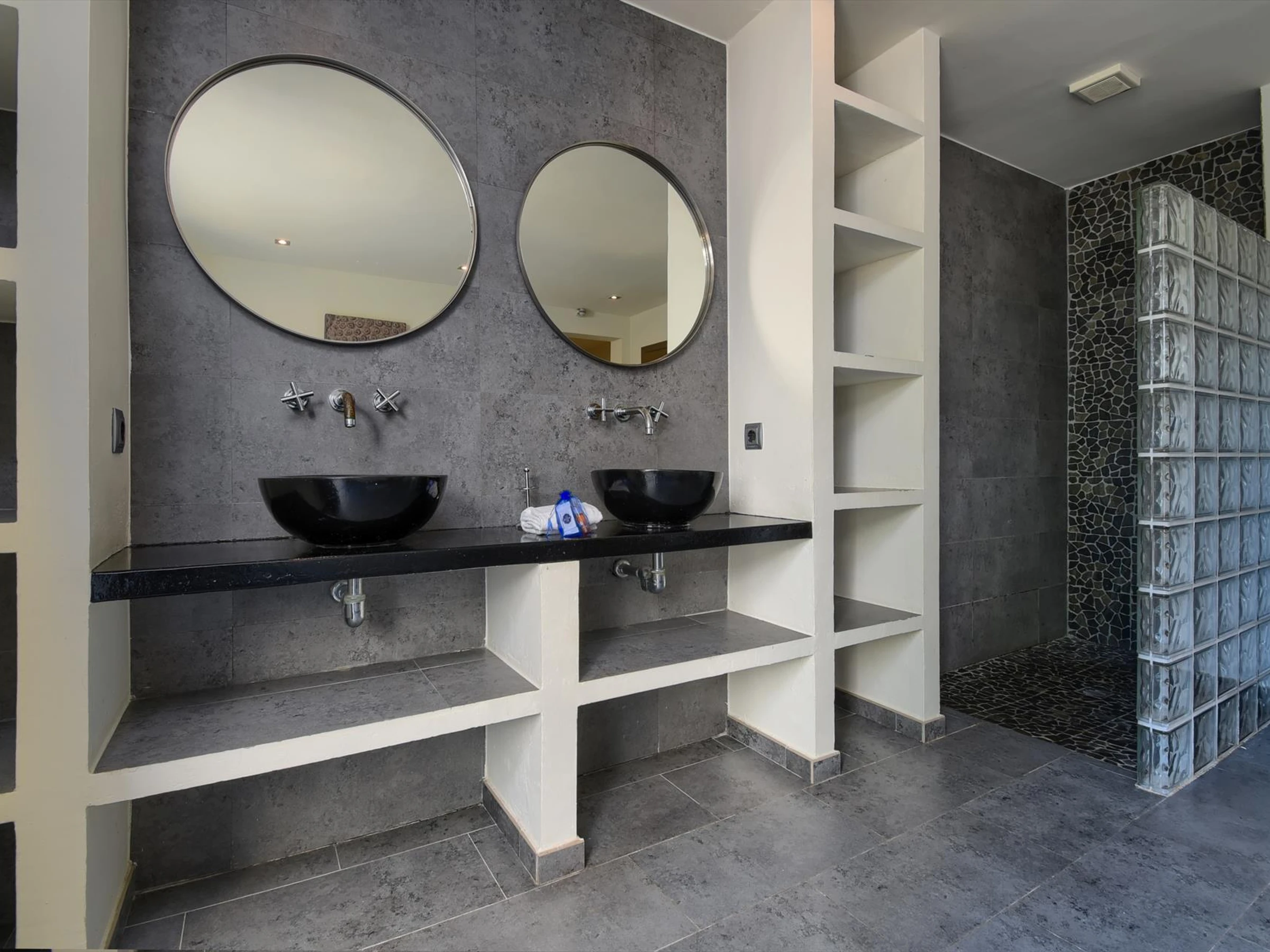 * salle de bain avec double lavabo, douche et toiletteExtérieur de la villa
